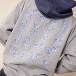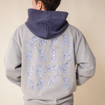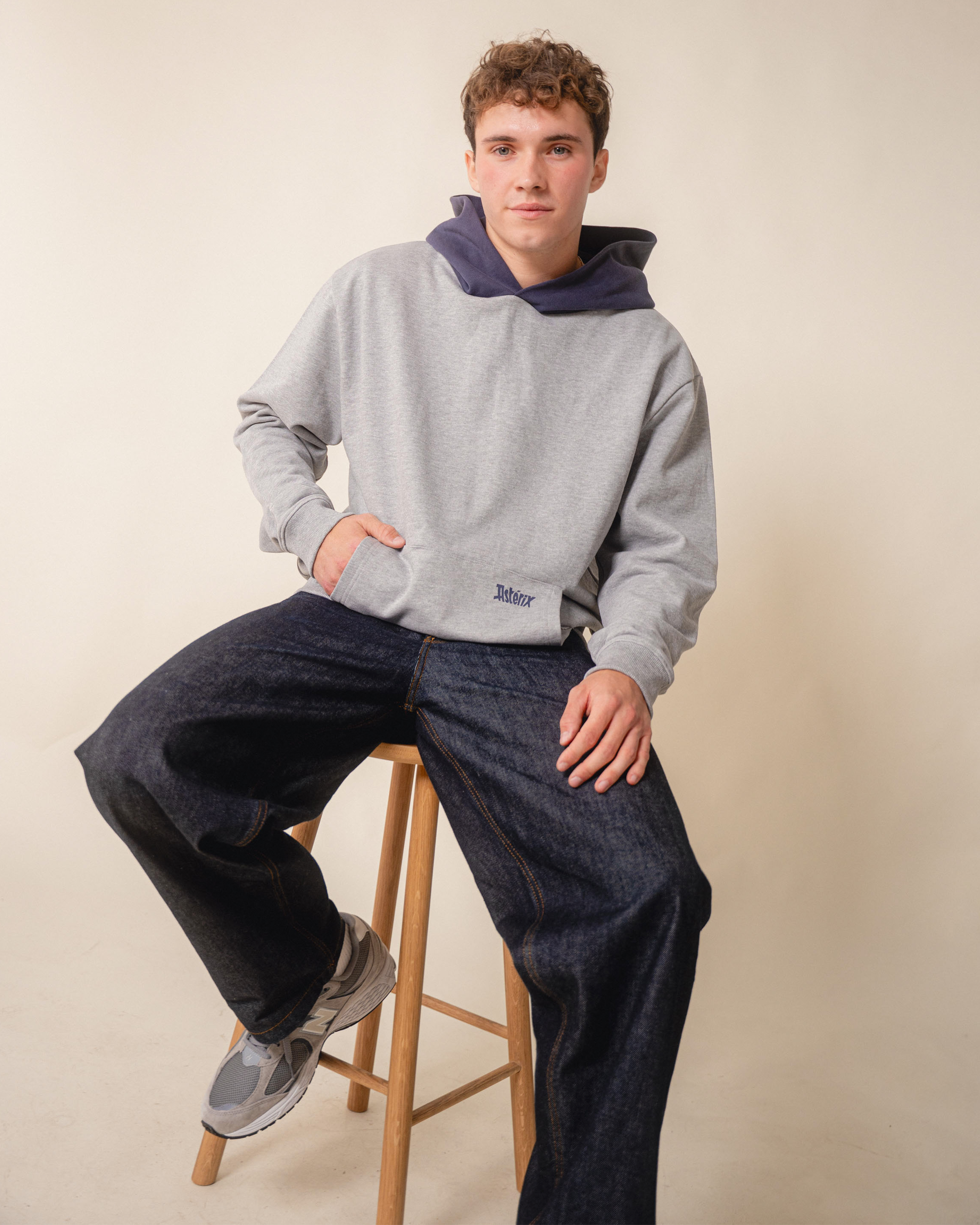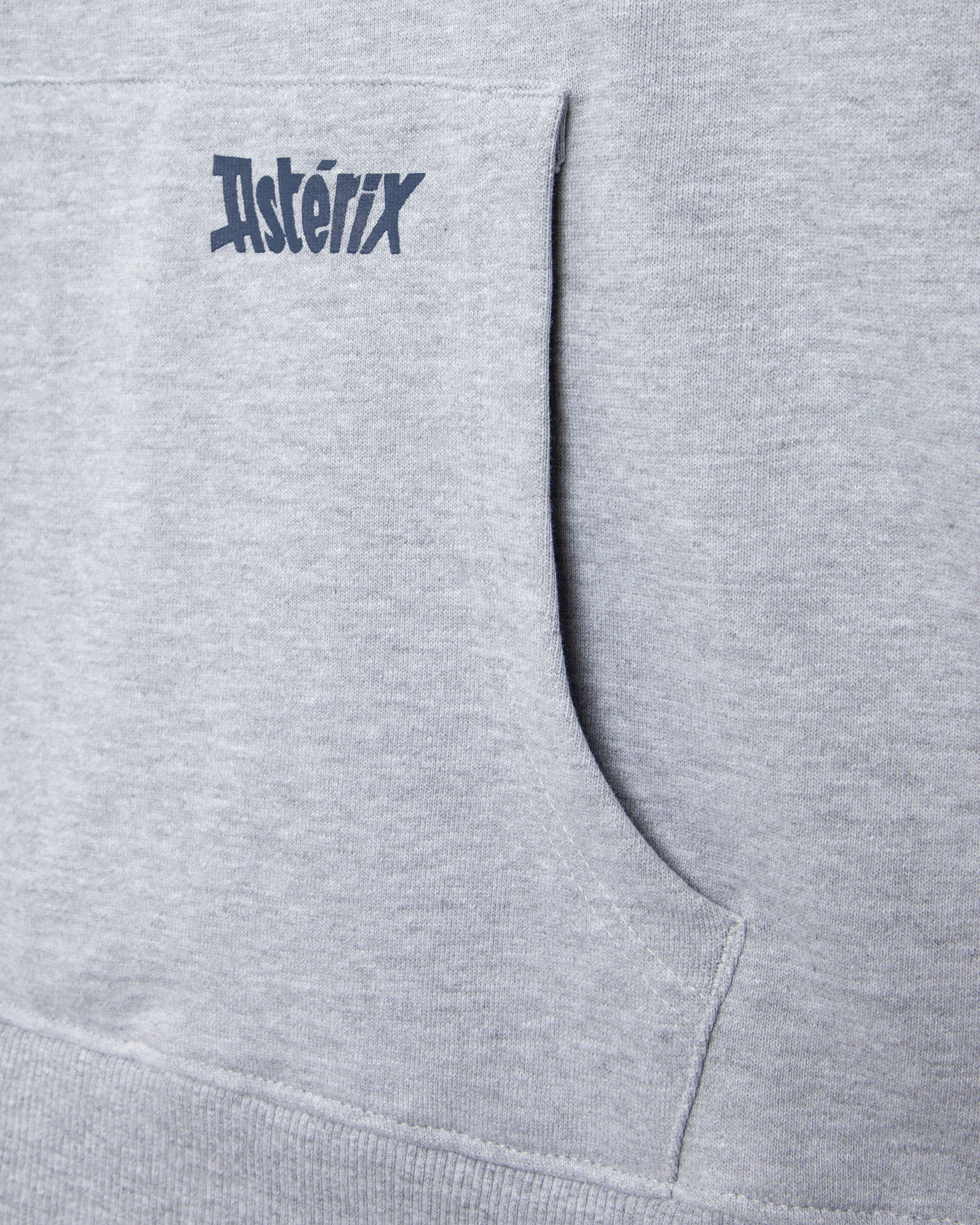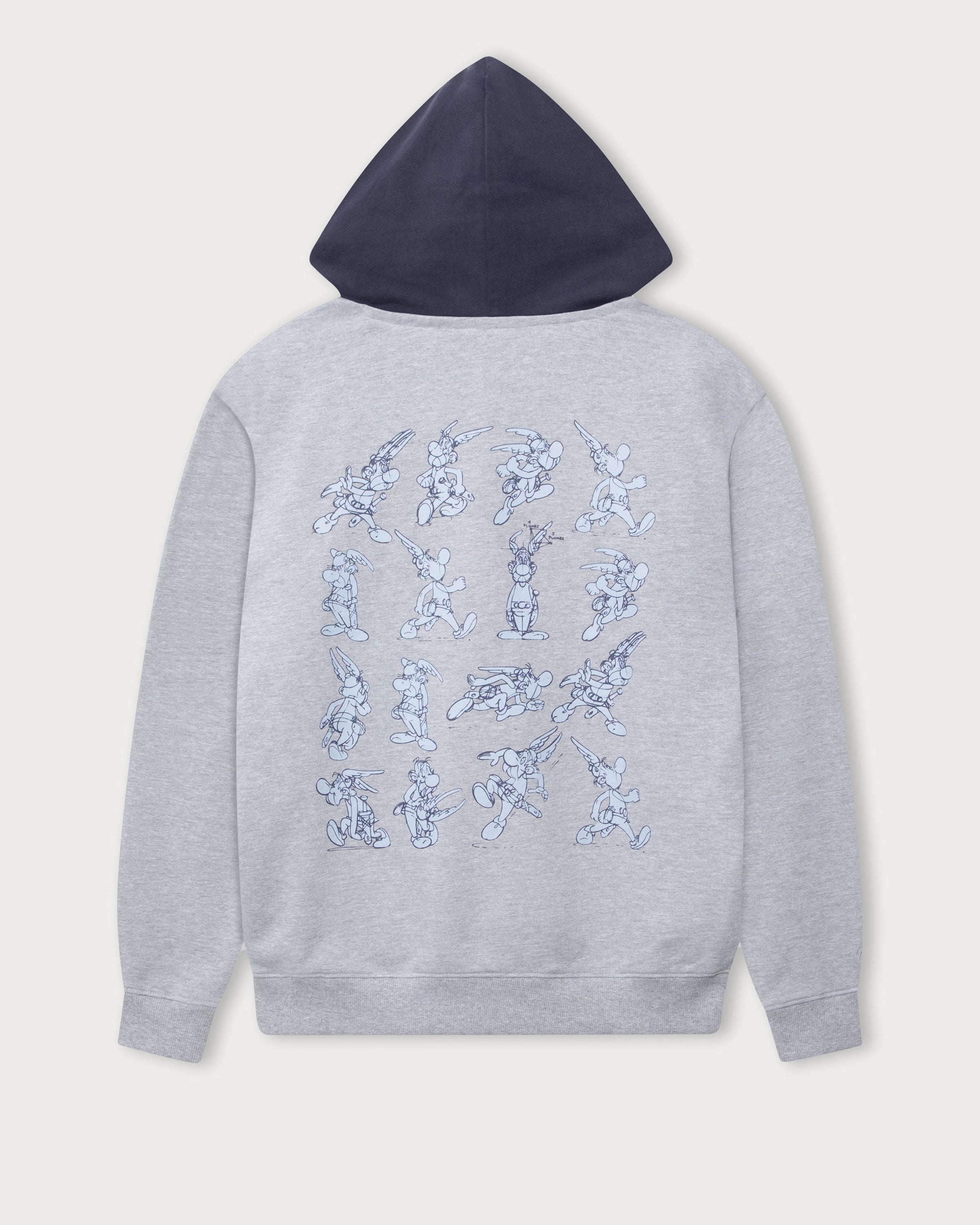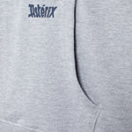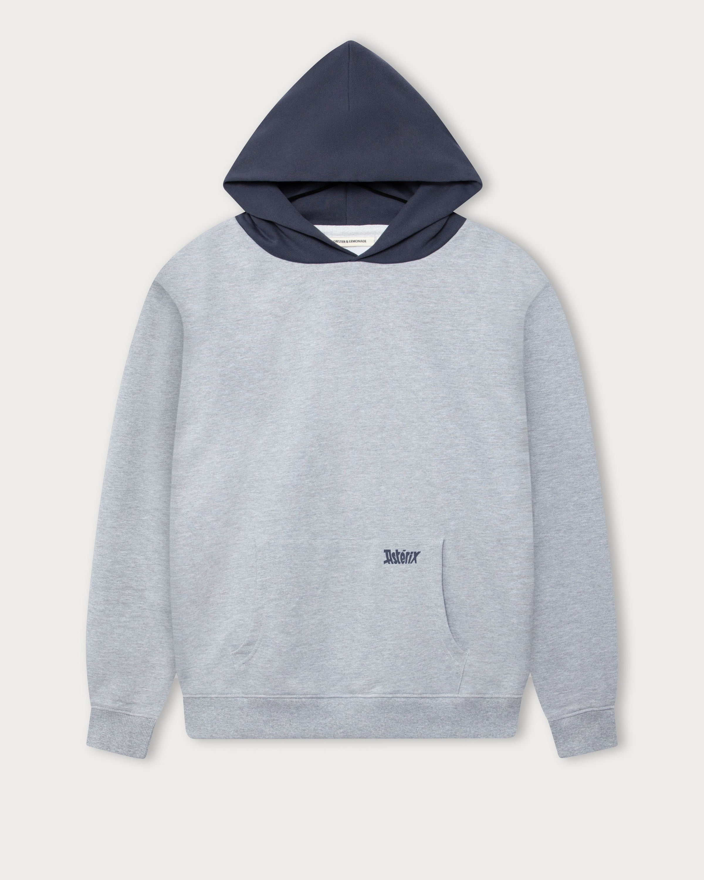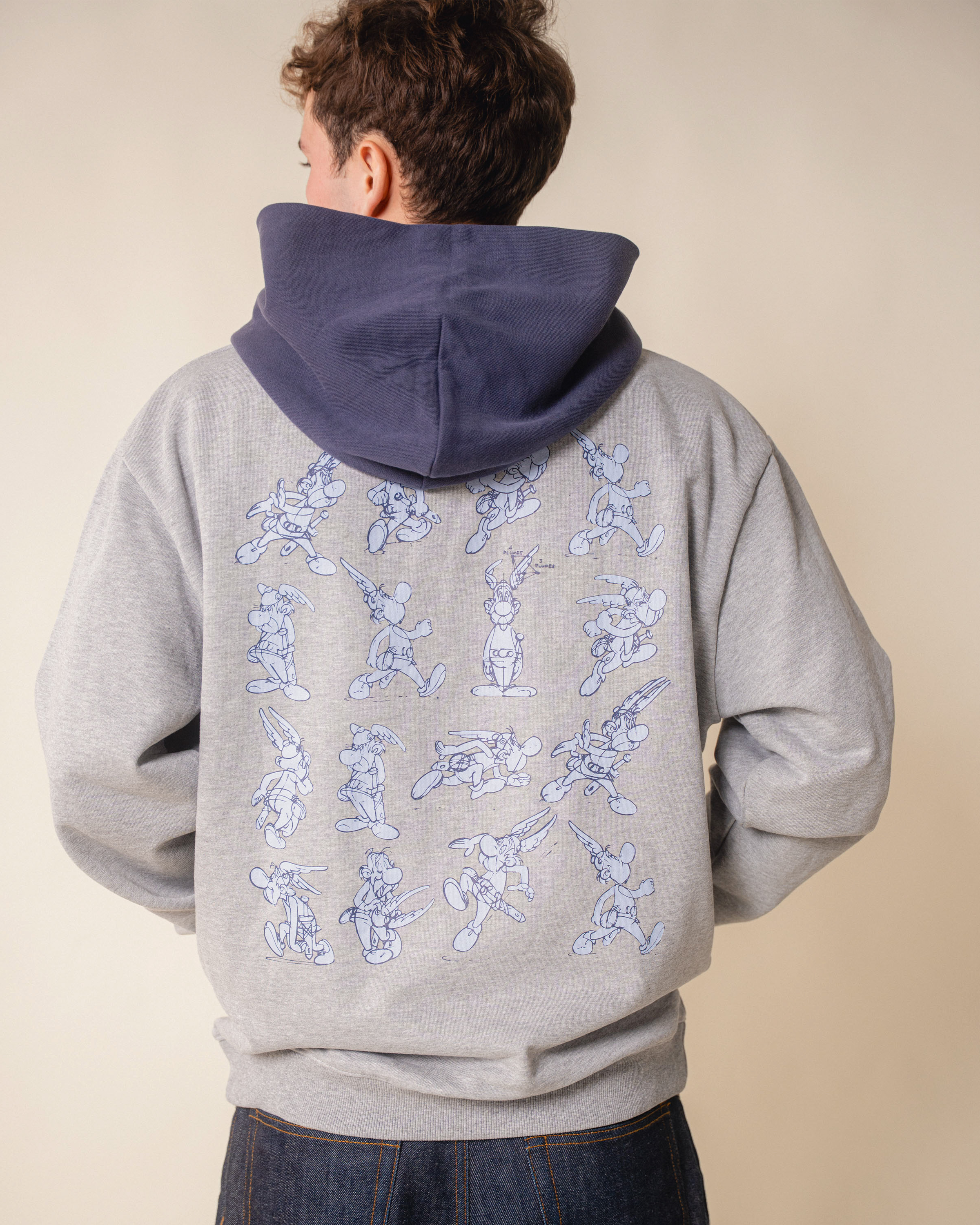 Der zweifarbige Hoodie in Grau mit dunkelblauer Kapuze zeigt als großflächigen Backprint verschiedene Skizzen von Astérix in unterschiedlichen Posen. Der rohe Zeichenstil ist eine Hommage an die Originalentwürfe und fängt den klassischen Comic-Stil perfekt ein.