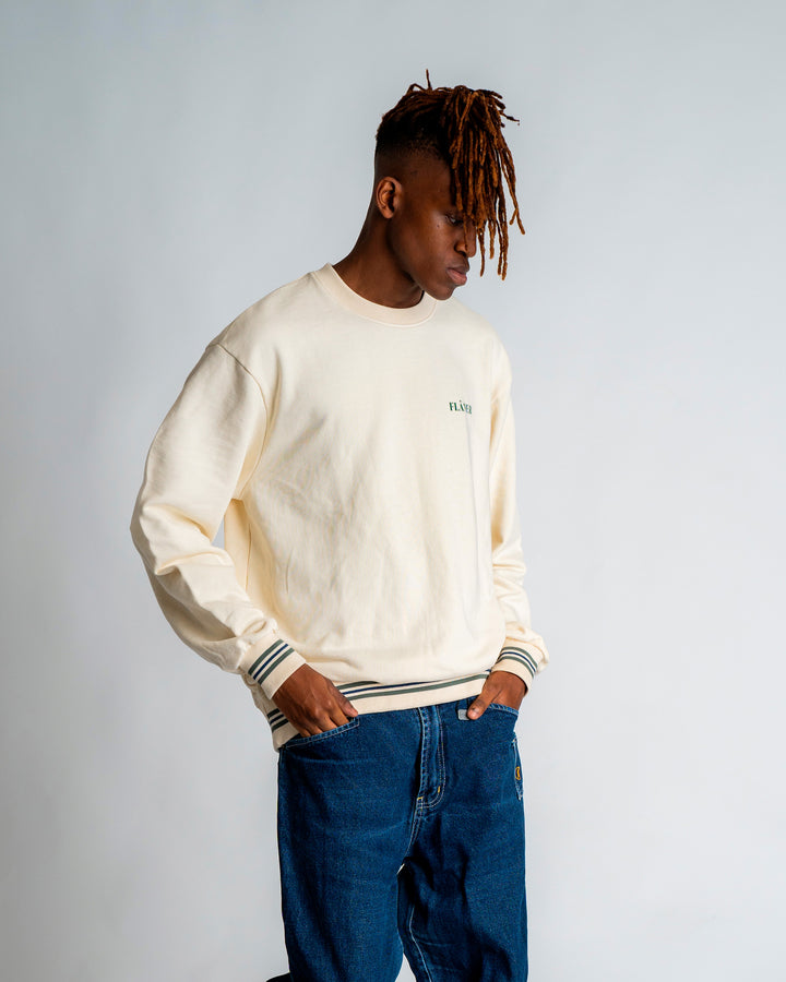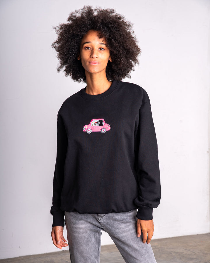 Der kastig geschnittene Pullover ist in zeitlosem ausgewaschenem Schwarz gehalten. Auf der Vorderseite befindet sich ein ovales Glühen, das dem Design einen futuristischen Touch verleiht. Der Schriftzug in kontrastierendem Gelb setzt ein zusätzliches Highlight.