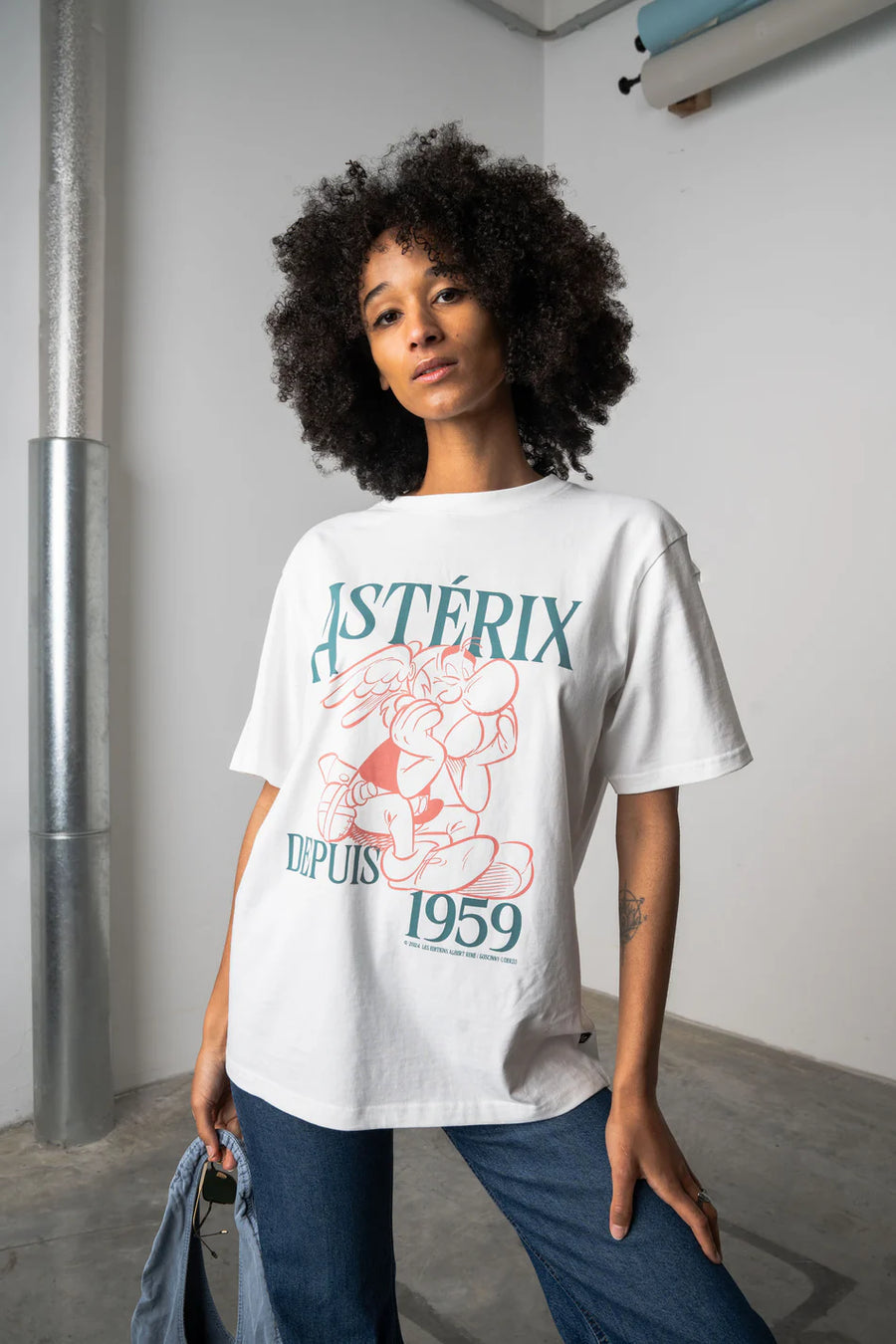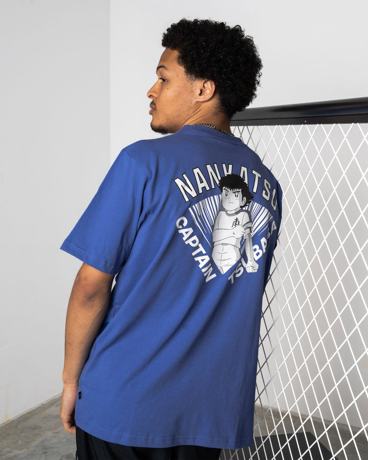 Das blaue T-Shirt in lockerer Passform zeigt einen Quarterback mit Patriots Schriftzug und Logo als kräftigen Frontprint. Janja ist 168cm groß und trägt Größe S.