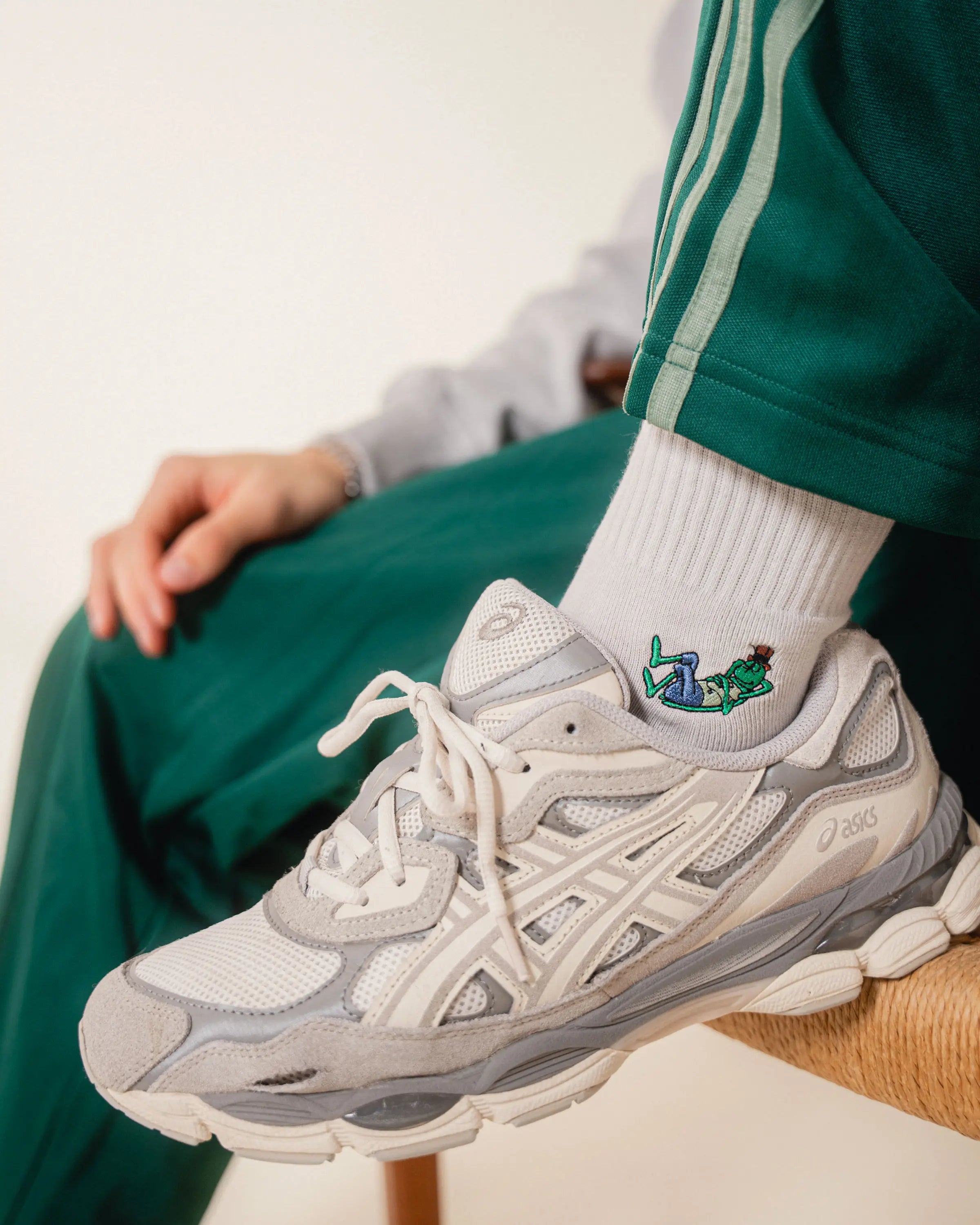 Die Sportsocke in hellem Taupe zeigt Flip in entspannter Pose, oberhalb des Knöchels als Stick veredelt. Der Stick ist so platziert, dass Flip beim Tragen direkt auf dem Sneaker zu liegen scheint.