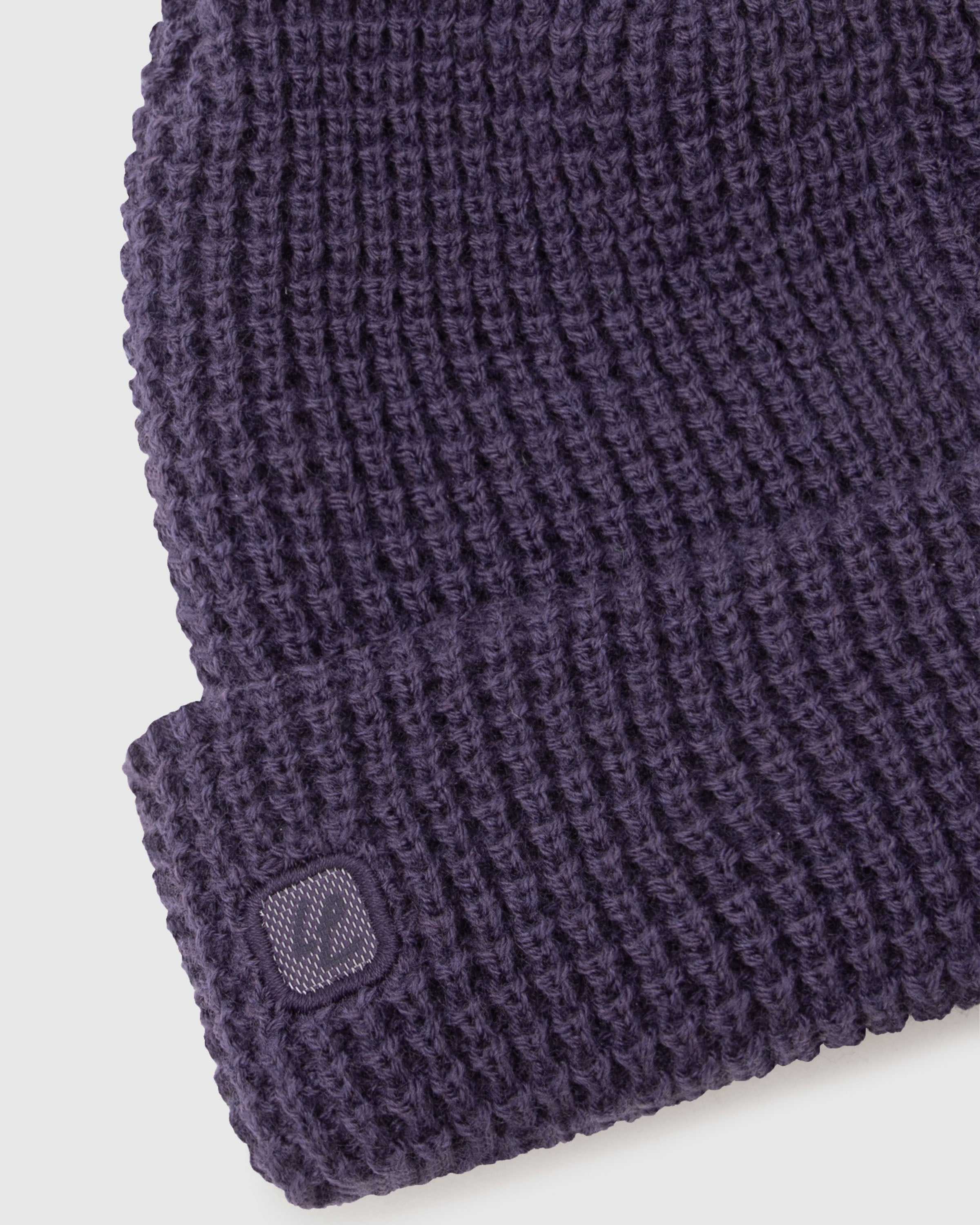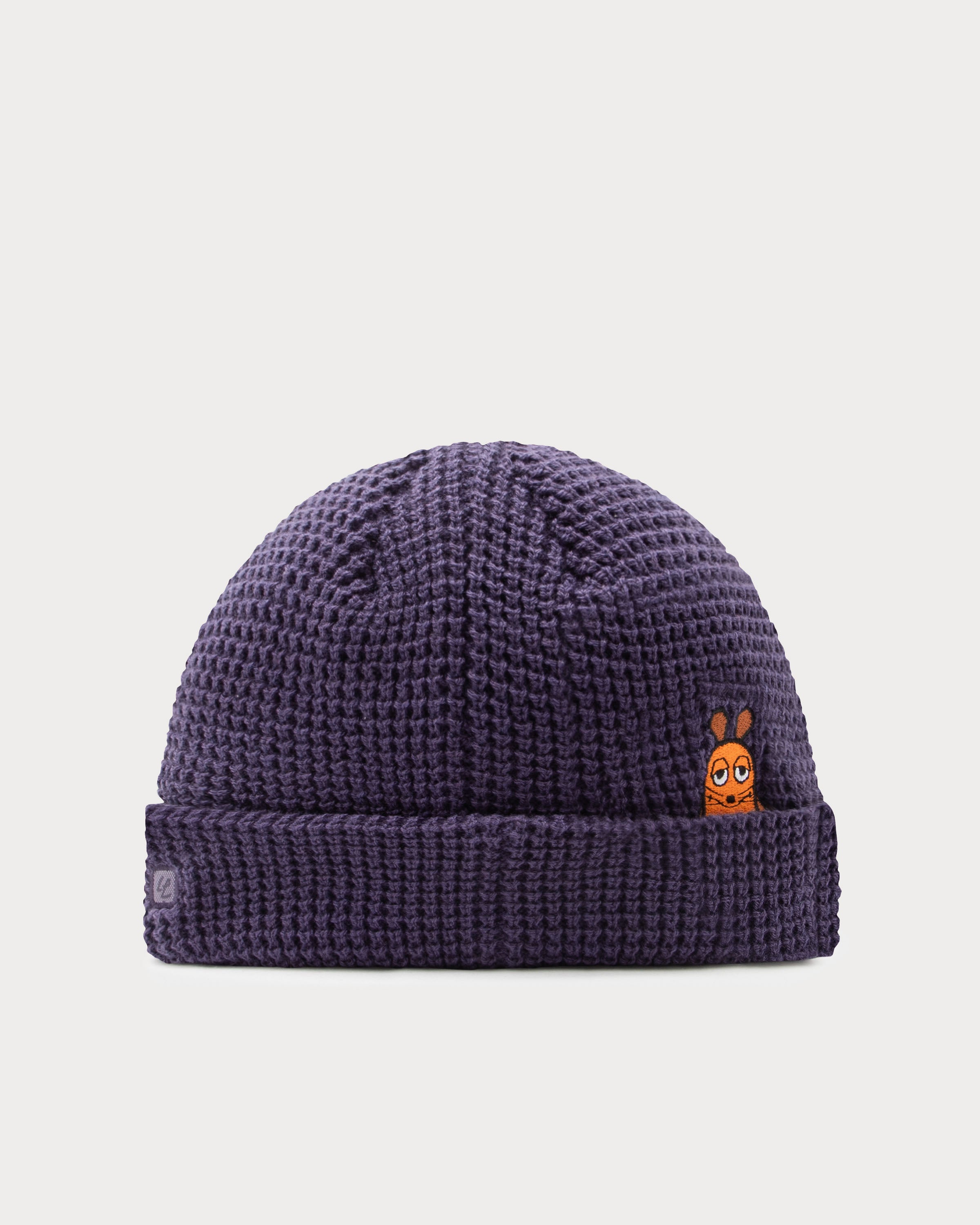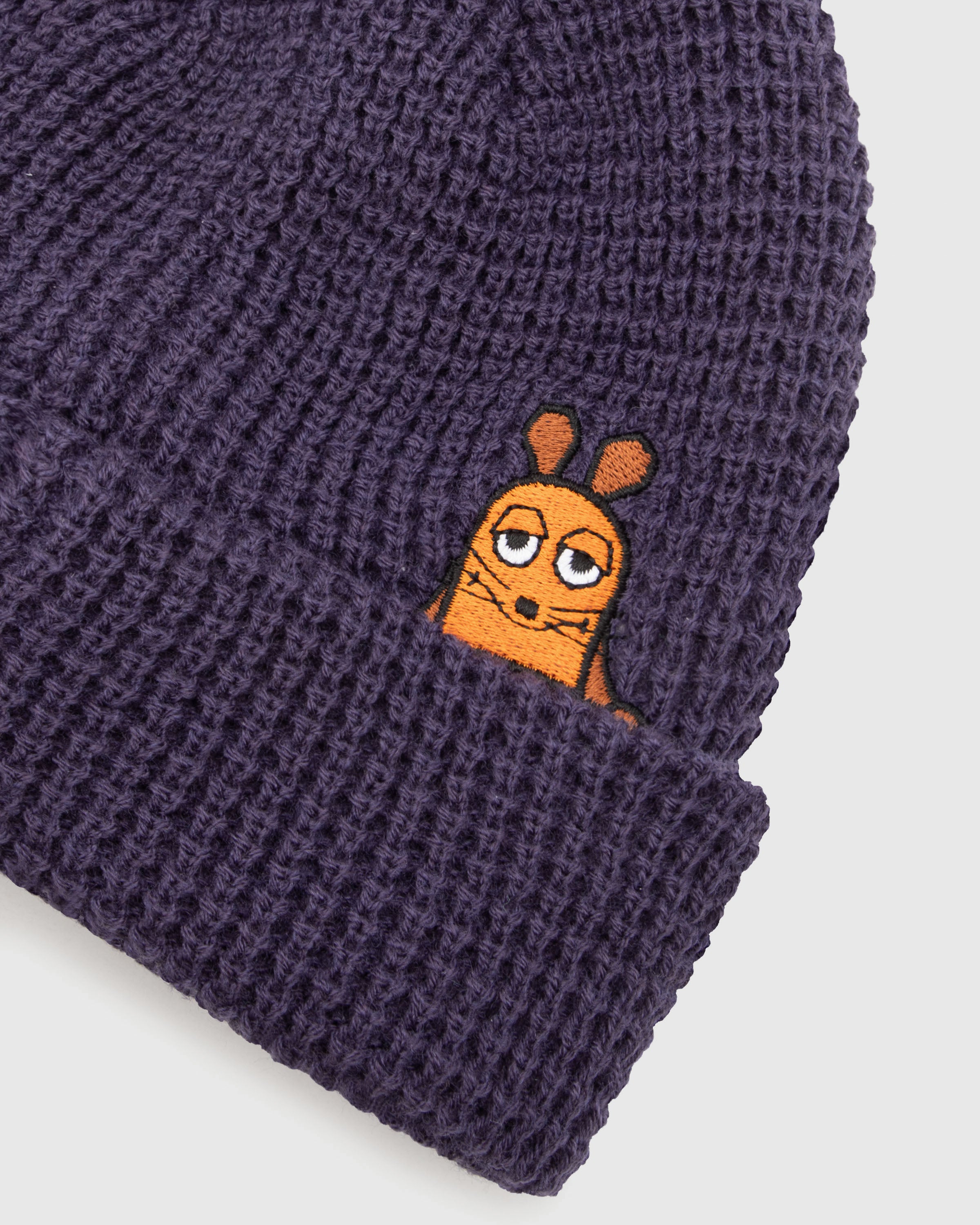 Die Maus ist als feiner Stick rechts hinten oberhalb der Krempe der lilafarbenen Fisherman Beanie veredelt.