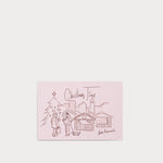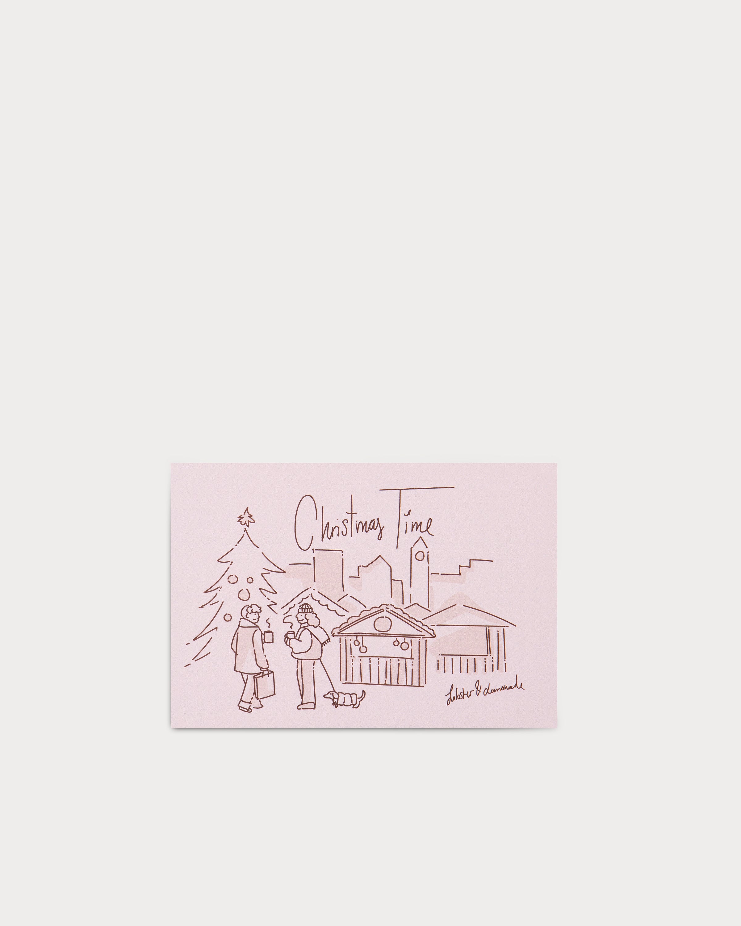 Die Postkarte zeigt eine urbane Szene mit einem Weihnachtsmarkt in der Stadt, auf dem Menschen inmitten von Ständen die festliche Atmosphäre genießen. Ideal für stimmungsvolle Weihnachtsgrüße oder als Ergänzung zu besonderen Geschenken.