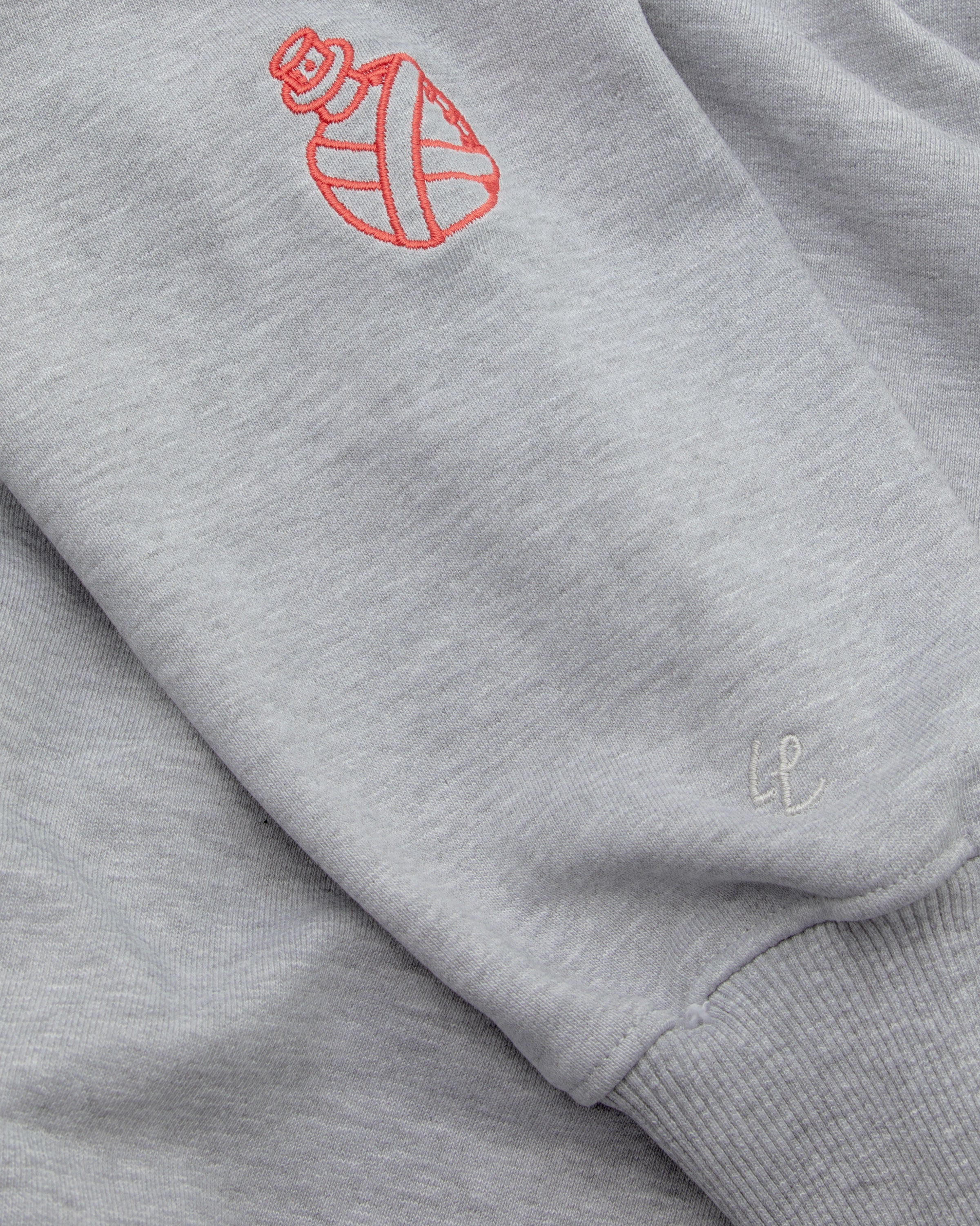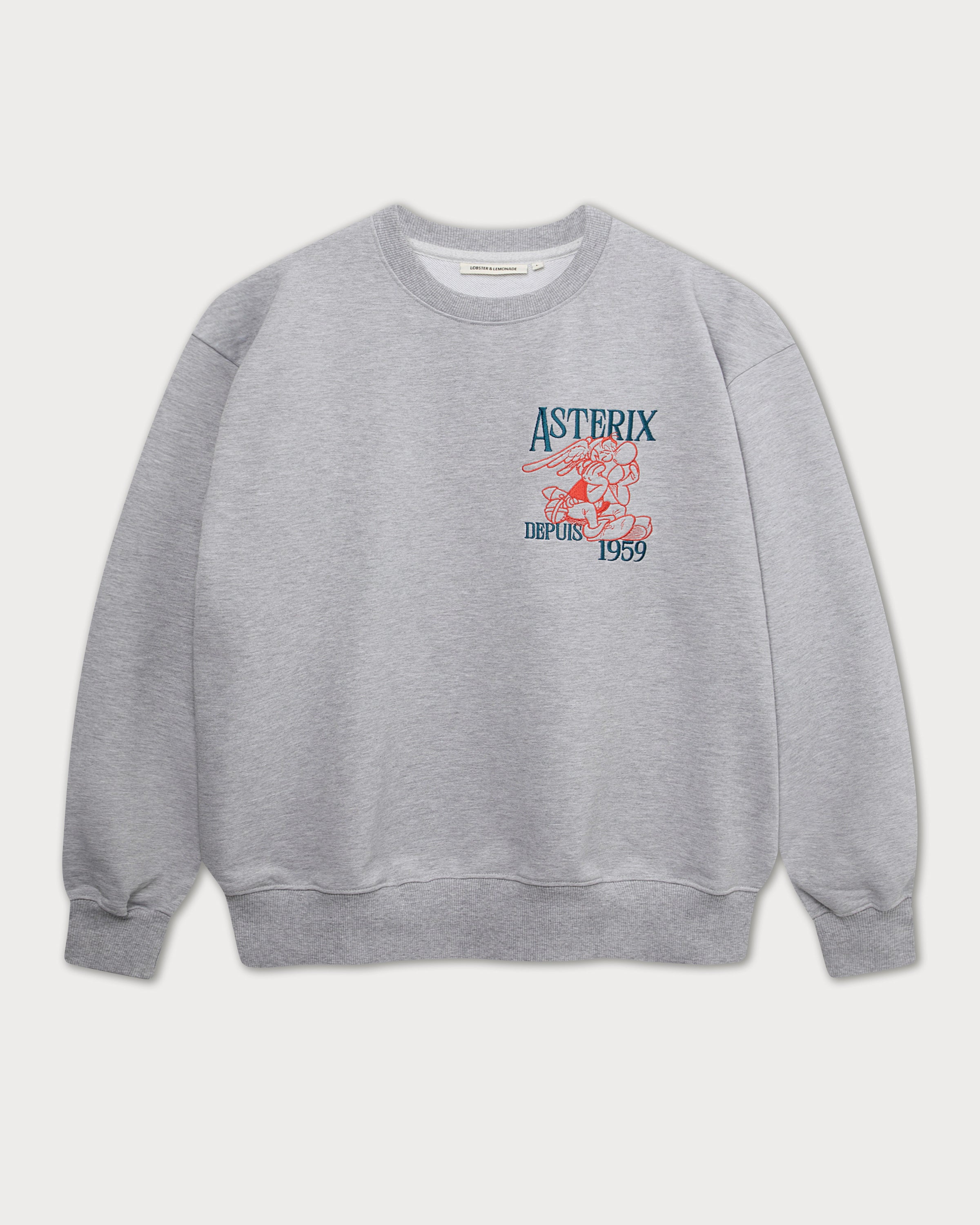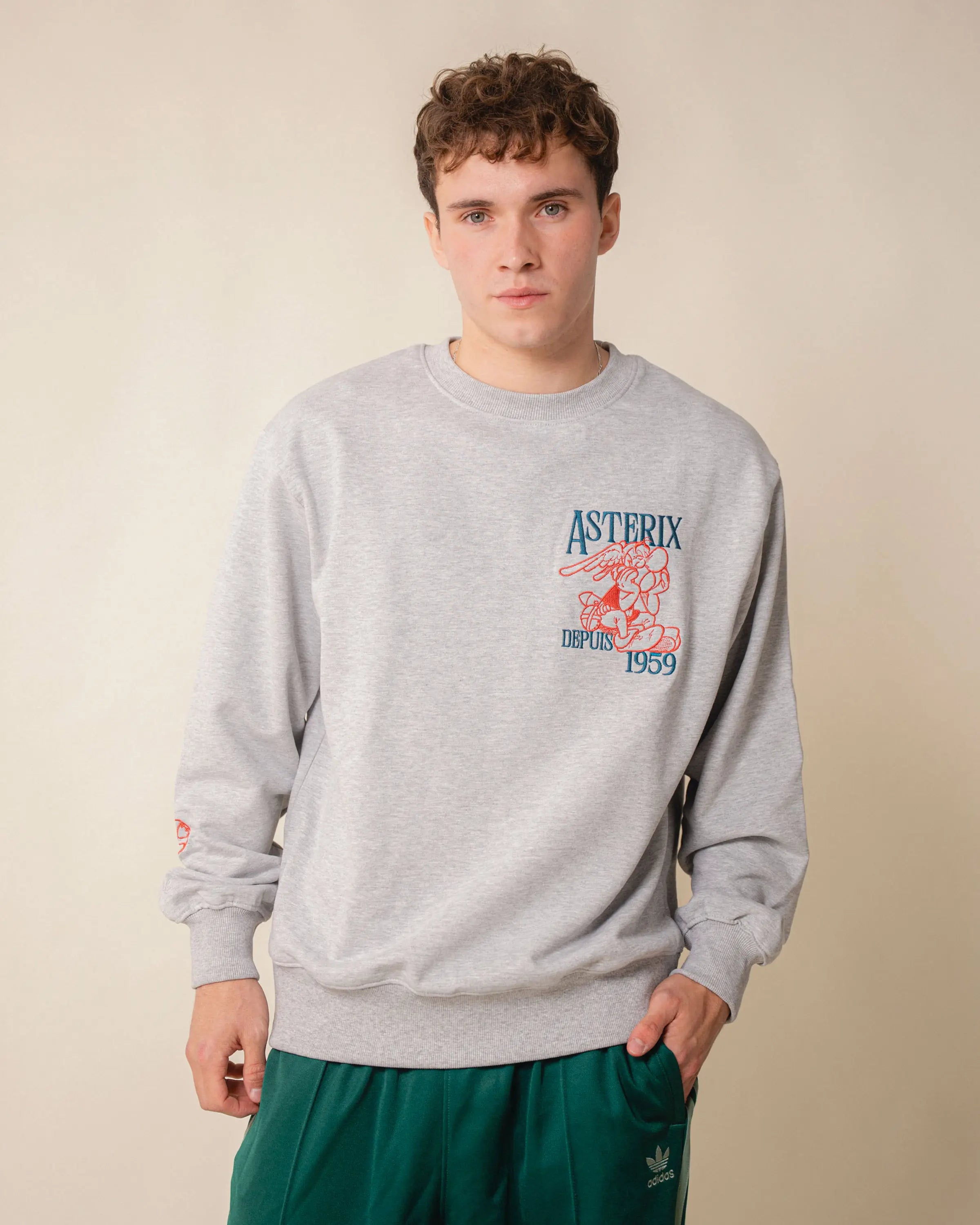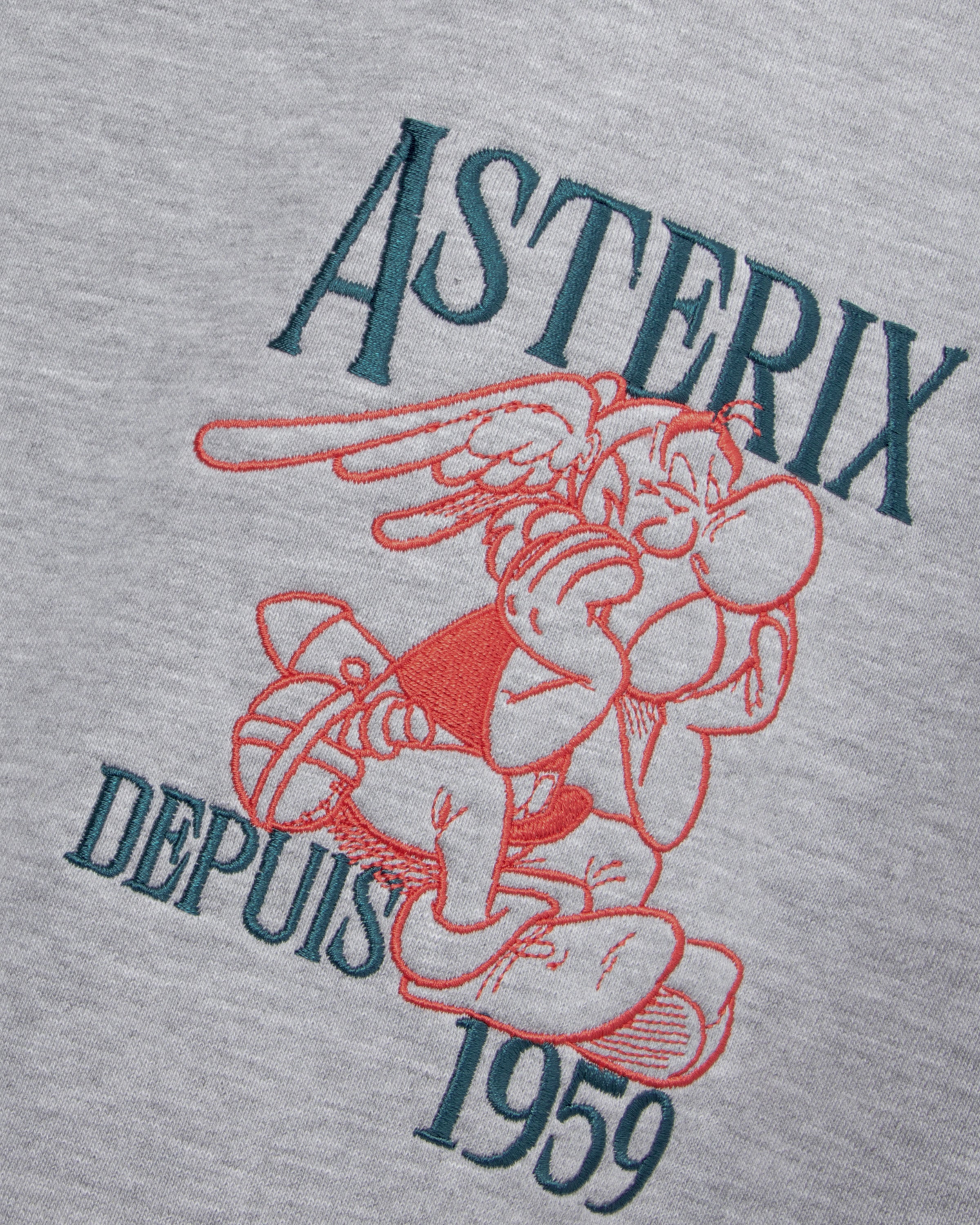 Ein hochwertiger Stick von Astérix in entspannter Pose mit dem Schriftzug „Astérix Depuis 1959“ veredelt die linke Brust des grauen Sweaters. Als besonderes Detail ist am rechten Ärmel zusätzlich die ikonische Zaubertrank-Flasche von Astérix aufgestickt.