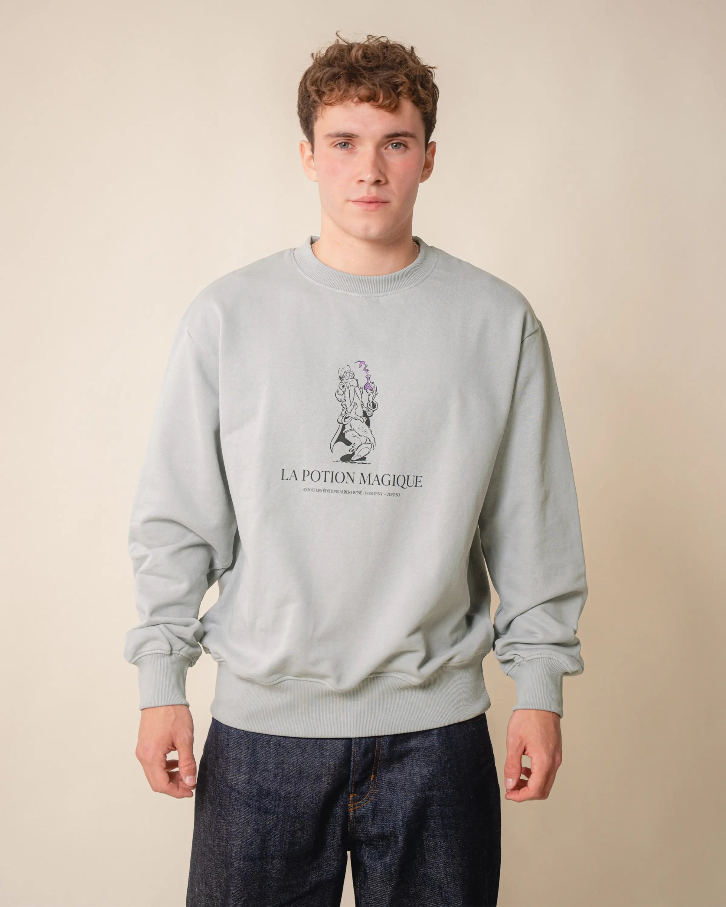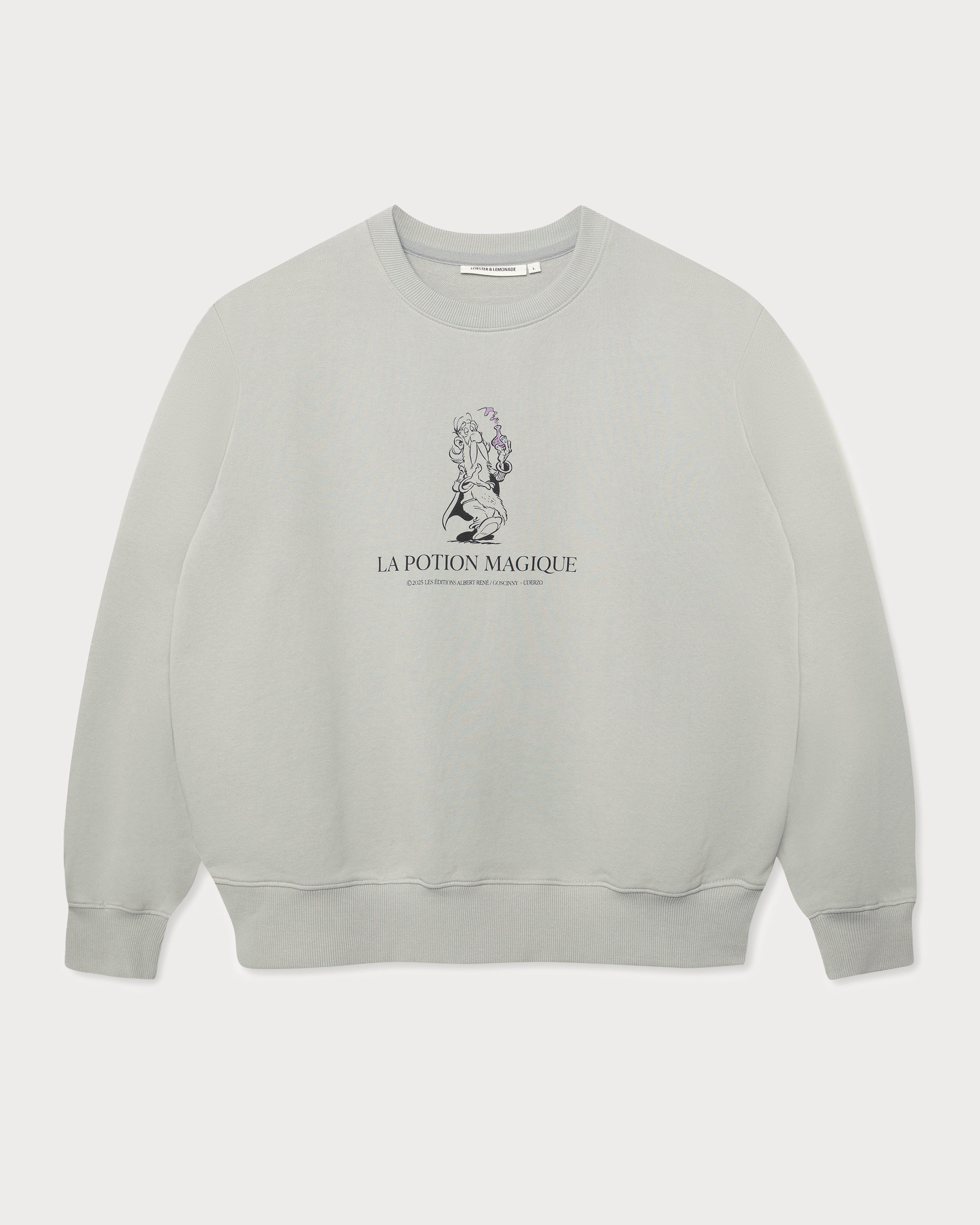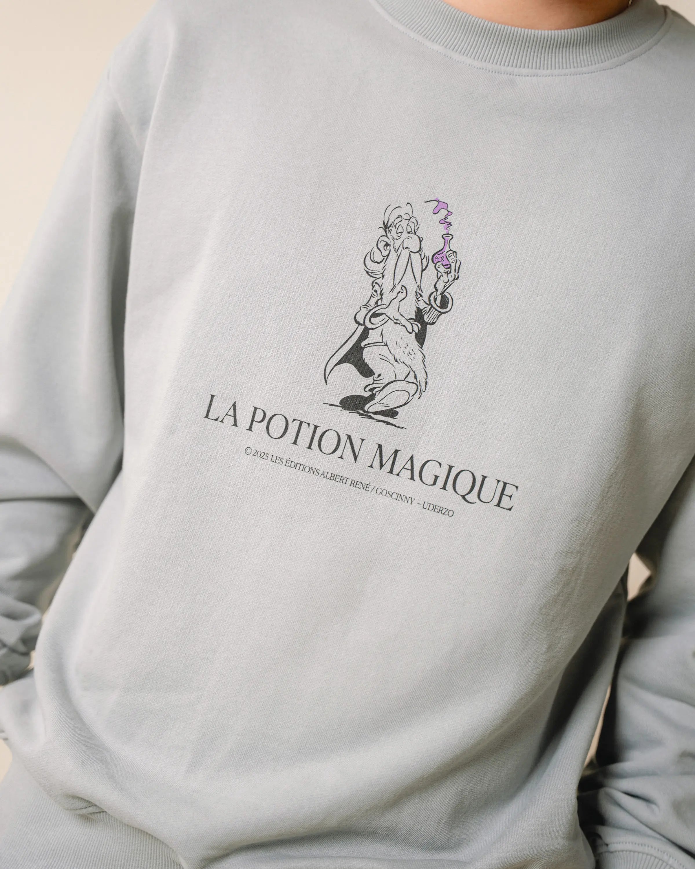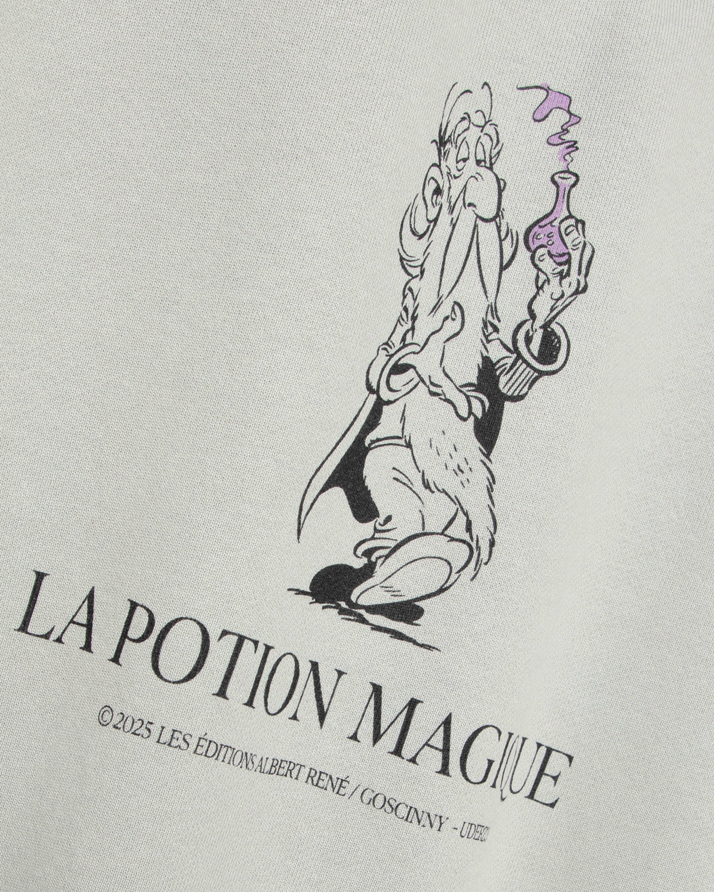 Der großflächige Frontprint des graugrünen Sweaters zeigt den Druiden Miraculix, Panoramix im Original, wie er seinen berühmten Zaubertrank in der Hand hält. Der lilafarbene Zaubertrank sticht als besonderes farbliches Highlight hervor.