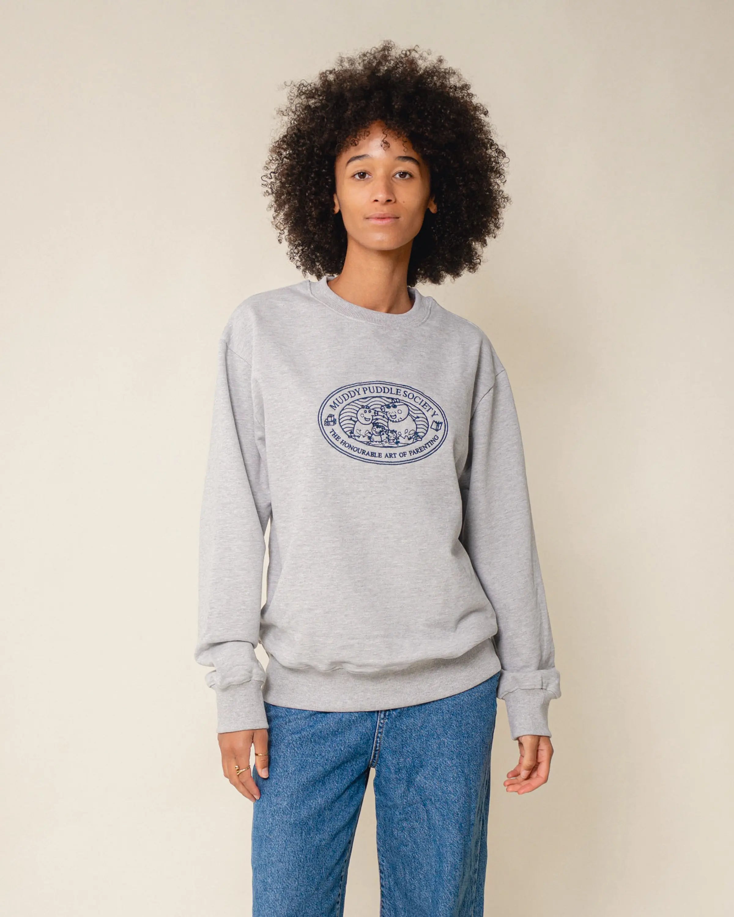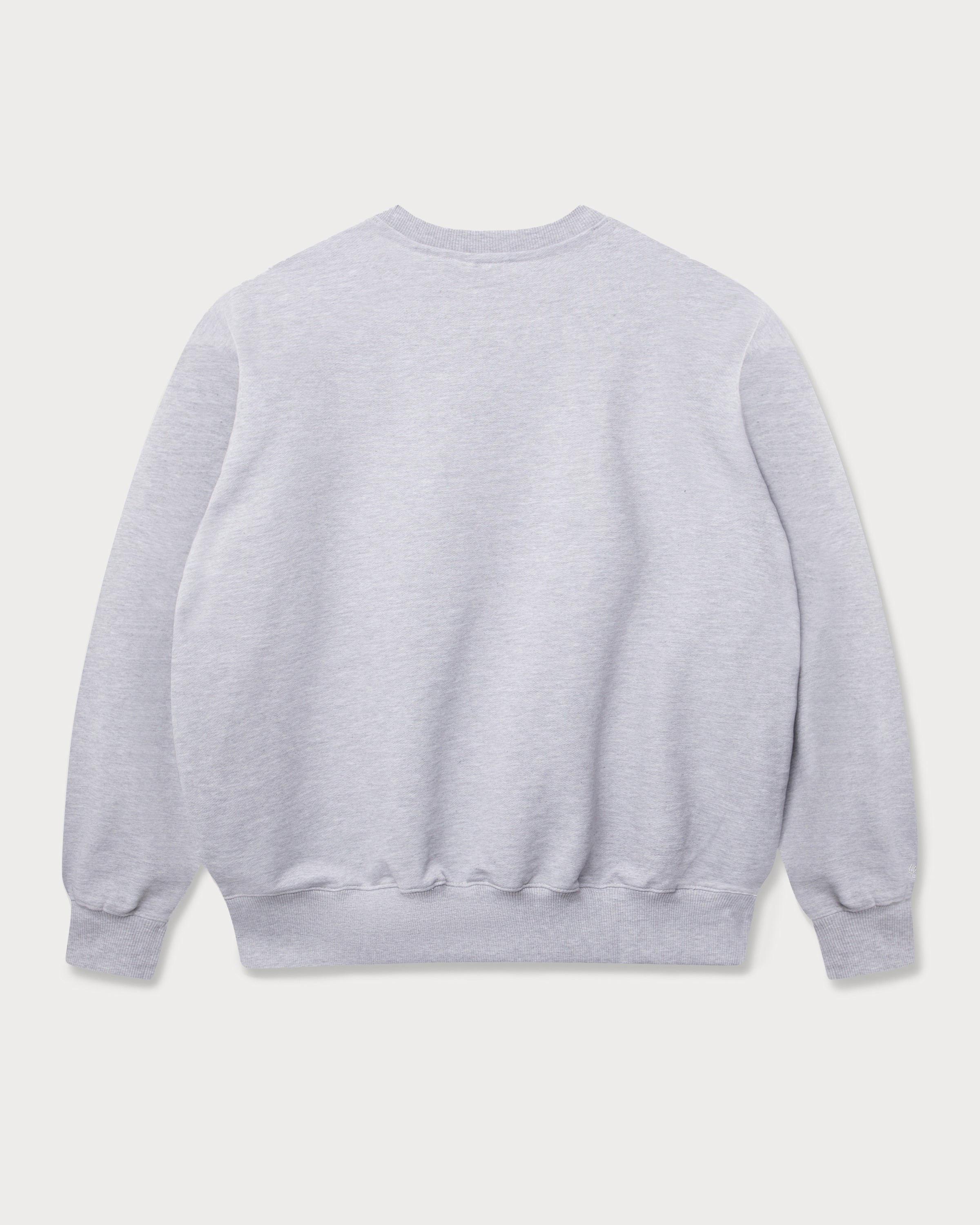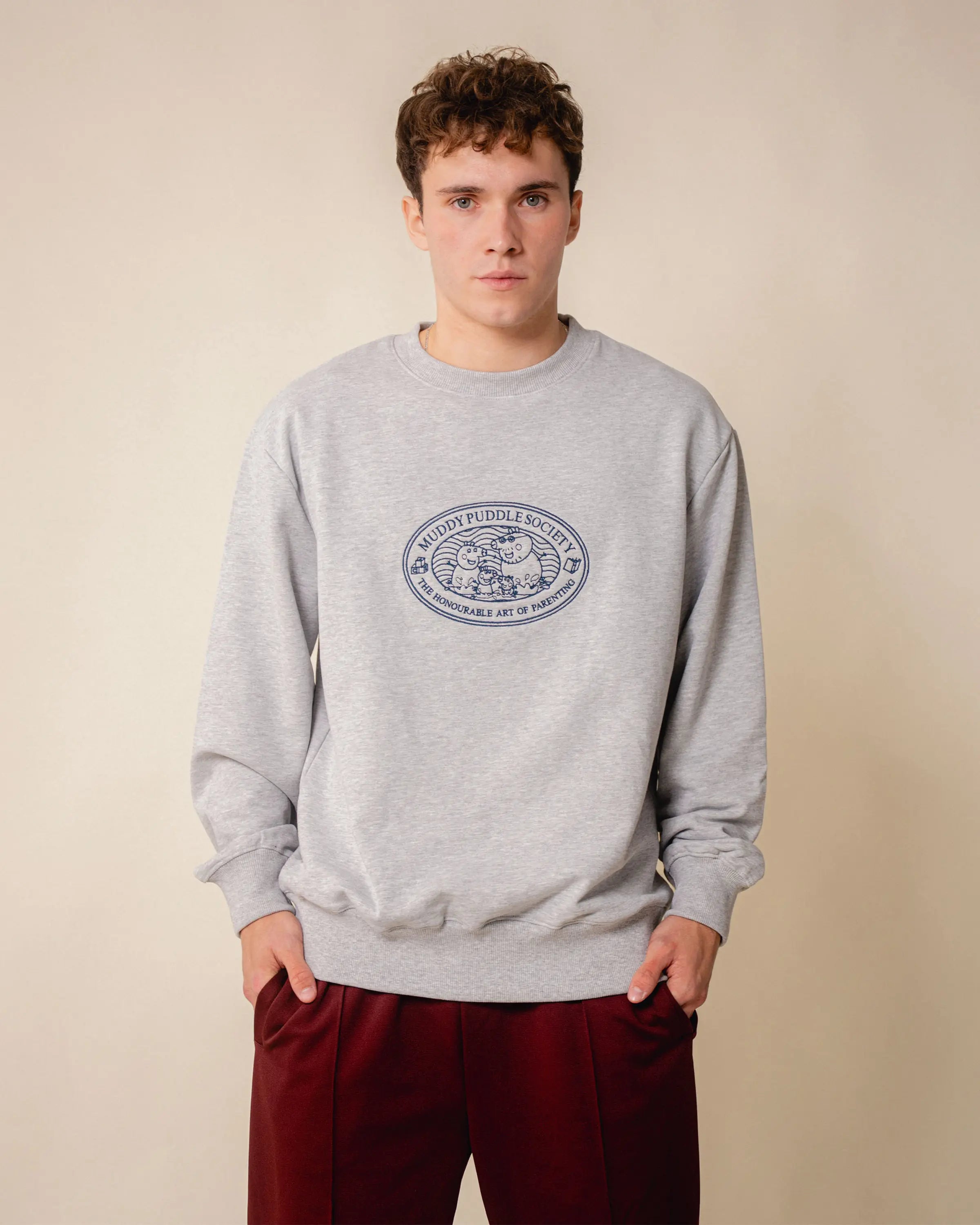 Der grau melierte Sweater besticht durch eine großflächige Stickerei der Familie Wutz im College-Stil auf der Brust.