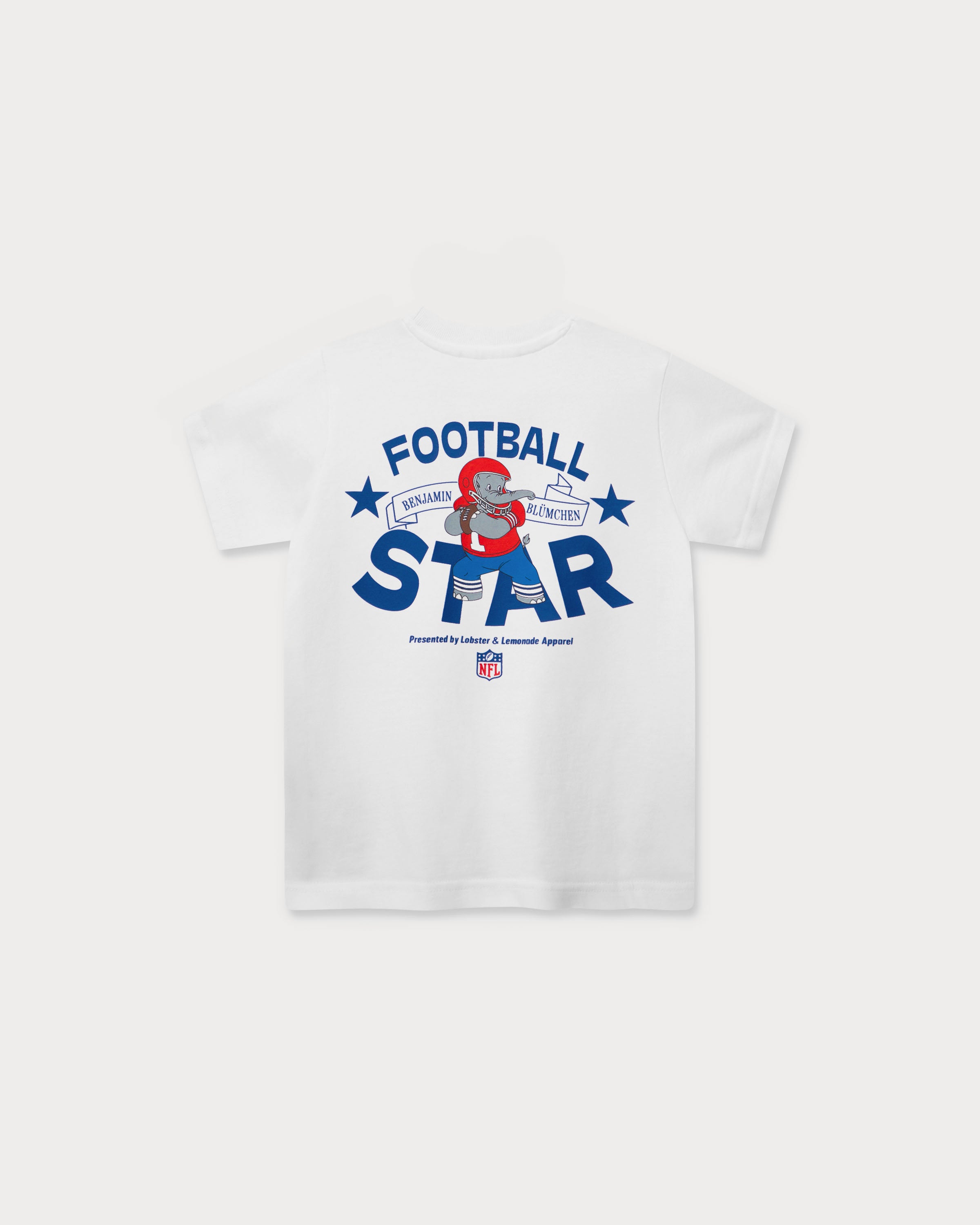 Benjamin Blümchen is featured in a typical quarterback pose on the large back print of the white T-shirt. The "Football Star" lettering and the NFL Shield logo on the front complete the sporty look.