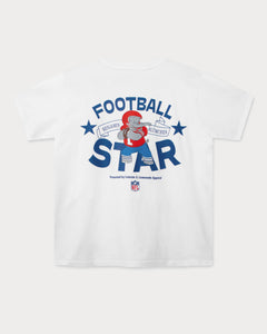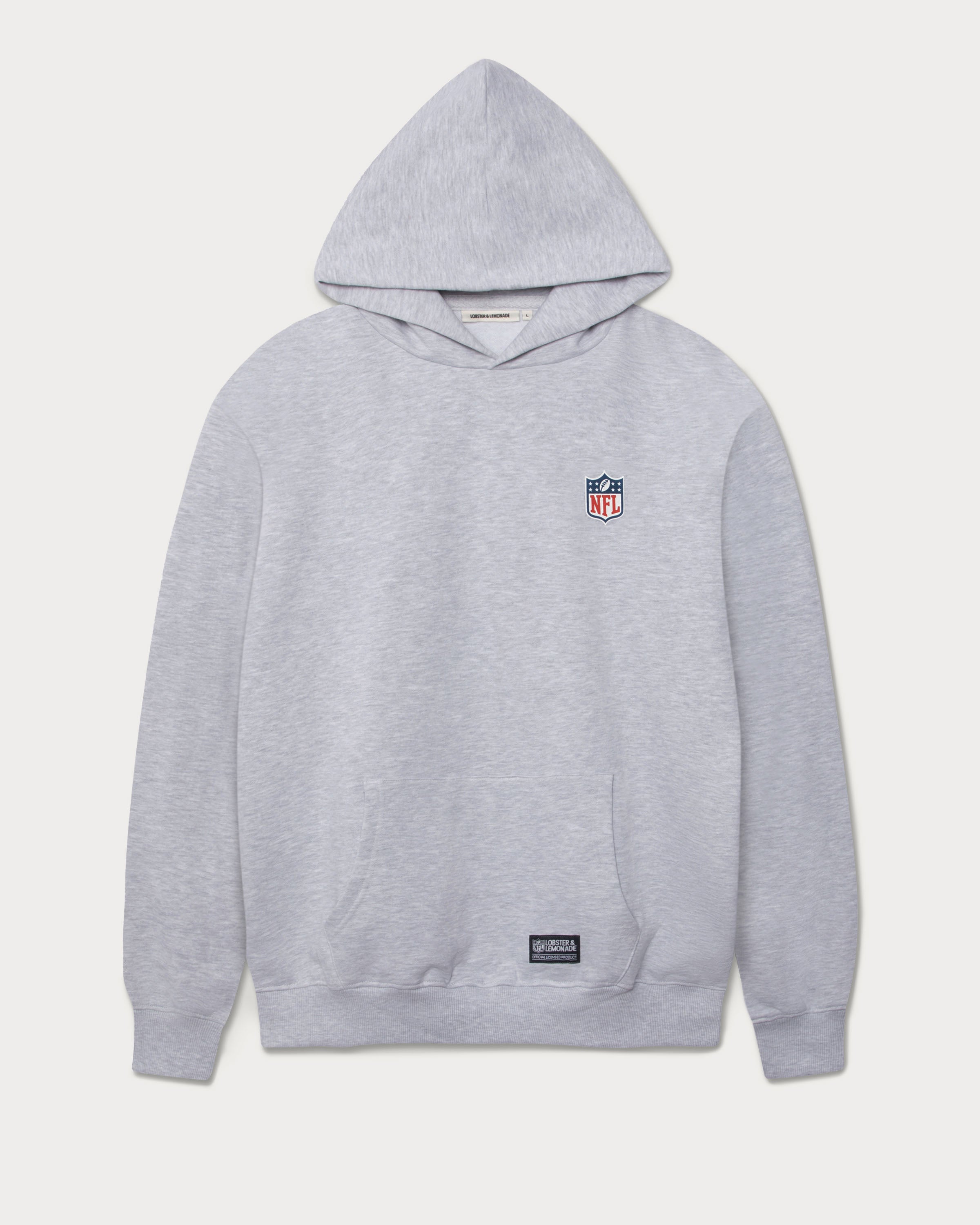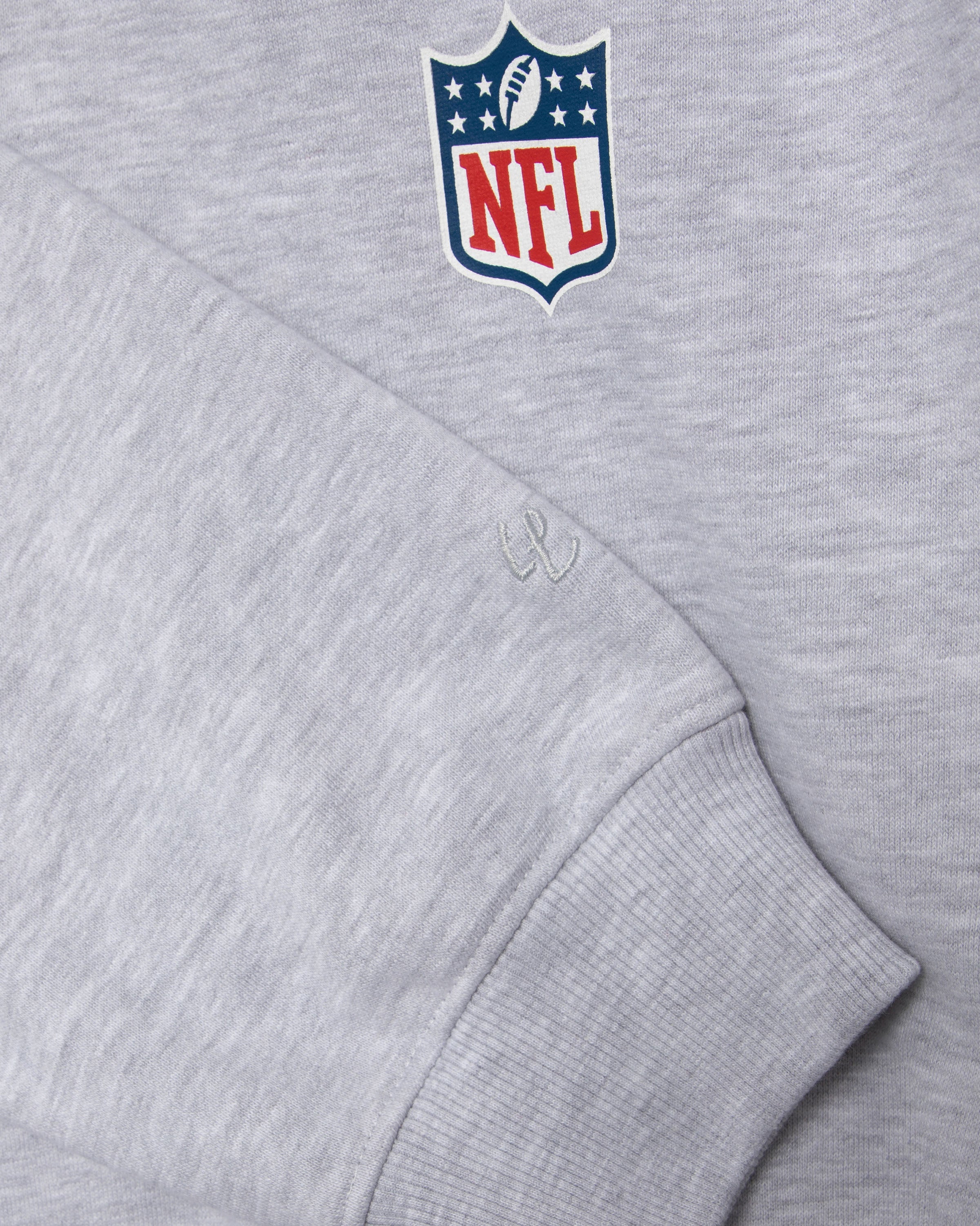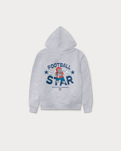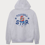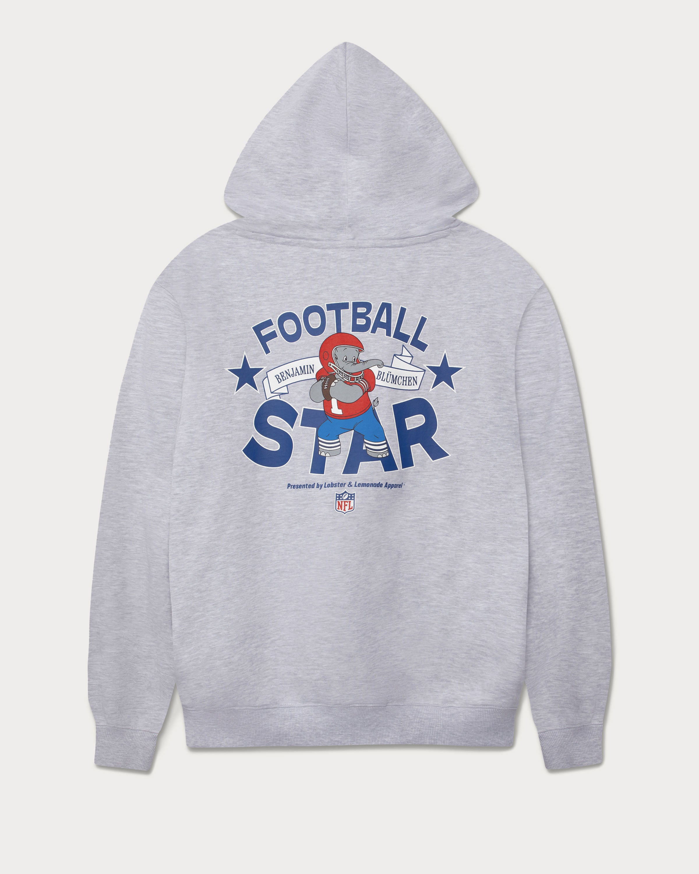 Benjamin Blümchen is featured in a typical quarterback pose on the large back print of the heather gray hoodie. The "Football Star" lettering and the NFL Shield logo on the front complete the sporty look.