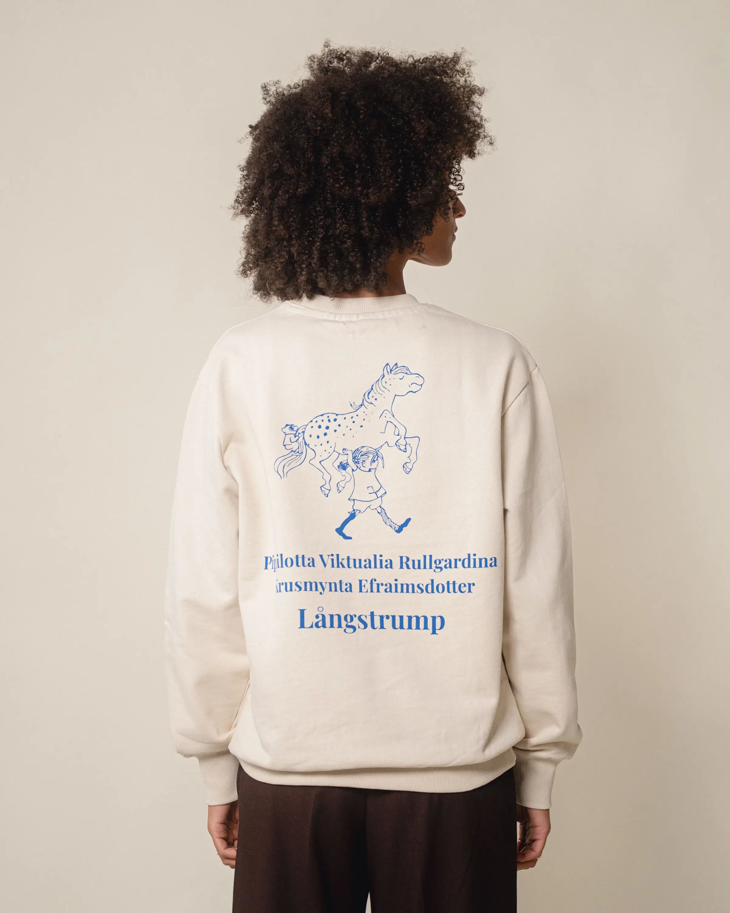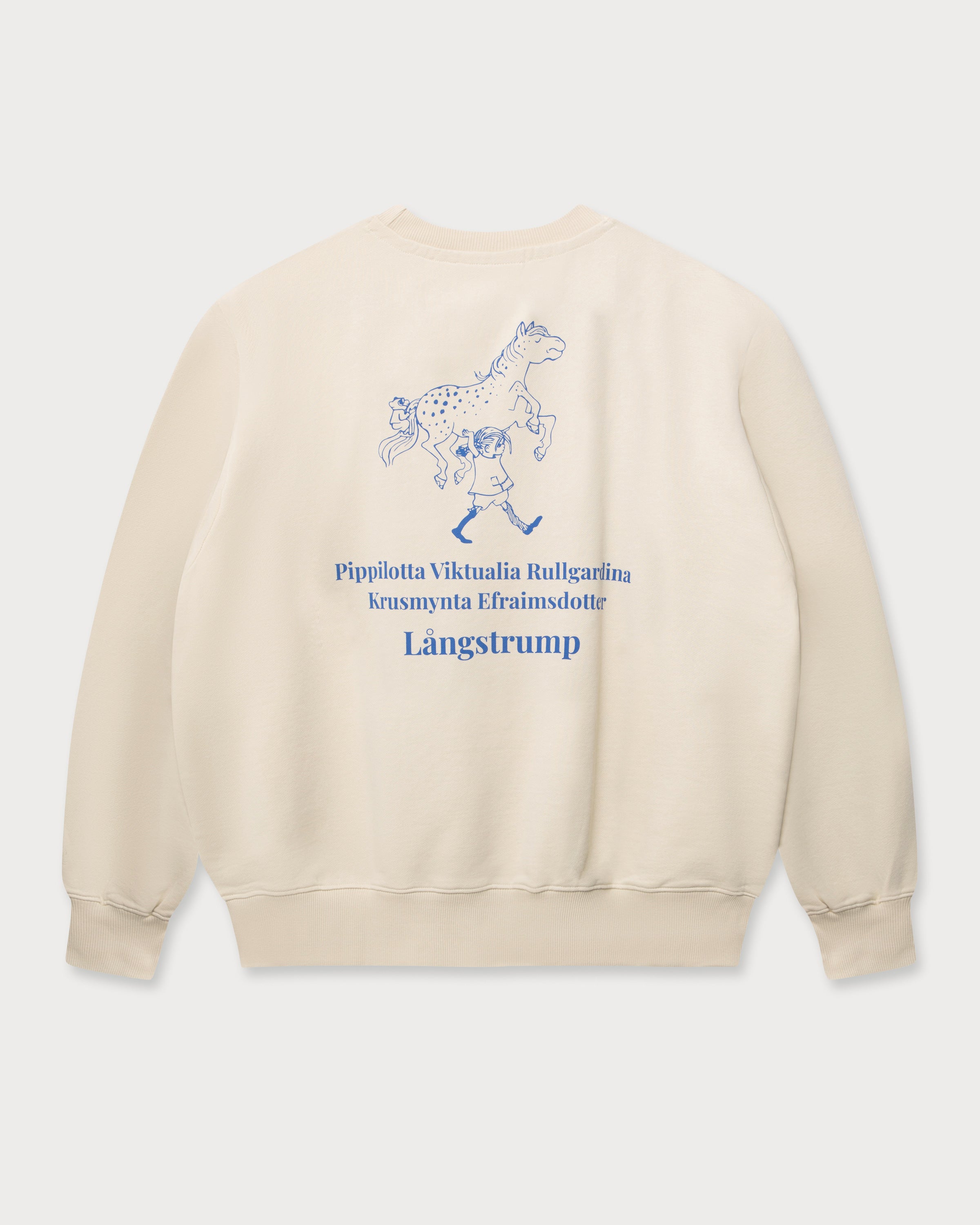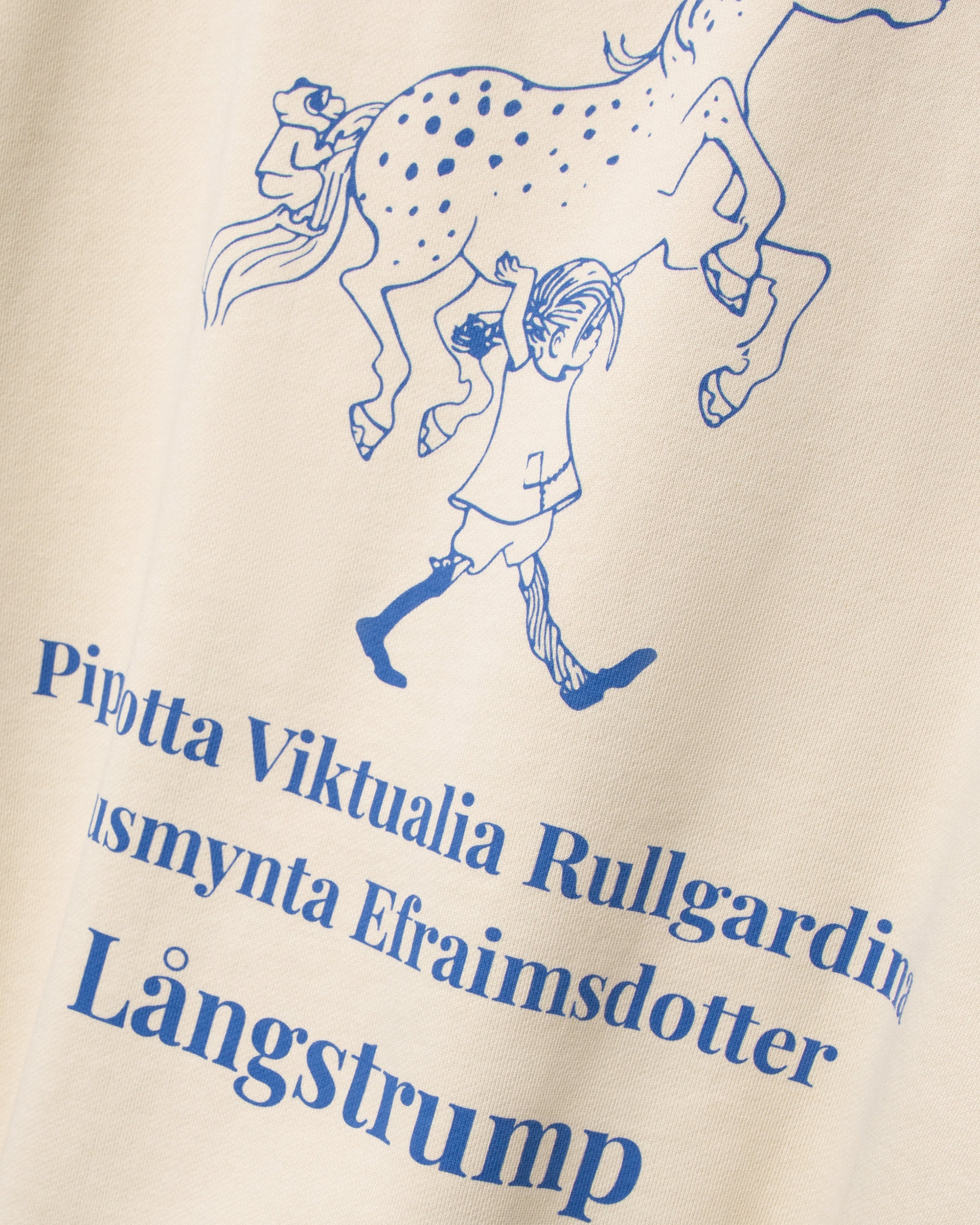 The large, blue back print of the cream-colored sweater features the unmistakable Pippi Longstocking lifting her horse, Little Uncle. The design is complemented by her full name: Pippilotta Viktualia Rullgardina Krusmynta Efraimsdotter Långstrump.