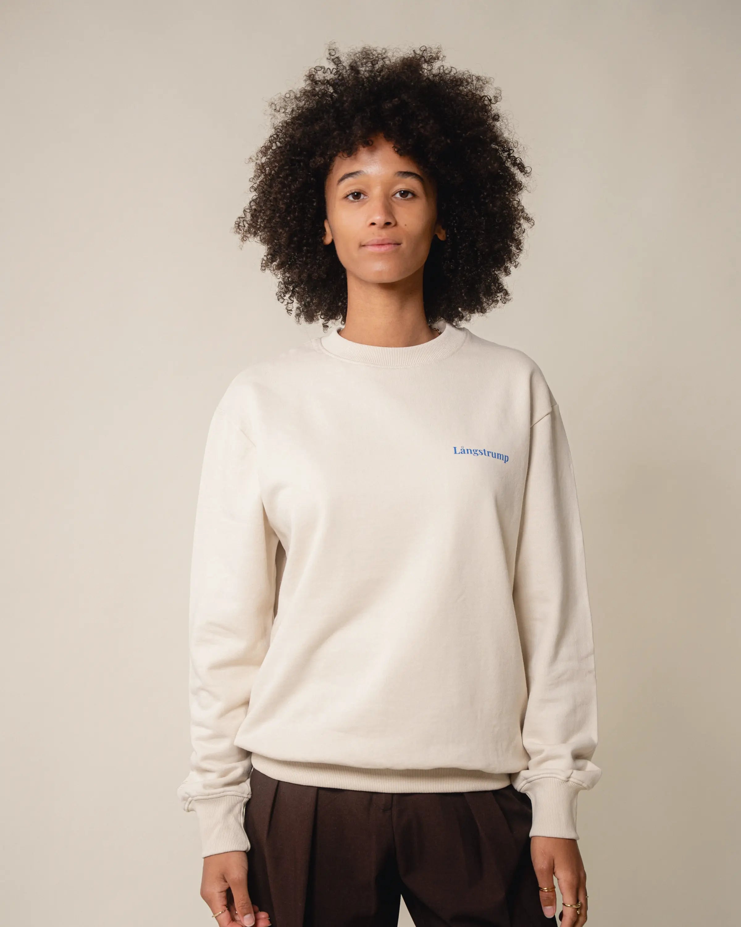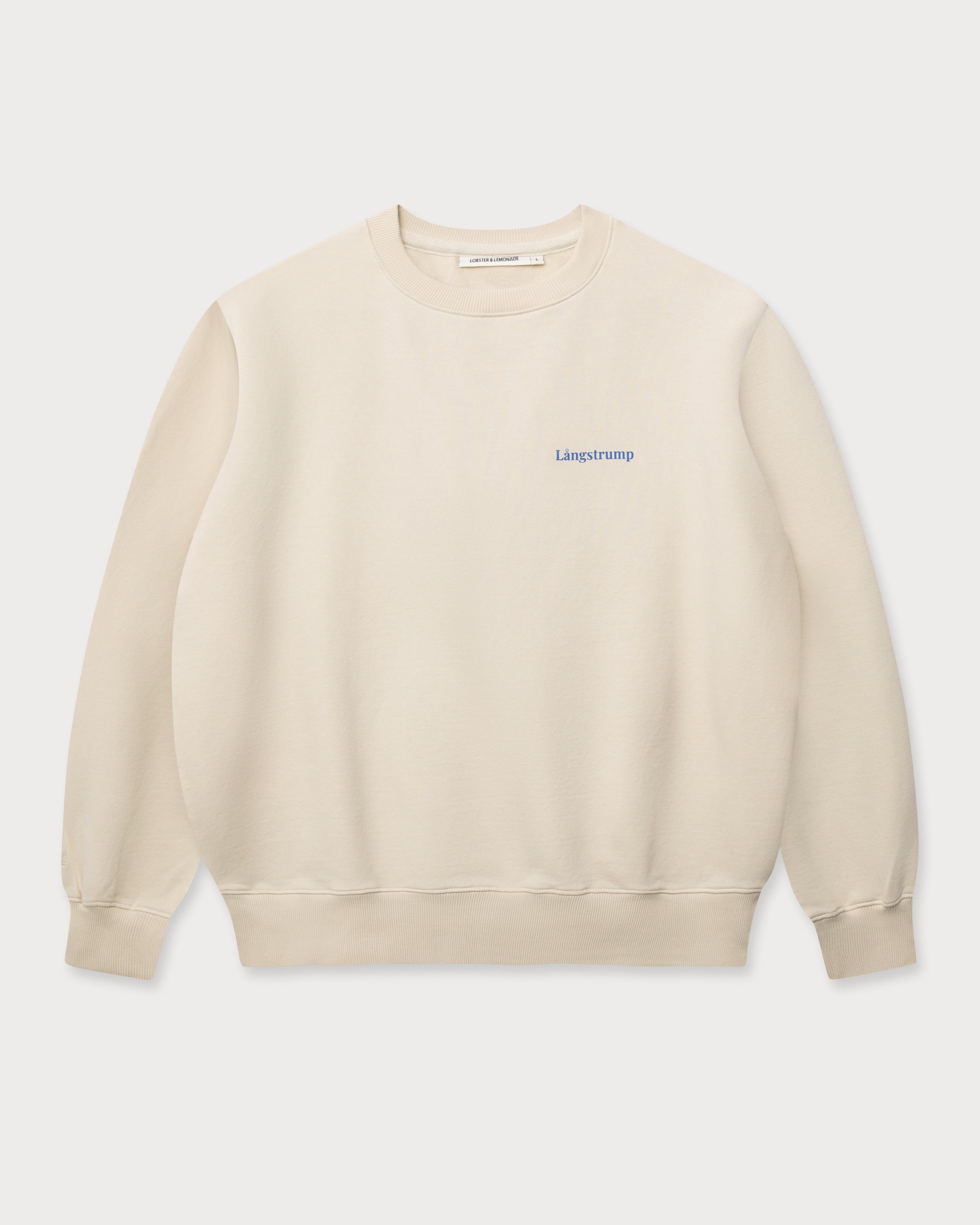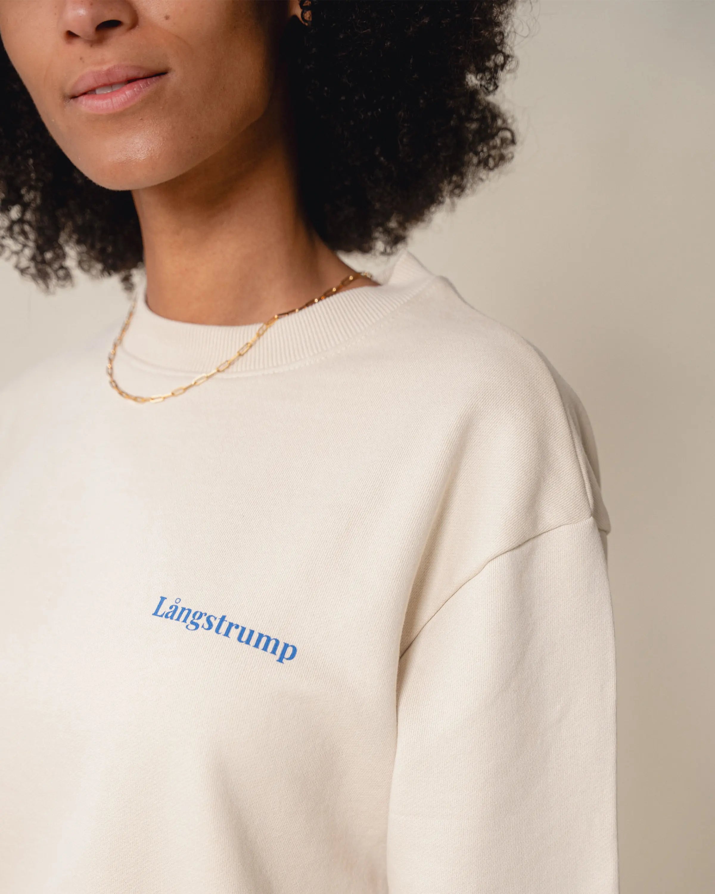 The large, blue back print of the cream-colored sweater features the unmistakable Pippi Longstocking lifting her horse, Little Uncle. The design is complemented by her full name: Pippilotta Viktualia Rullgardina Krusmynta Efraimsdotter Långstrump.