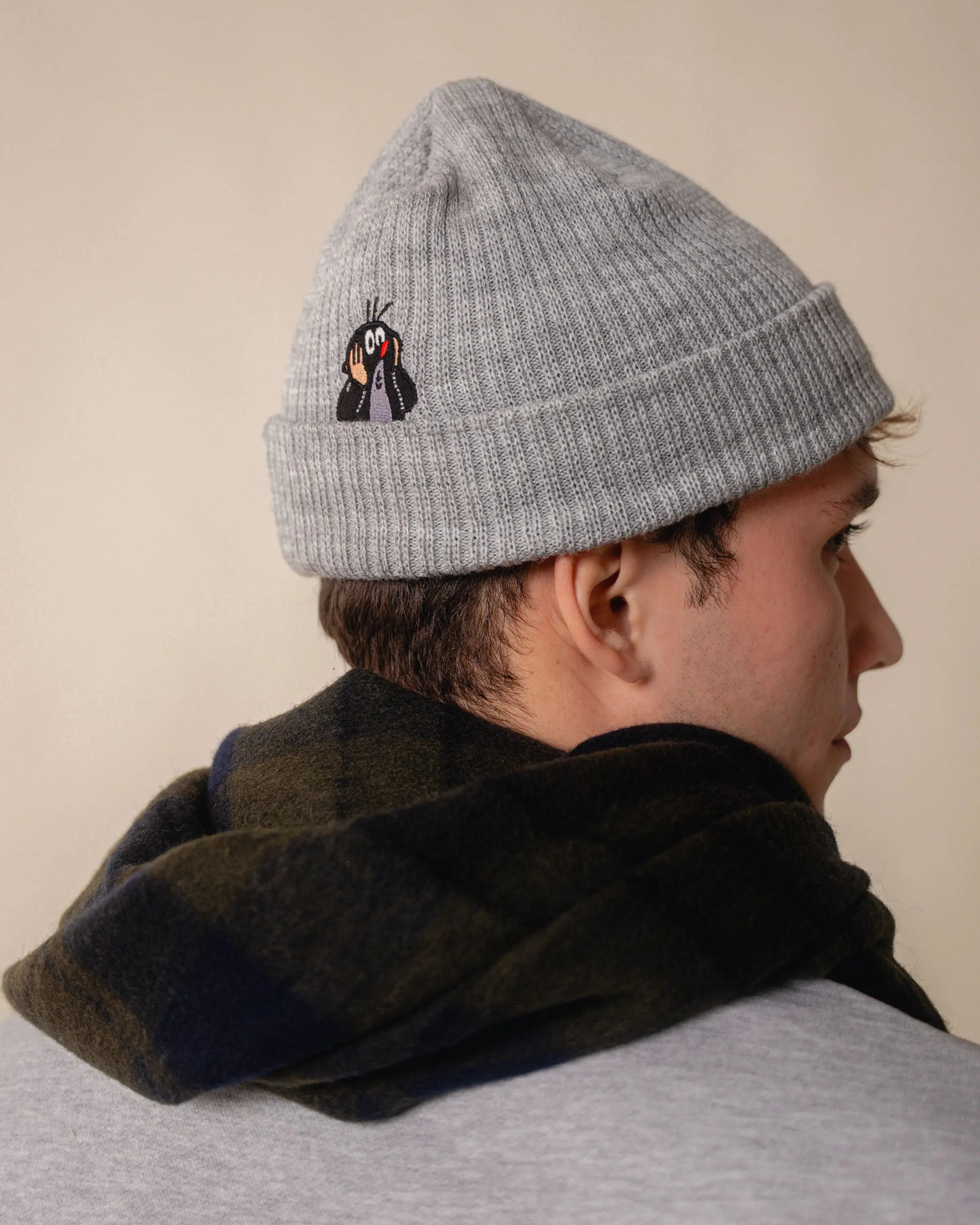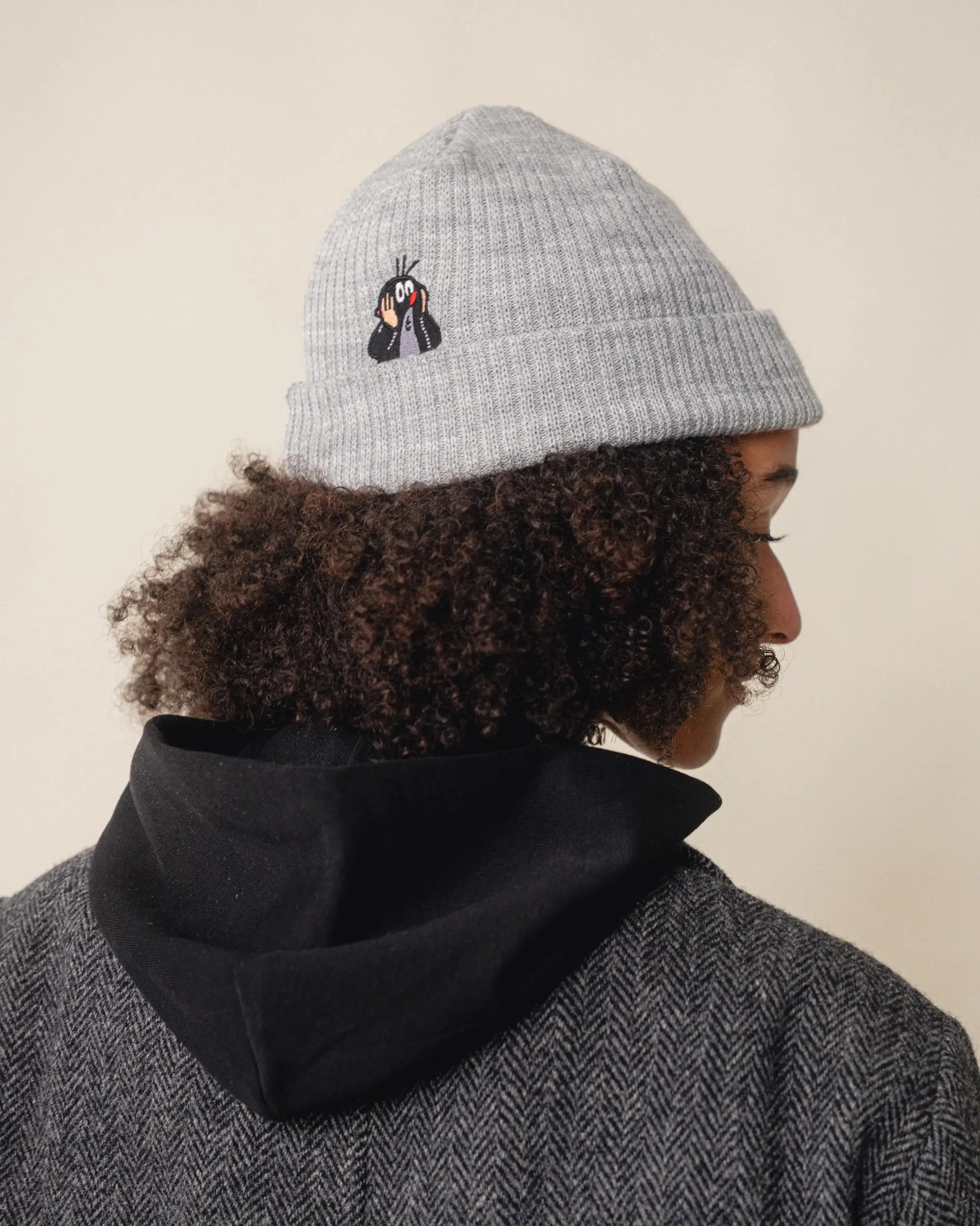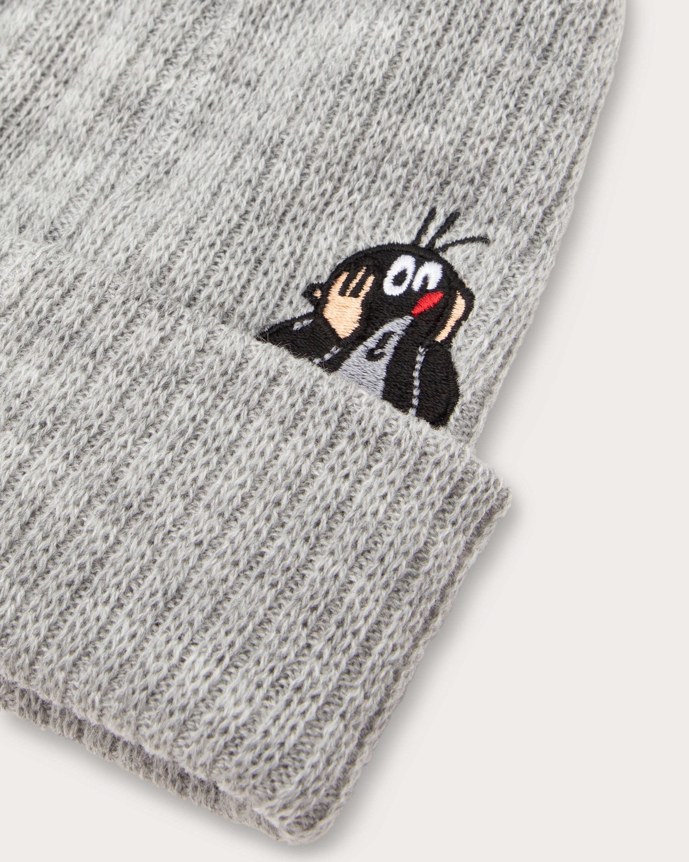 The little mole is a fine embroidery on the back right above the brim of the grey Fisherman Beanie.