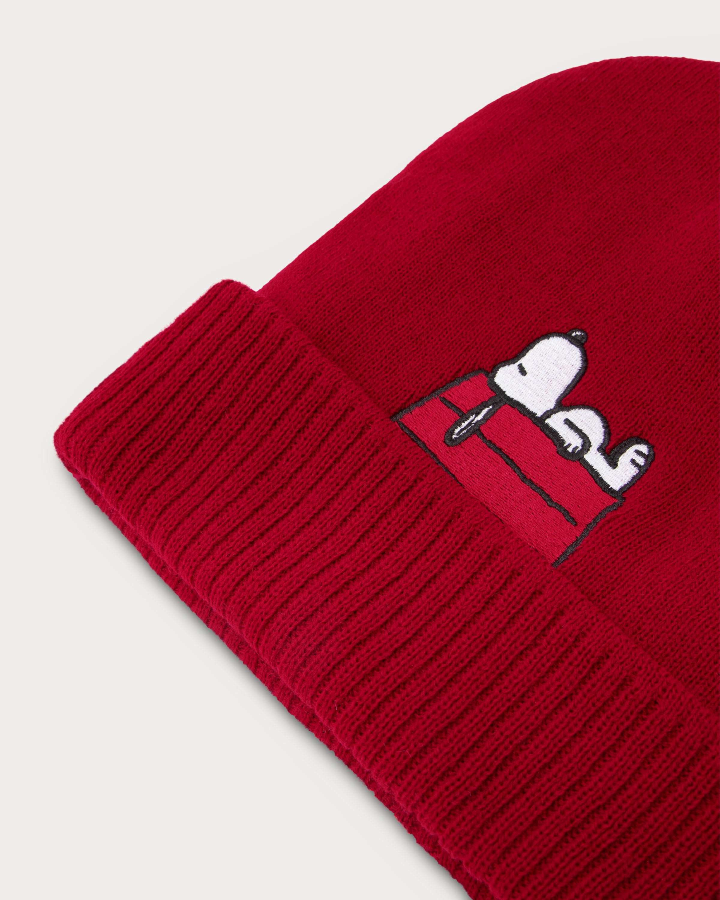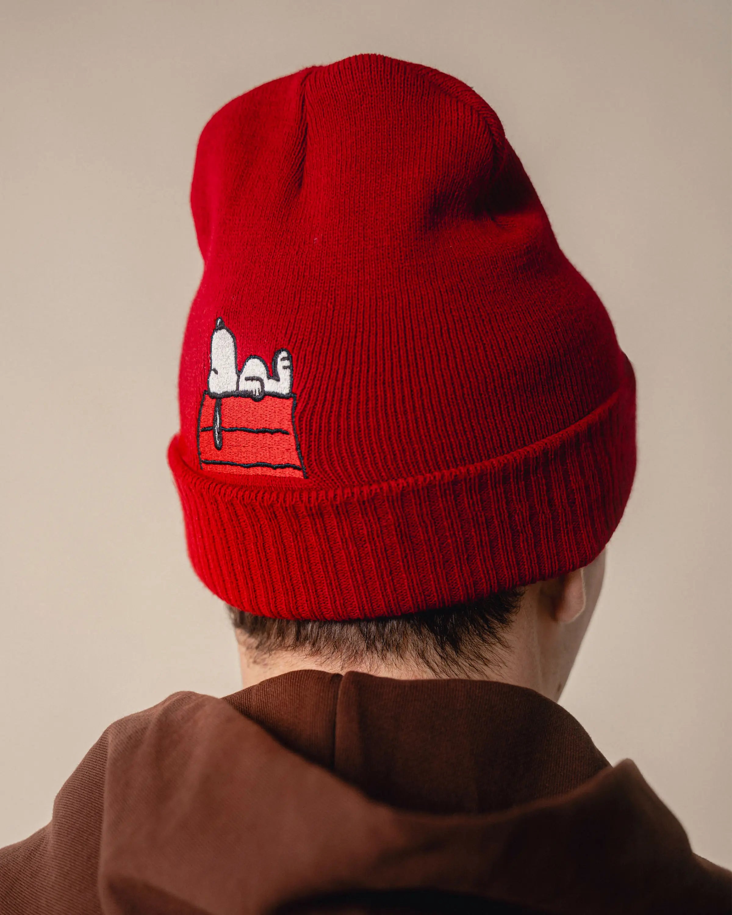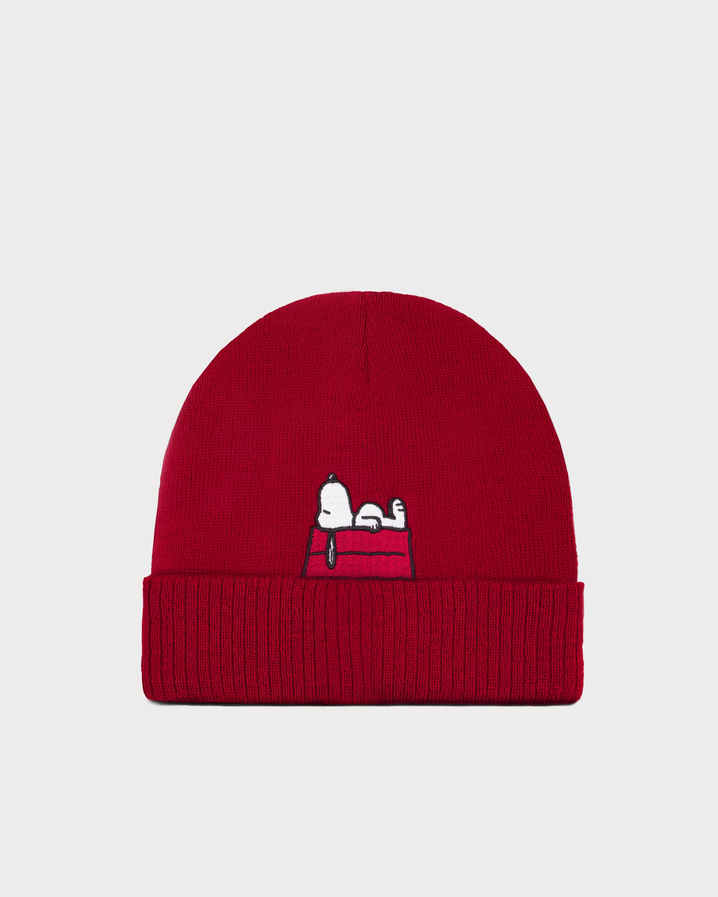 Snoopy is refined as a fine embroidery at the back above the brim of the red beanie.