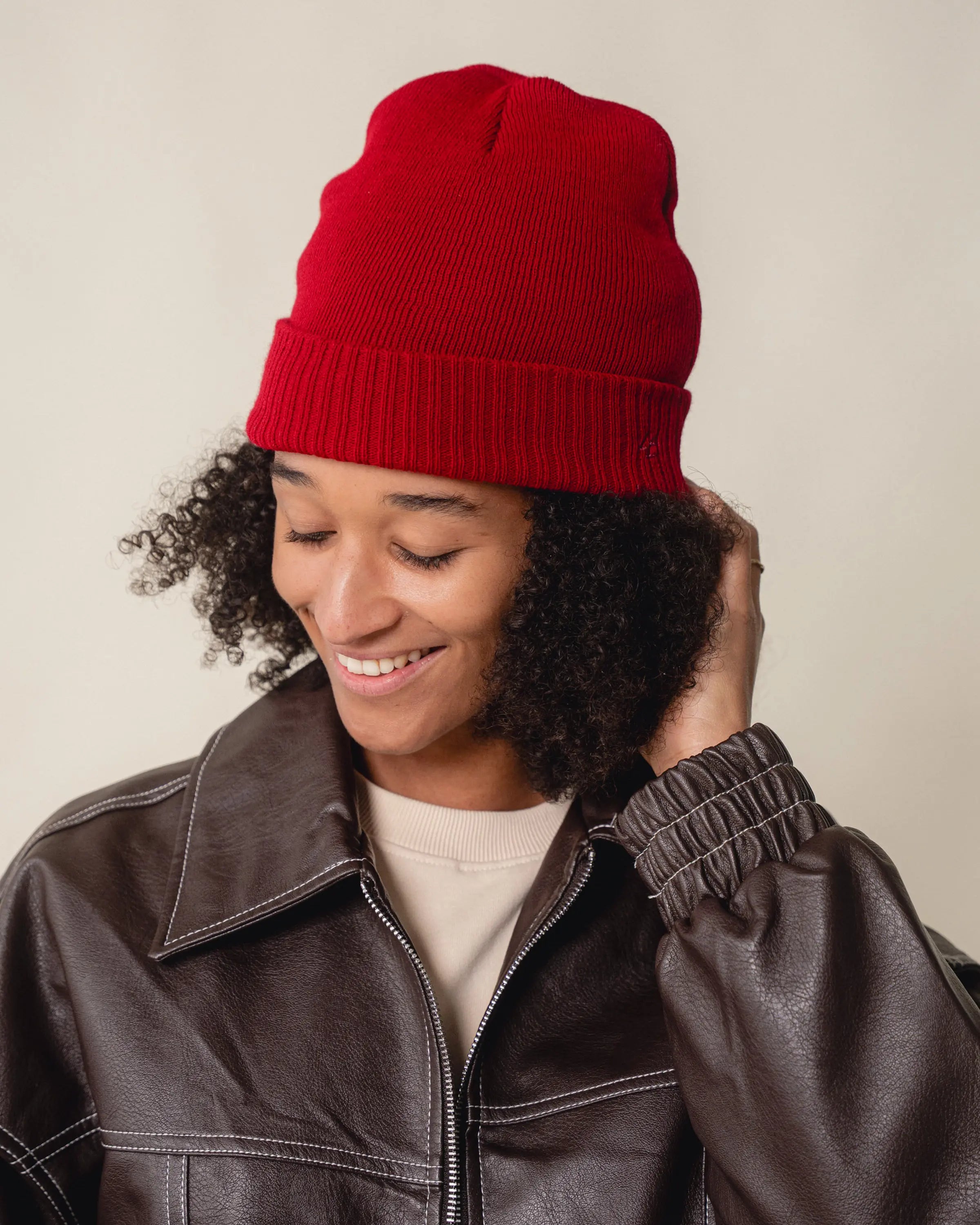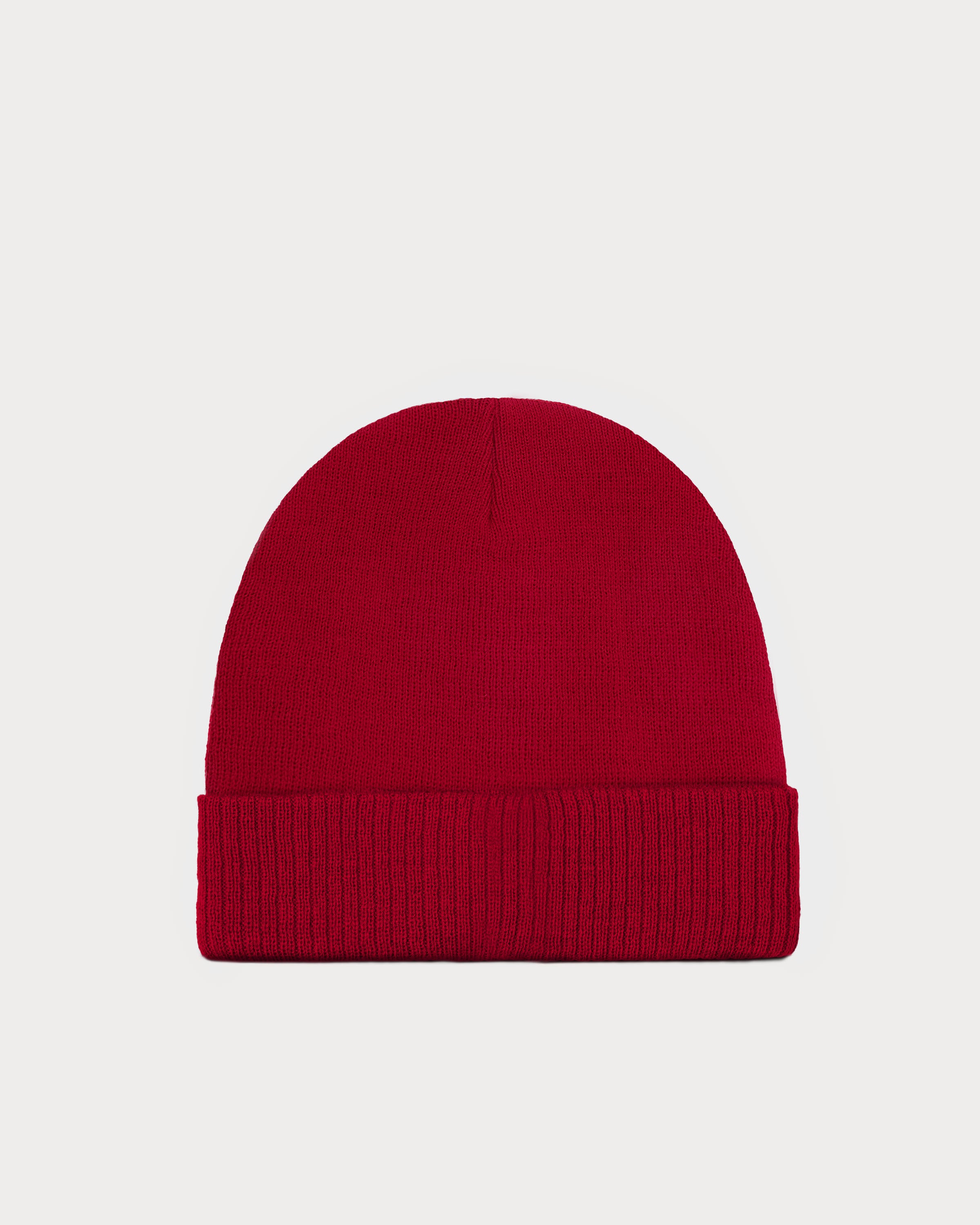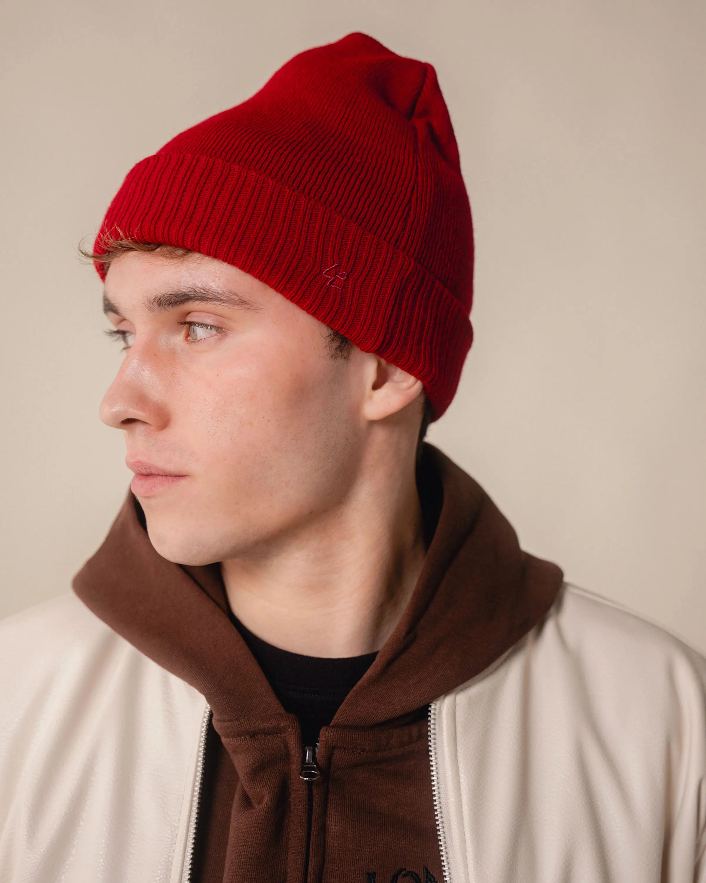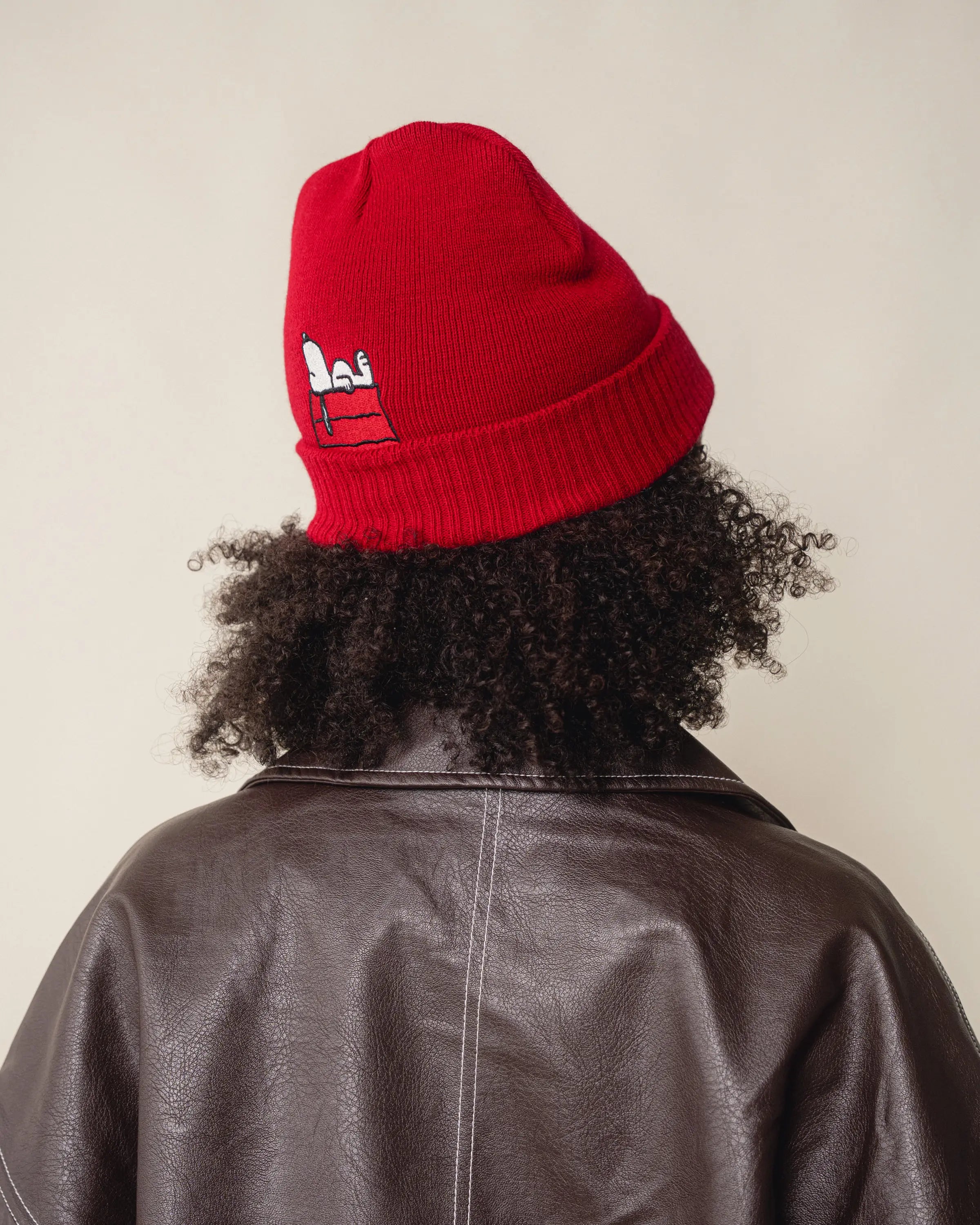 Snoopy is refined as a fine embroidery at the back above the brim of the red beanie.