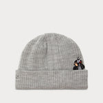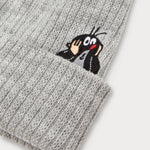 The little mole is a fine embroidery on the back right above the brim of the grey Fisherman Beanie.