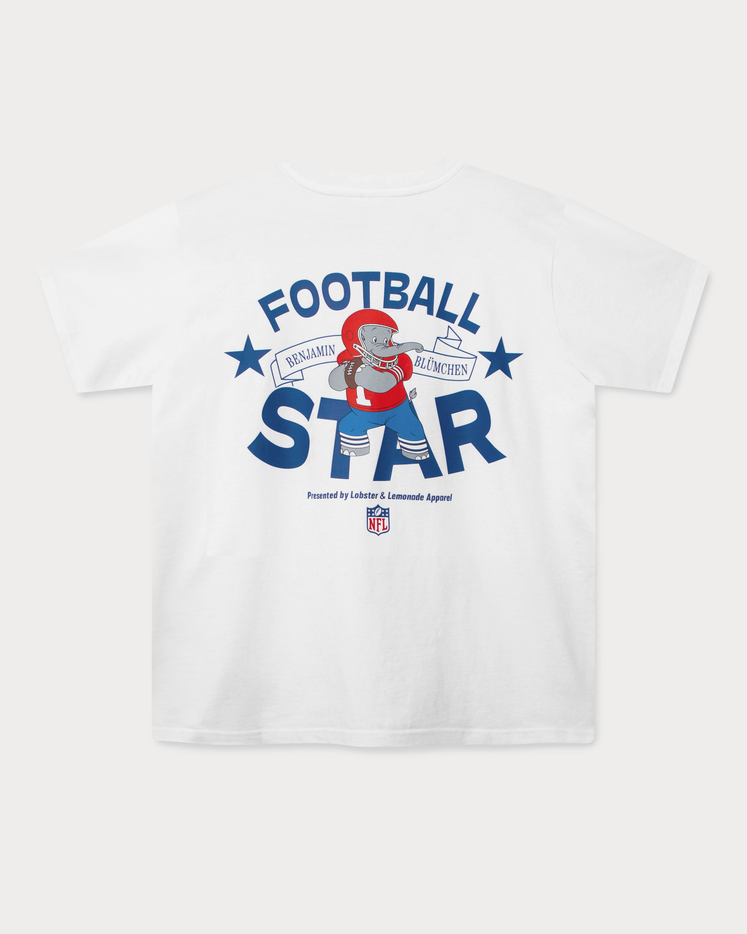 Benjamin Blümchen is featured in a typical quarterback pose on the large back print of the white T-shirt. The "Football Star" lettering and the NFL Shield logo on the front complete the sporty look.