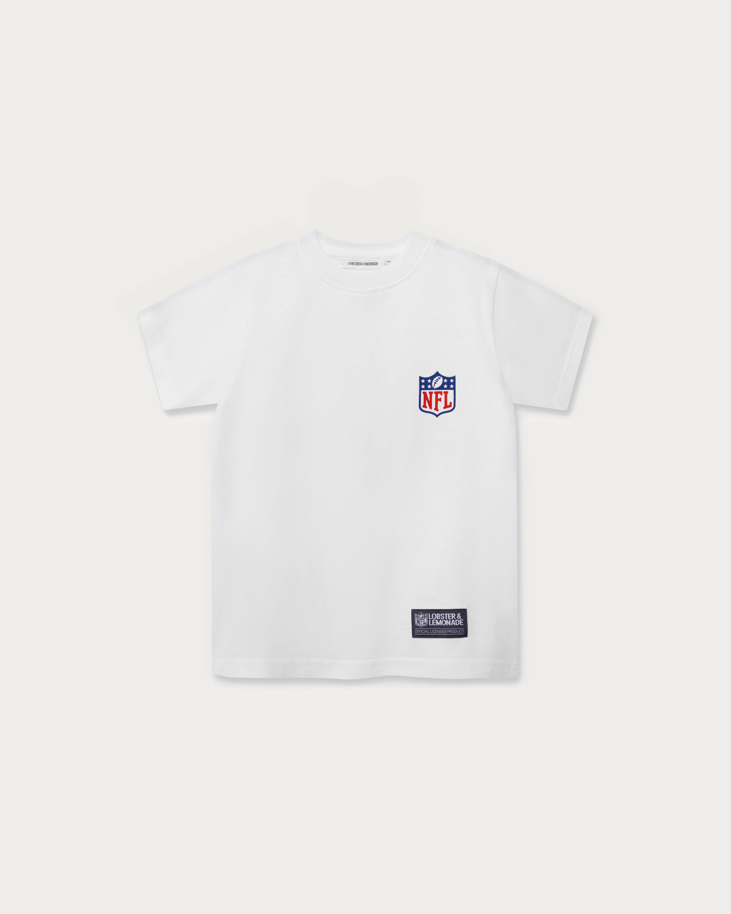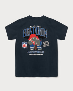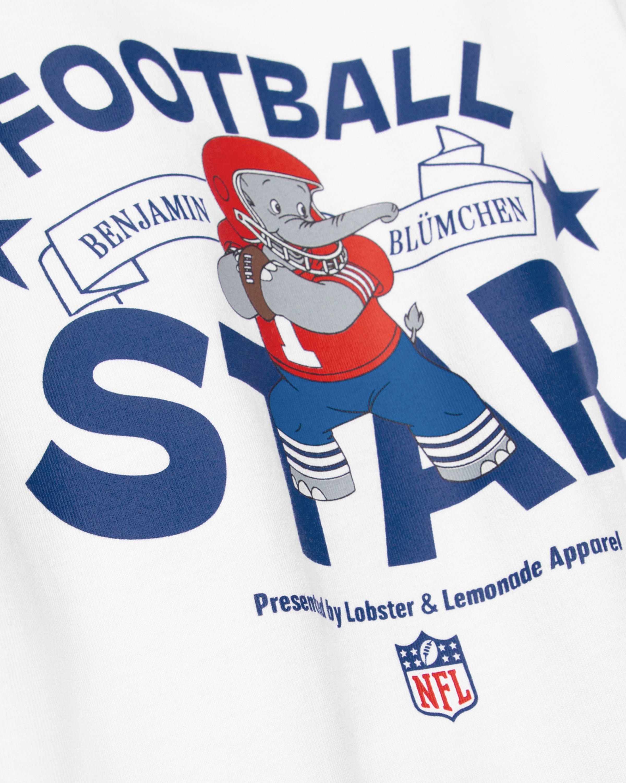Benjamin Blümchen is featured in a typical quarterback pose on the large back print of the white T-shirt. The "Football Star" lettering and the NFL Shield logo on the front complete the sporty look.