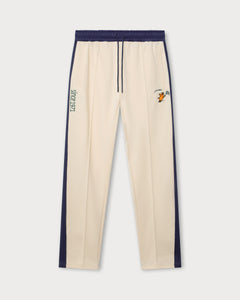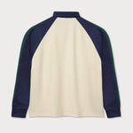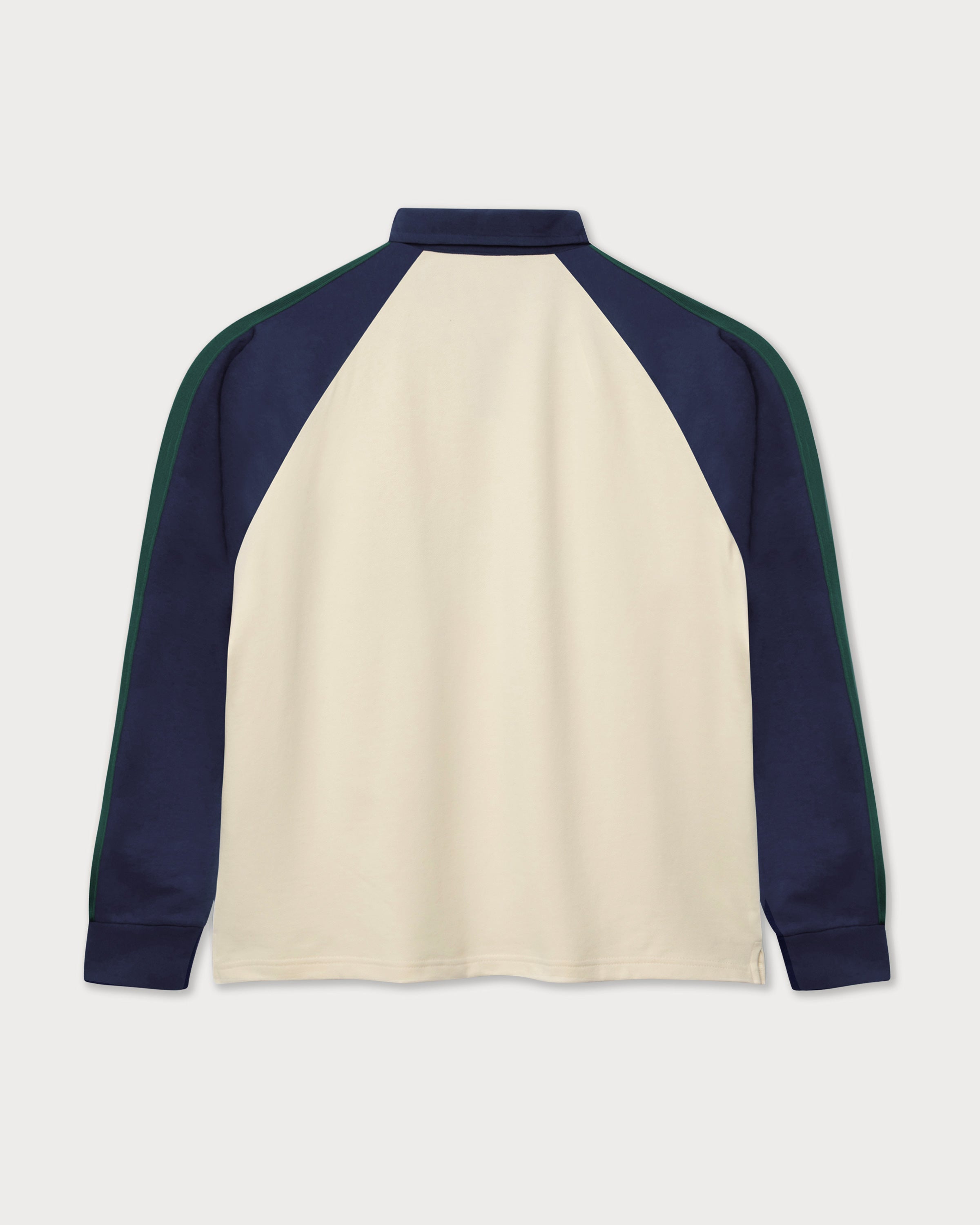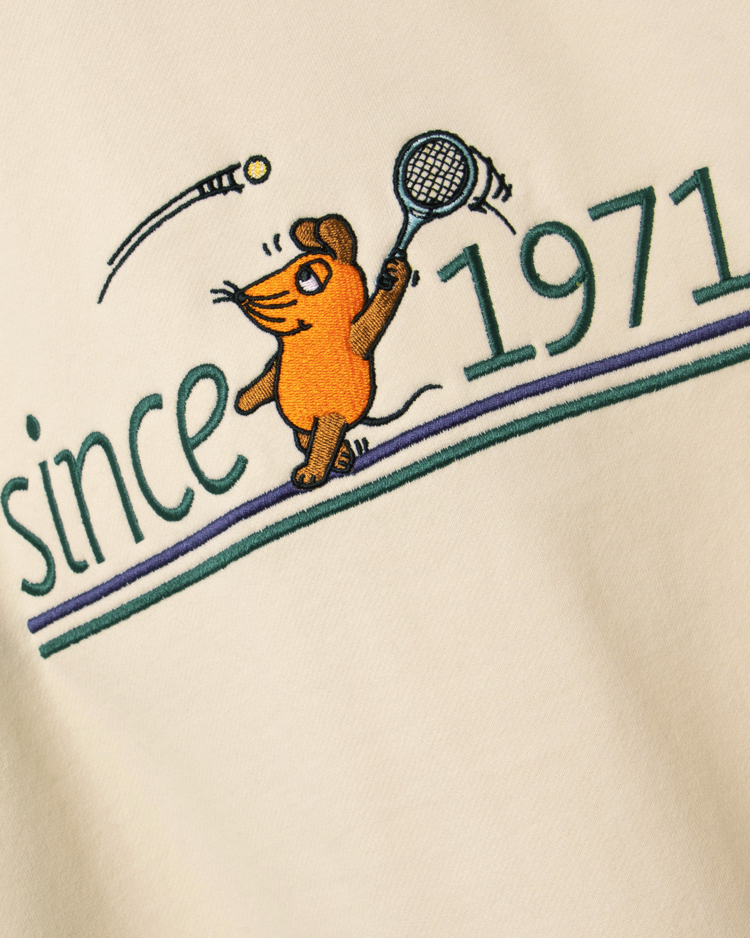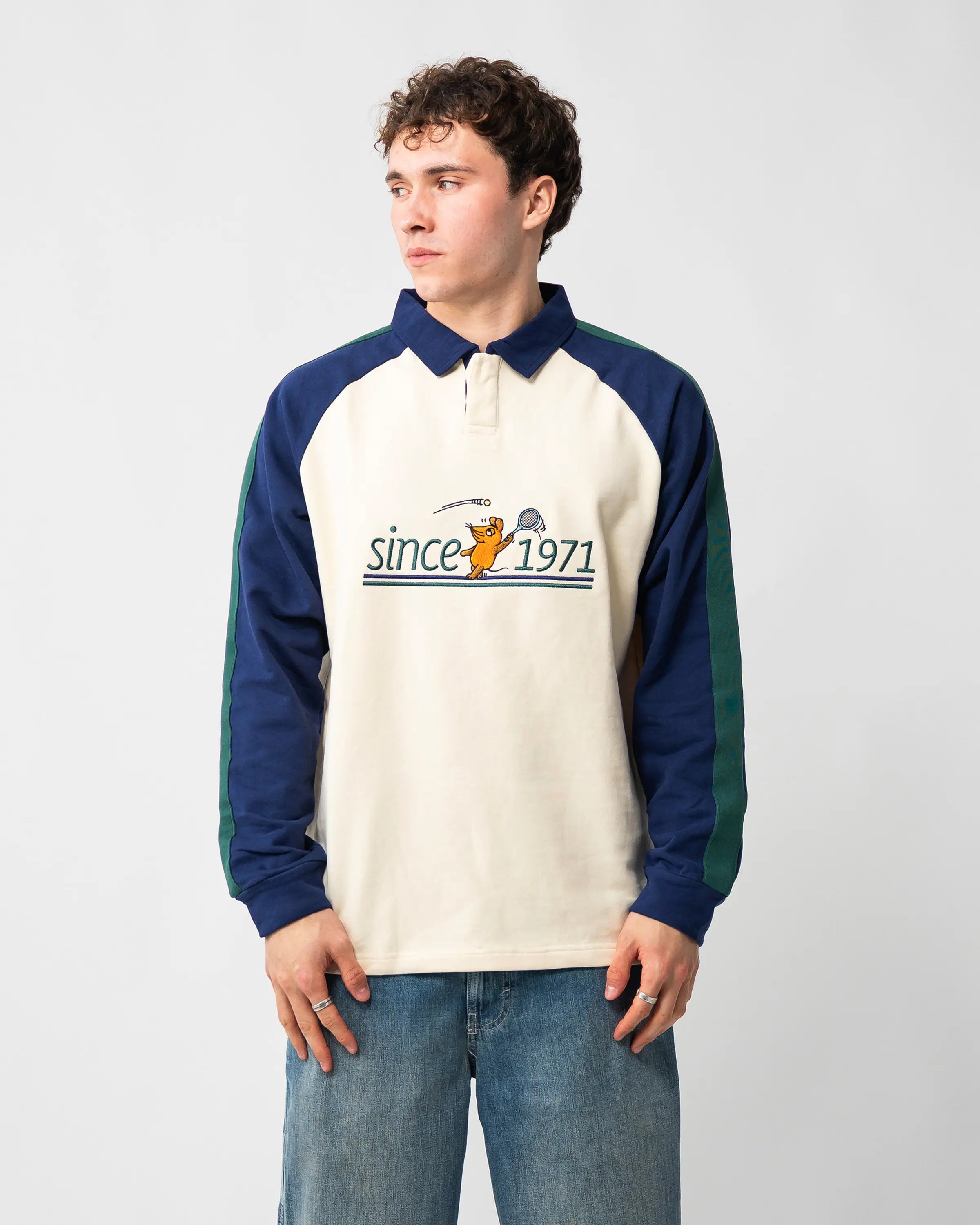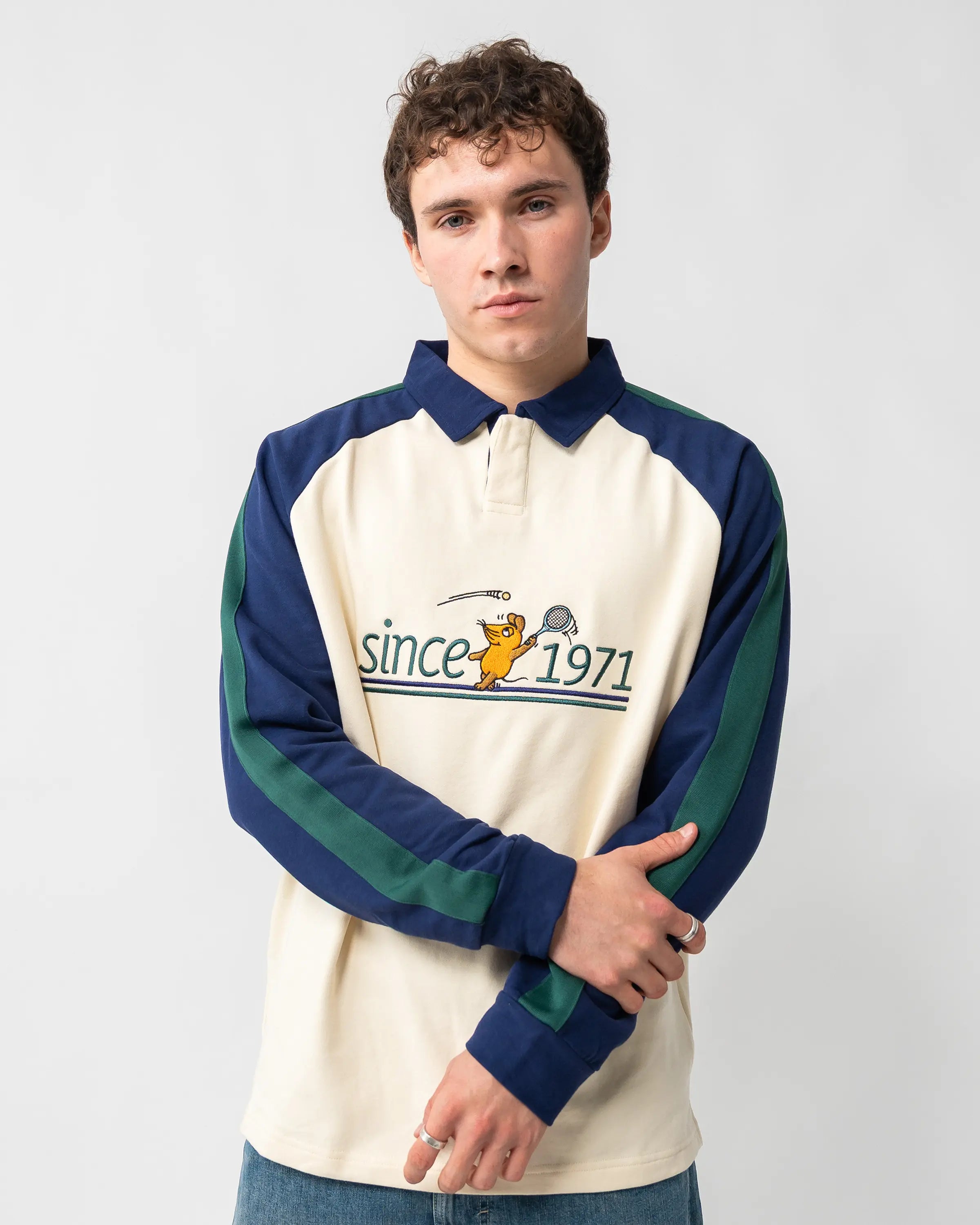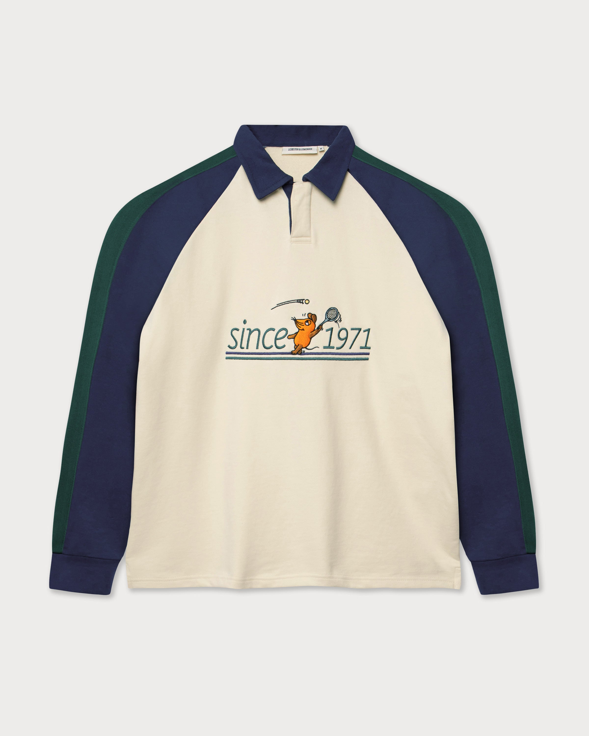The mouse playing tennis is embroidered on the front of this cream-colored tennis polo, embedded in the distinctive "since 1971" lettering. The navy raglan sleeves with contrasting dark green stripes and the classic polo collar with a concealed 2-button placket give the long-sleeve a sporty heritage look.
