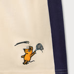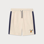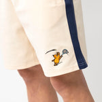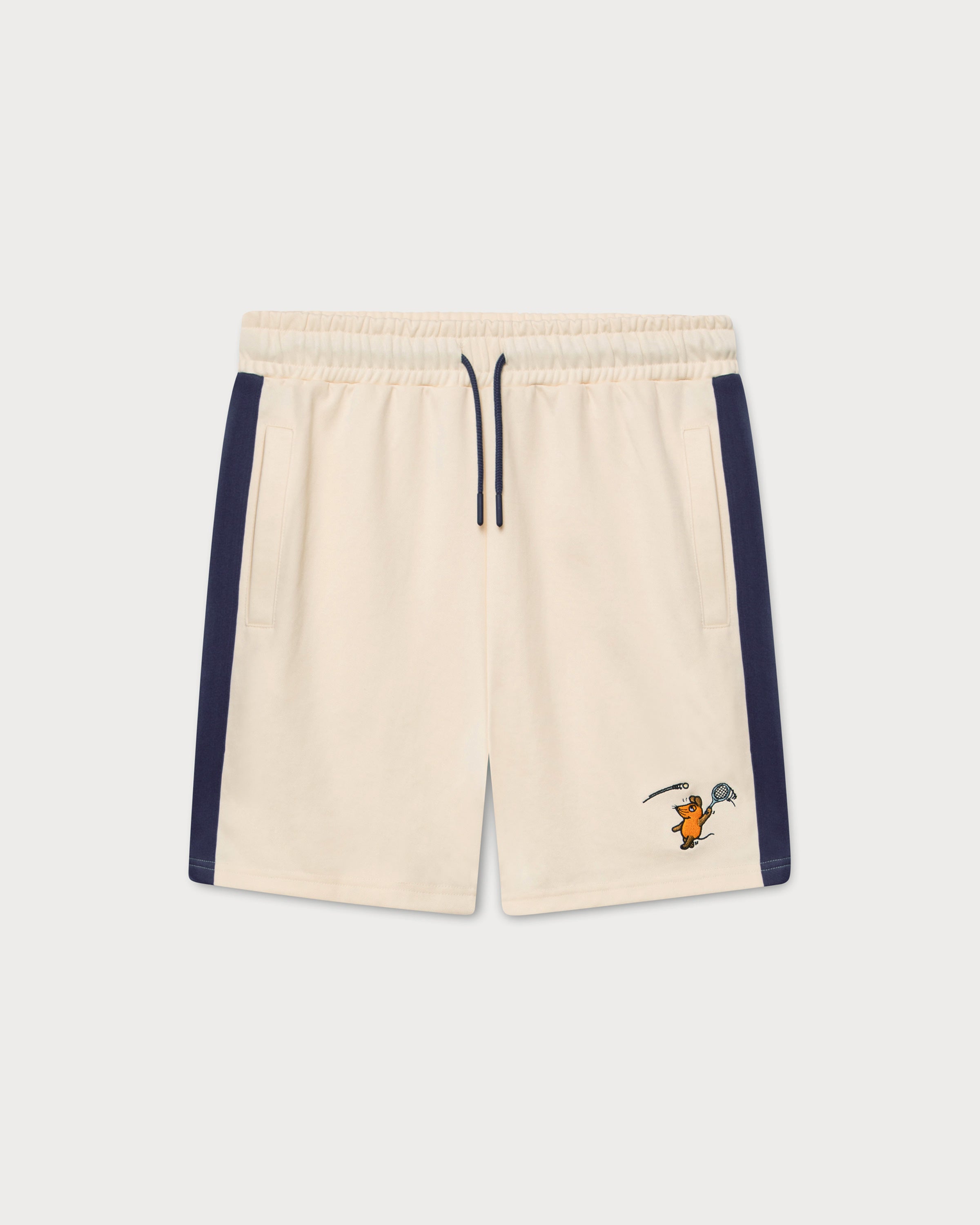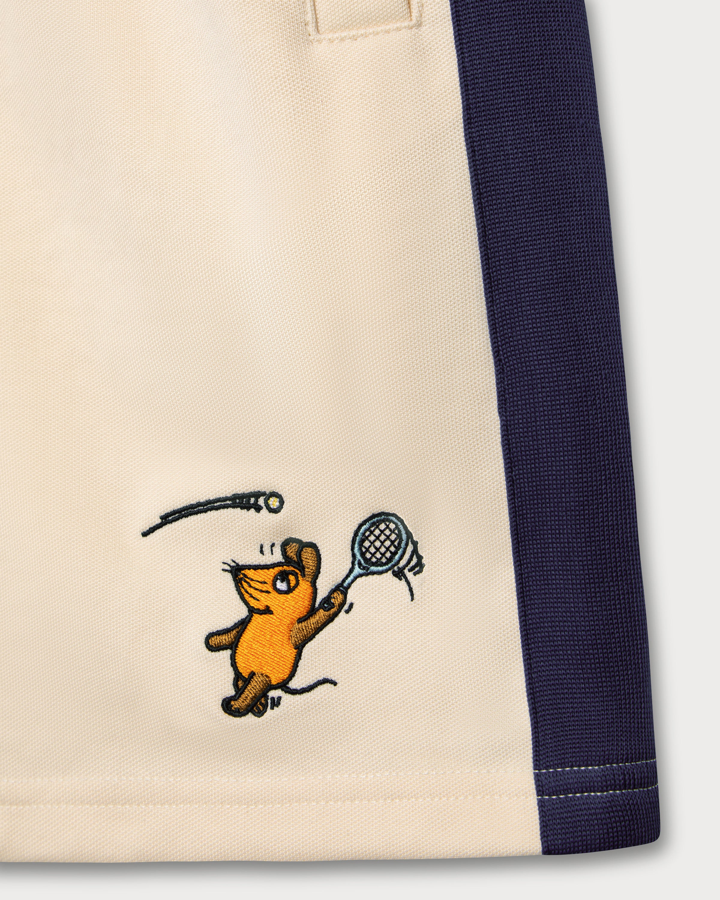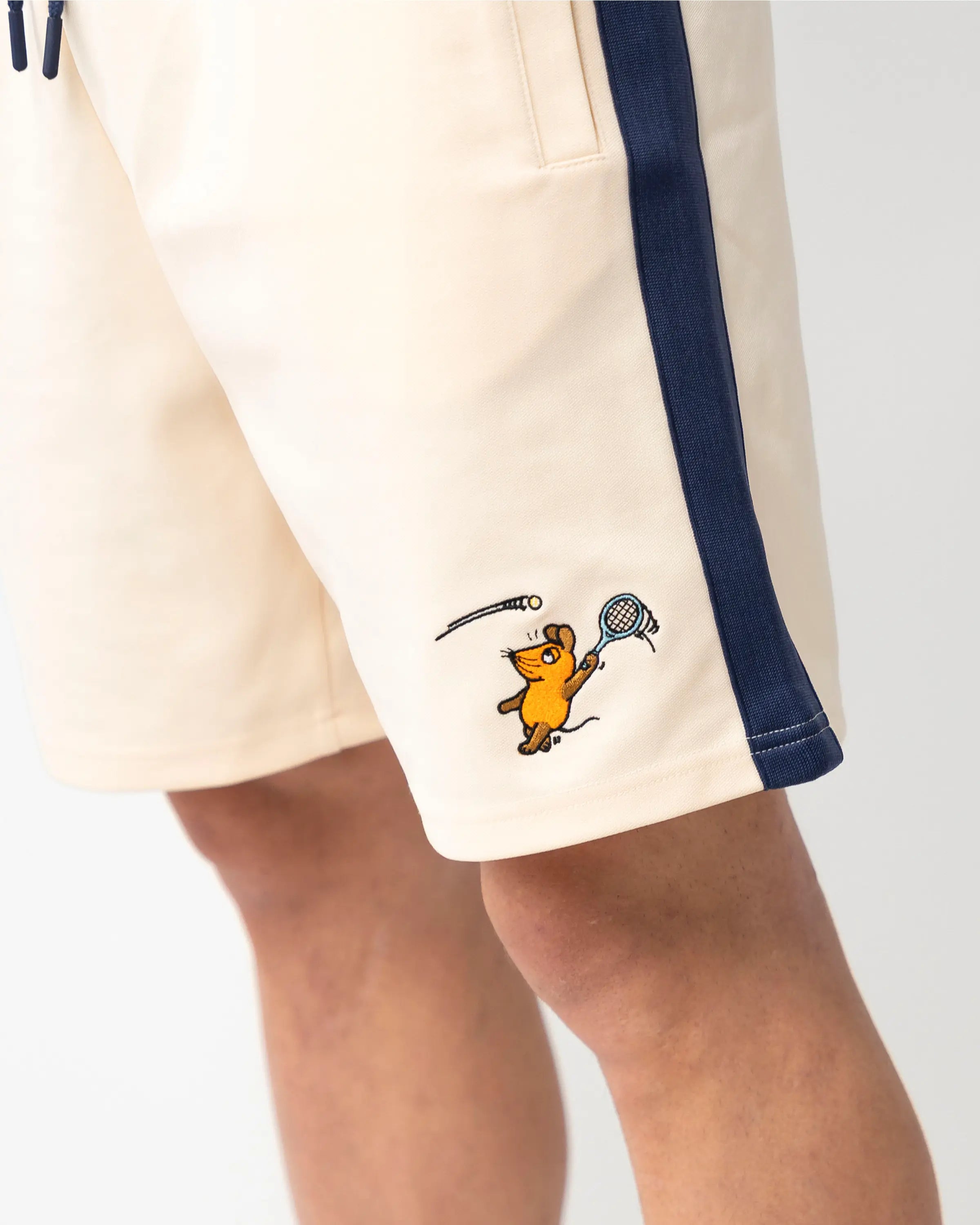 The mouse playing tennis is featured as a high-quality embroidery on the left leg of these cream-colored tennis shorts. The contrasting side stripes in navy and the practical side pockets give the shorts a sporty retro look.