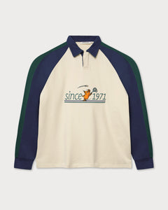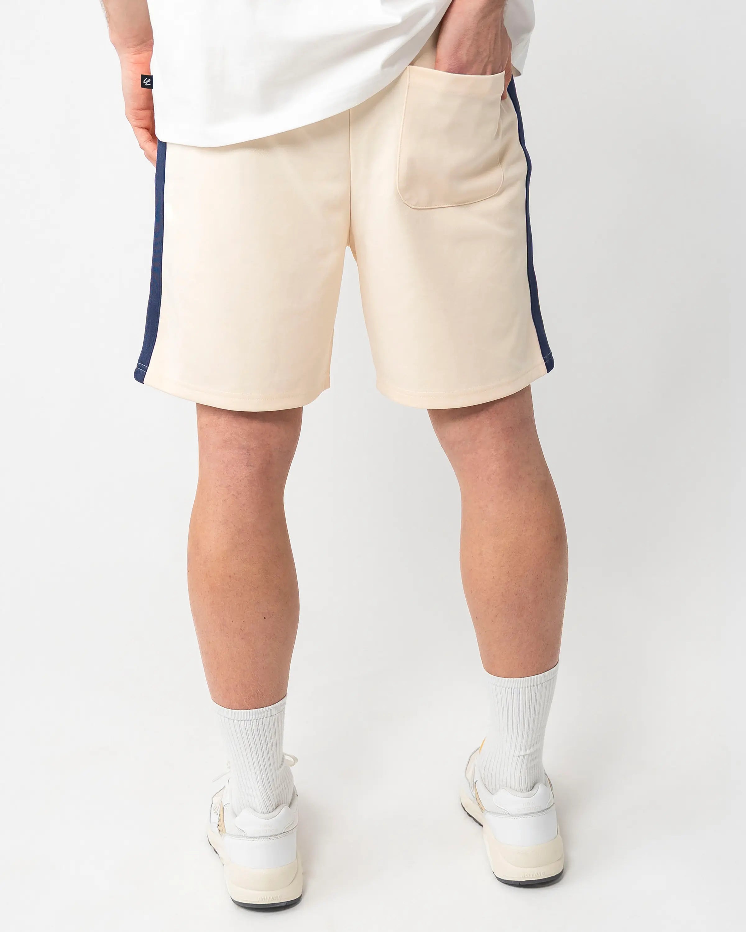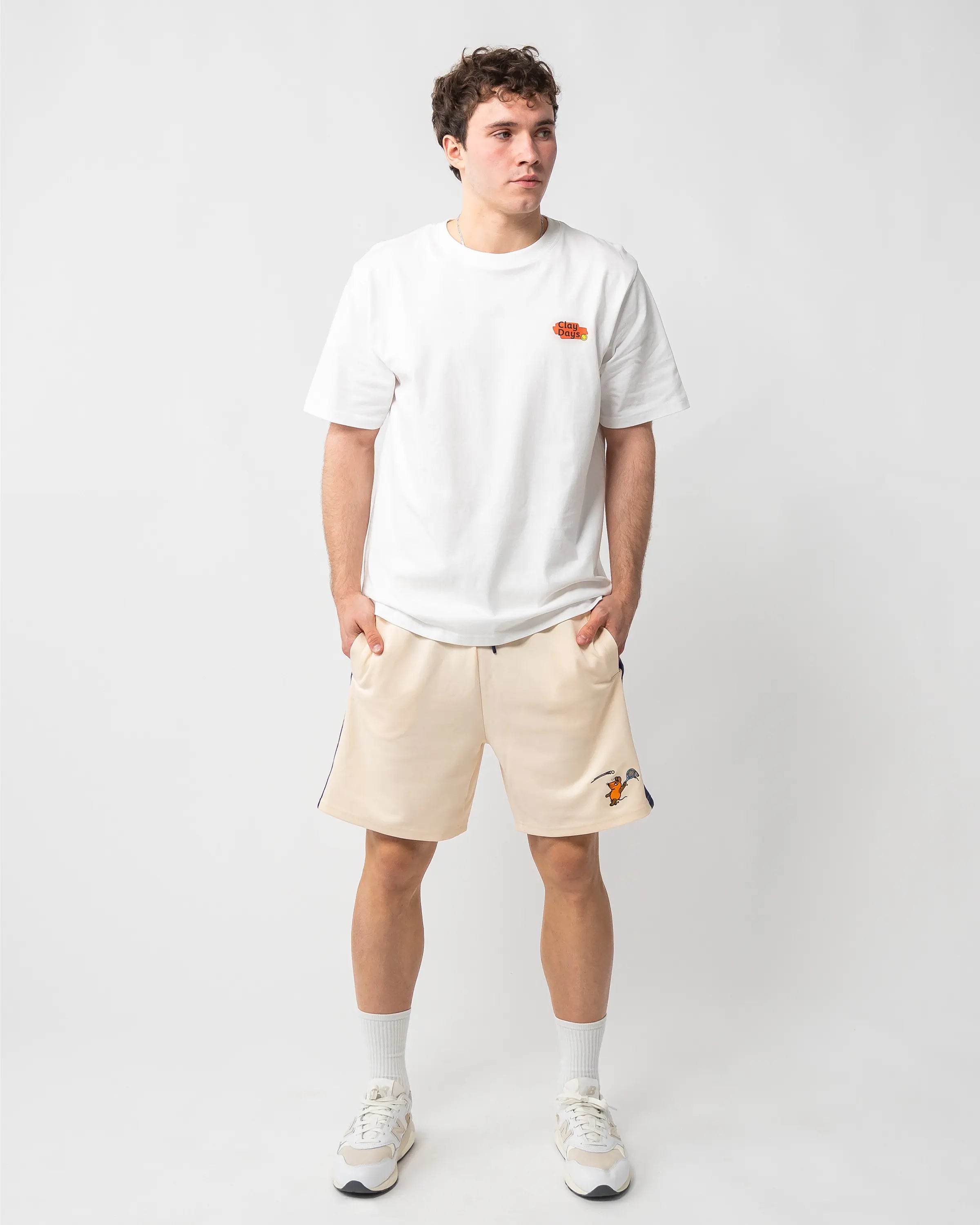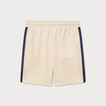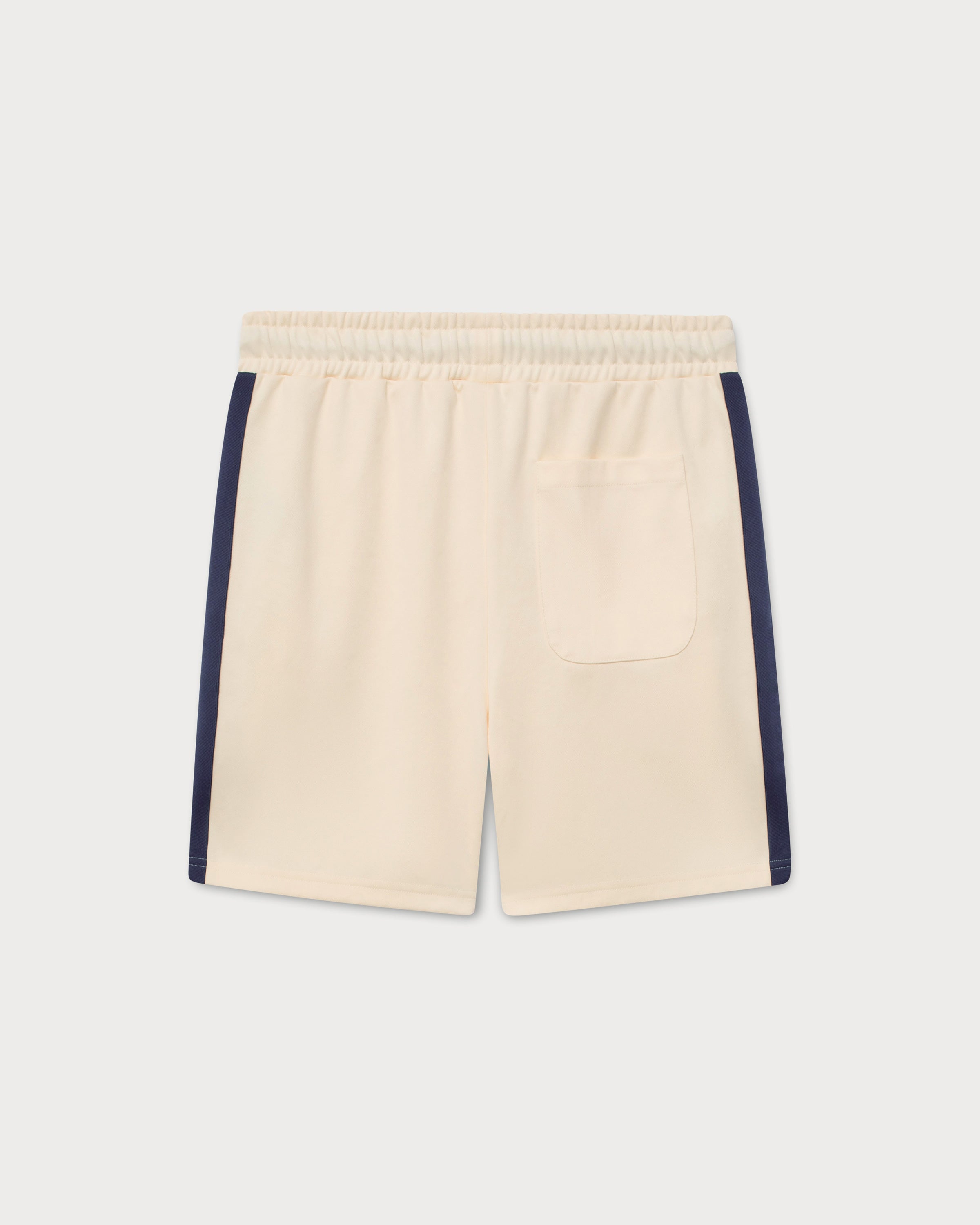 The mouse playing tennis is featured as a high-quality embroidery on the left leg of these cream-colored tennis shorts. The contrasting side stripes in navy and the practical side pockets give the shorts a sporty retro look.