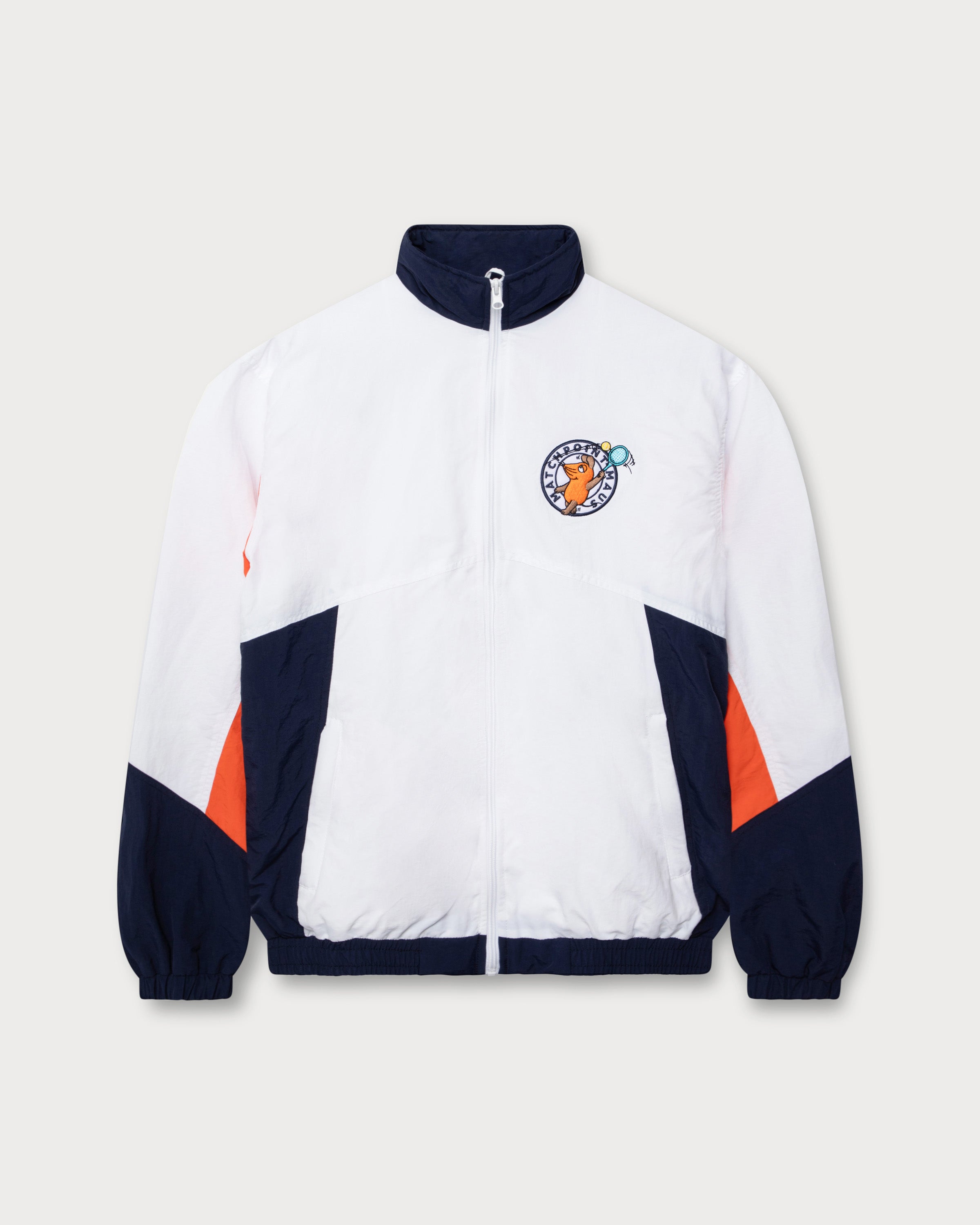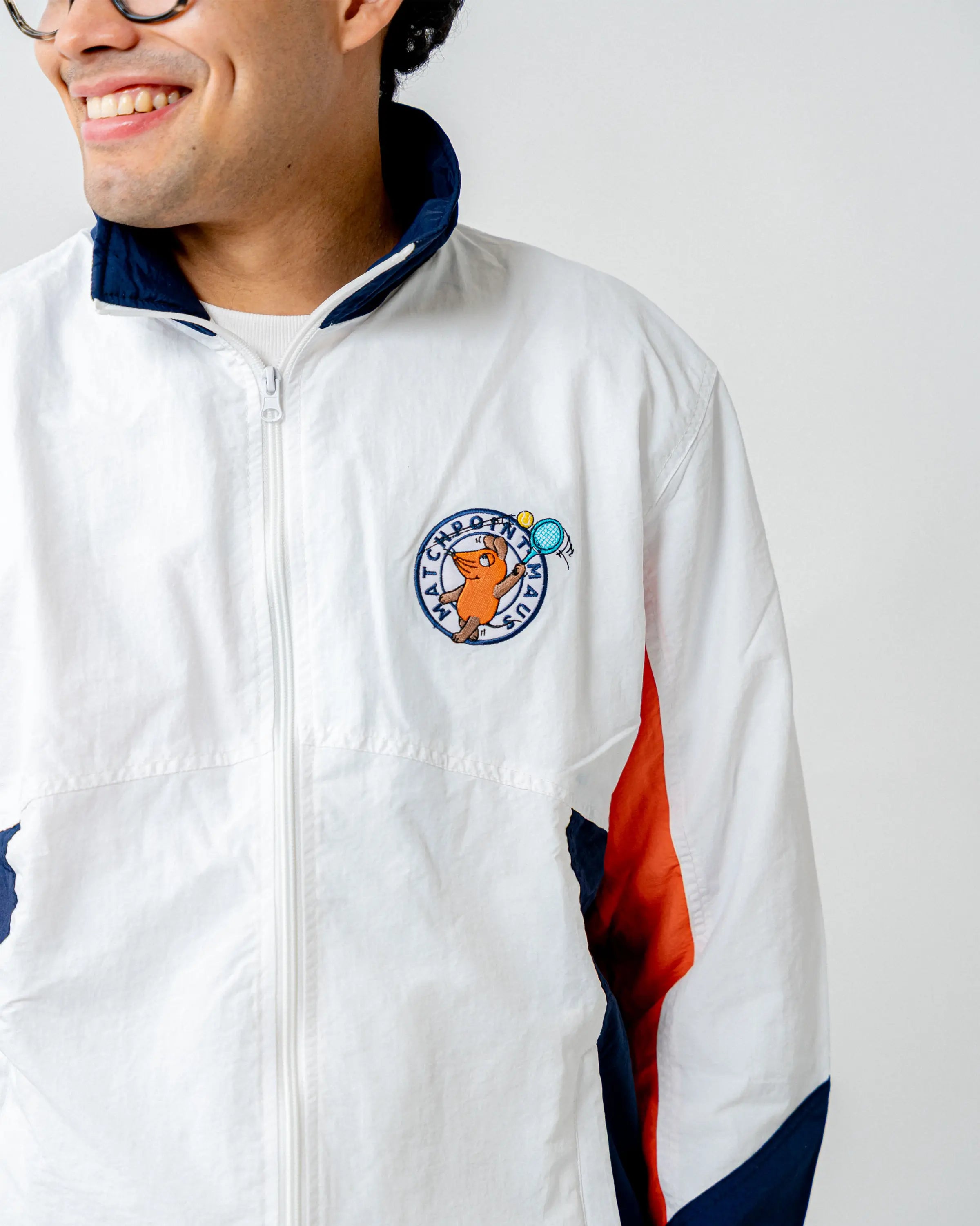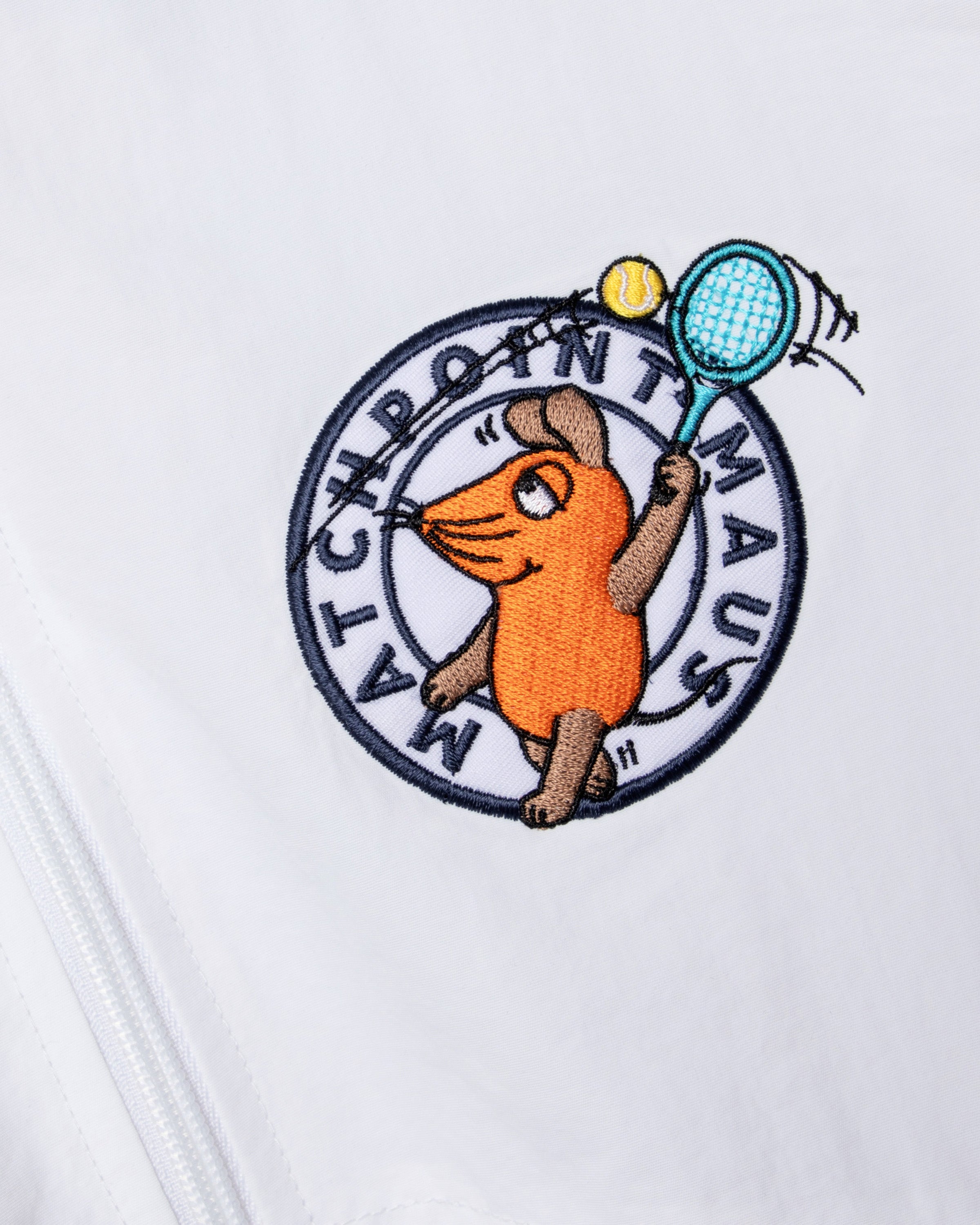 On the front of this sporty tennis jacket, the mouse is featured as a high-quality embroidered patch at match point, encircled by the circular "MATCHPOINT MAUS" lettering. The multicolored design in white, navy, and orange combined with the lightweight nylon fabric gives the jacket a sporty look straight from the court.