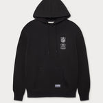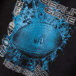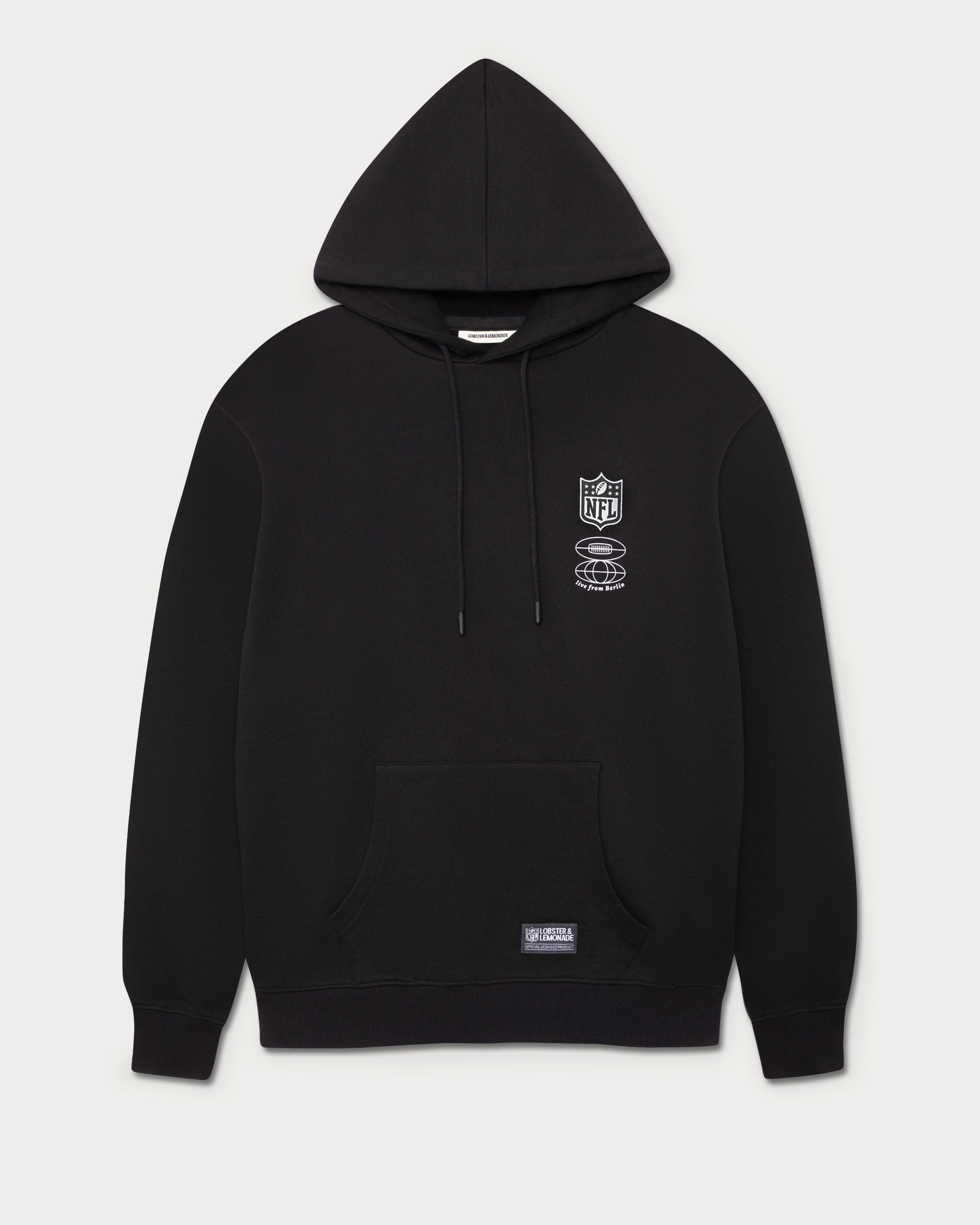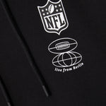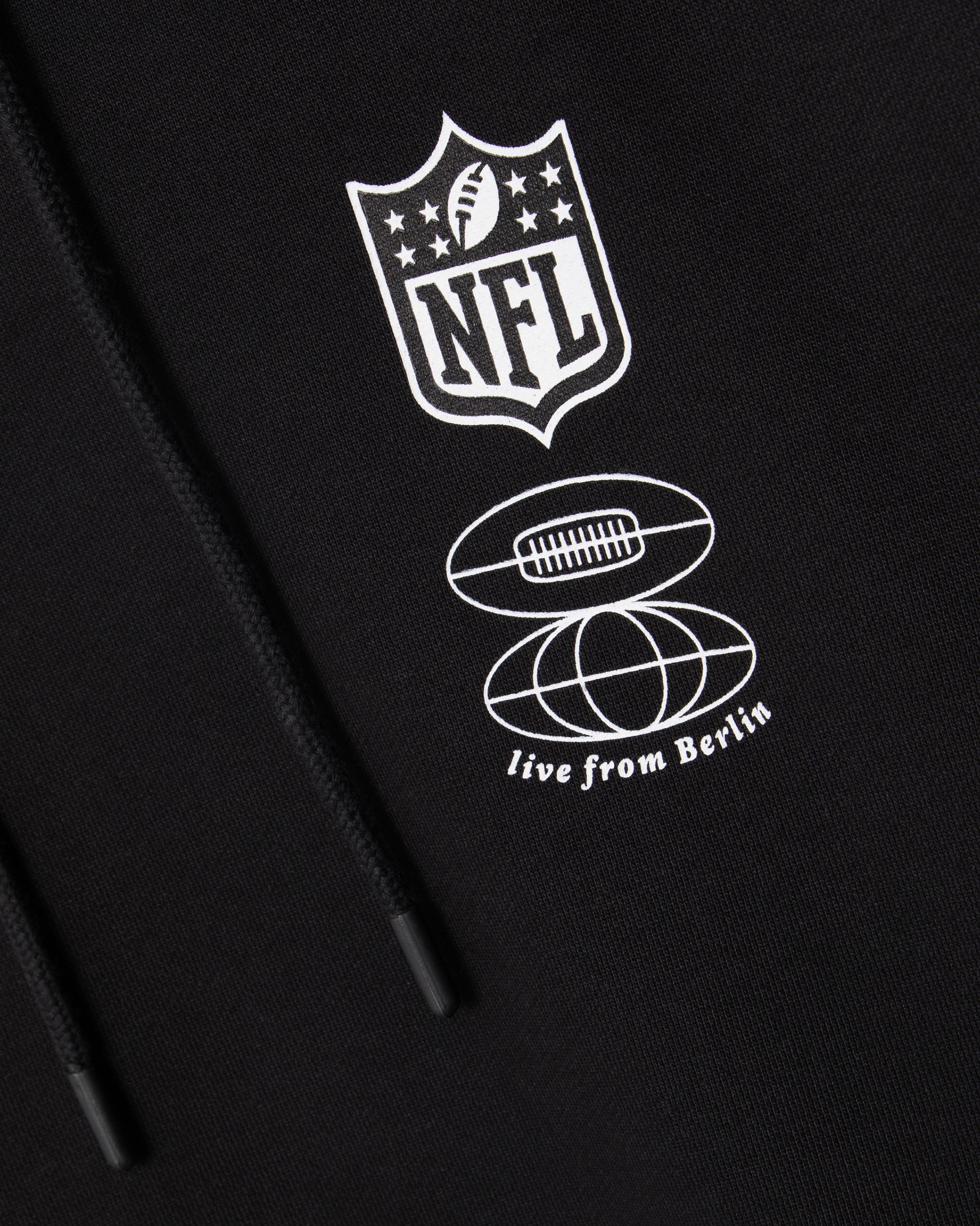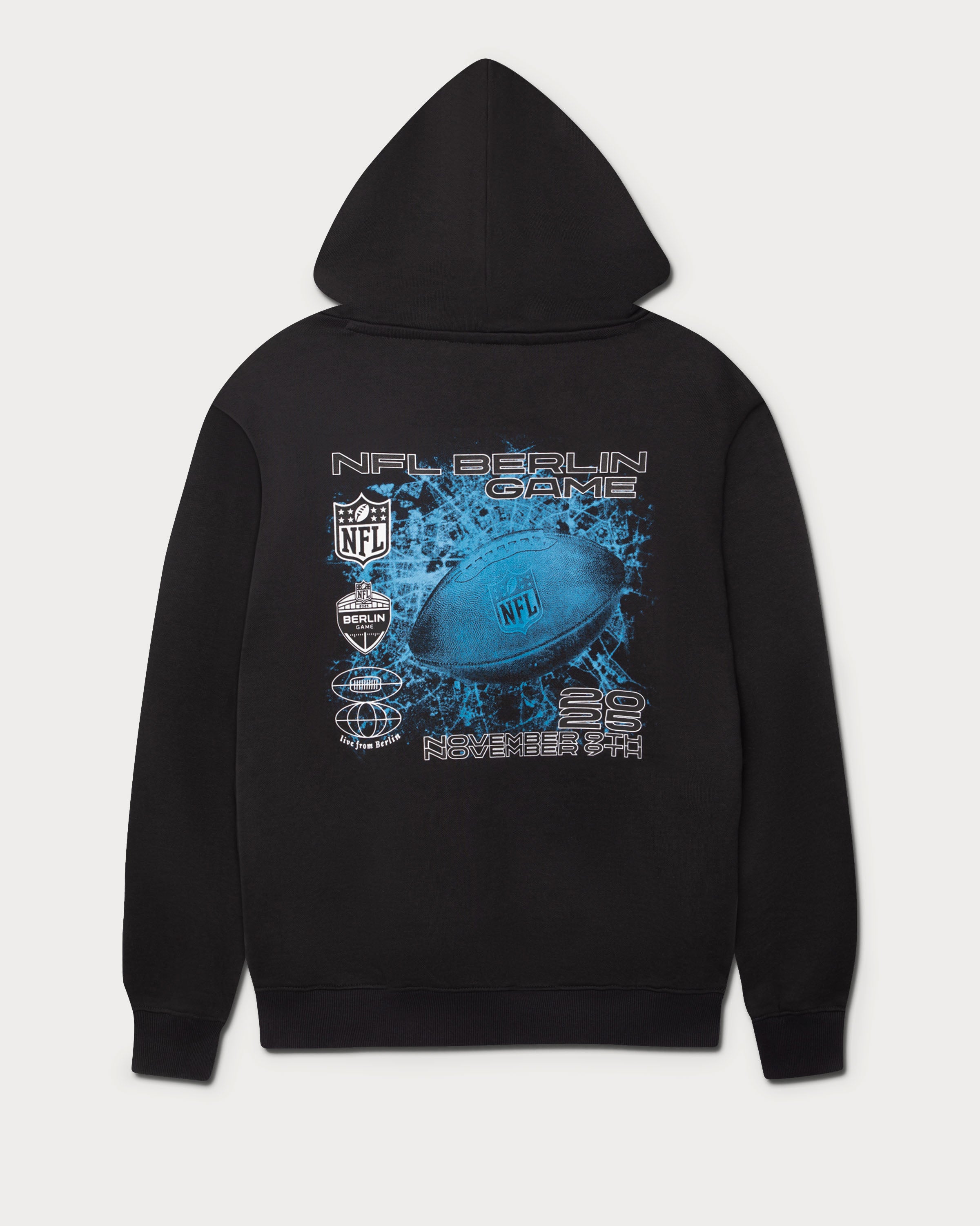 The black NFL Berlin Game 2025 hoodie features a large back print of an American football against a satellite image of Berlin. The graphic is framed by NFL Berlin Game lettering and NFL logos.