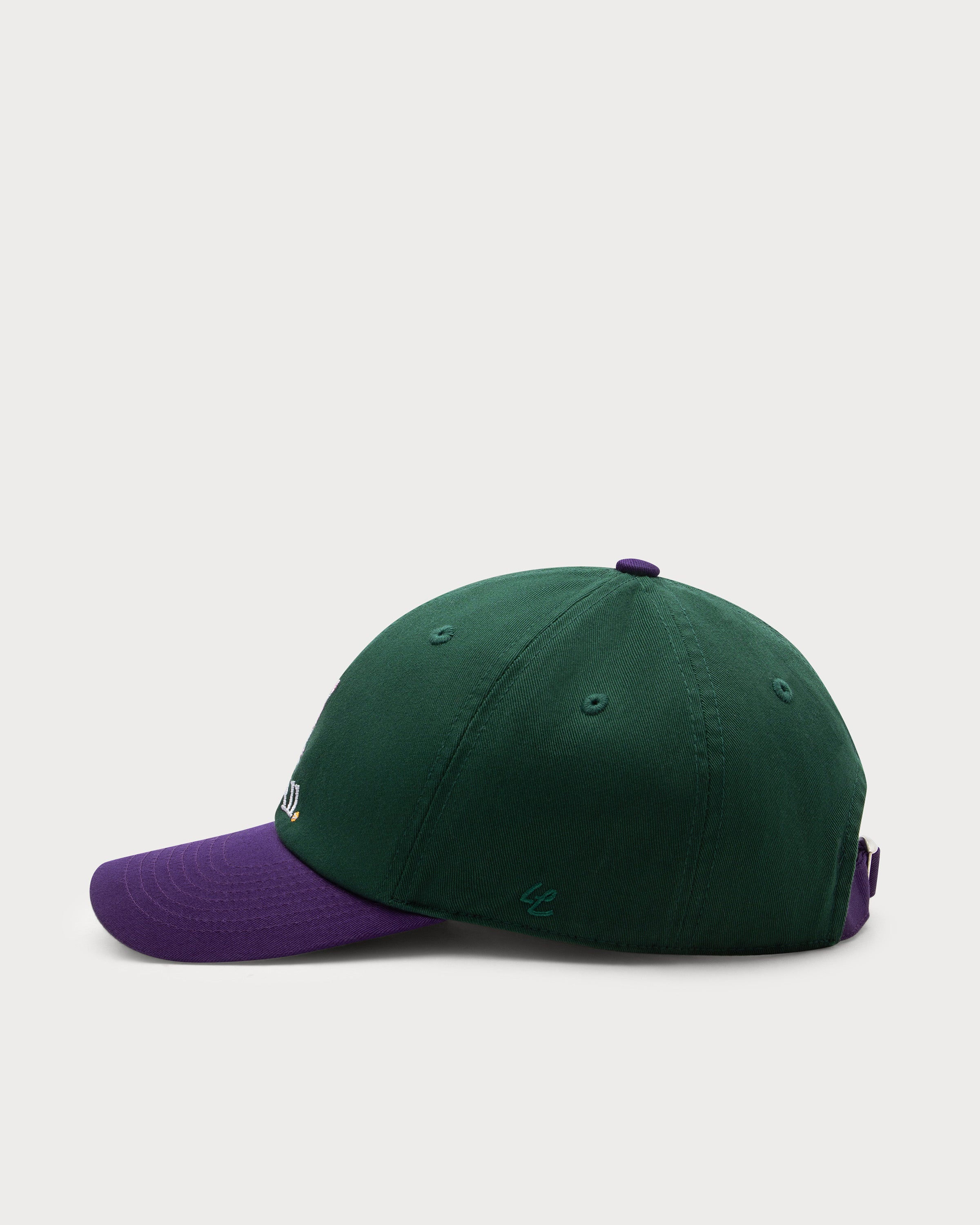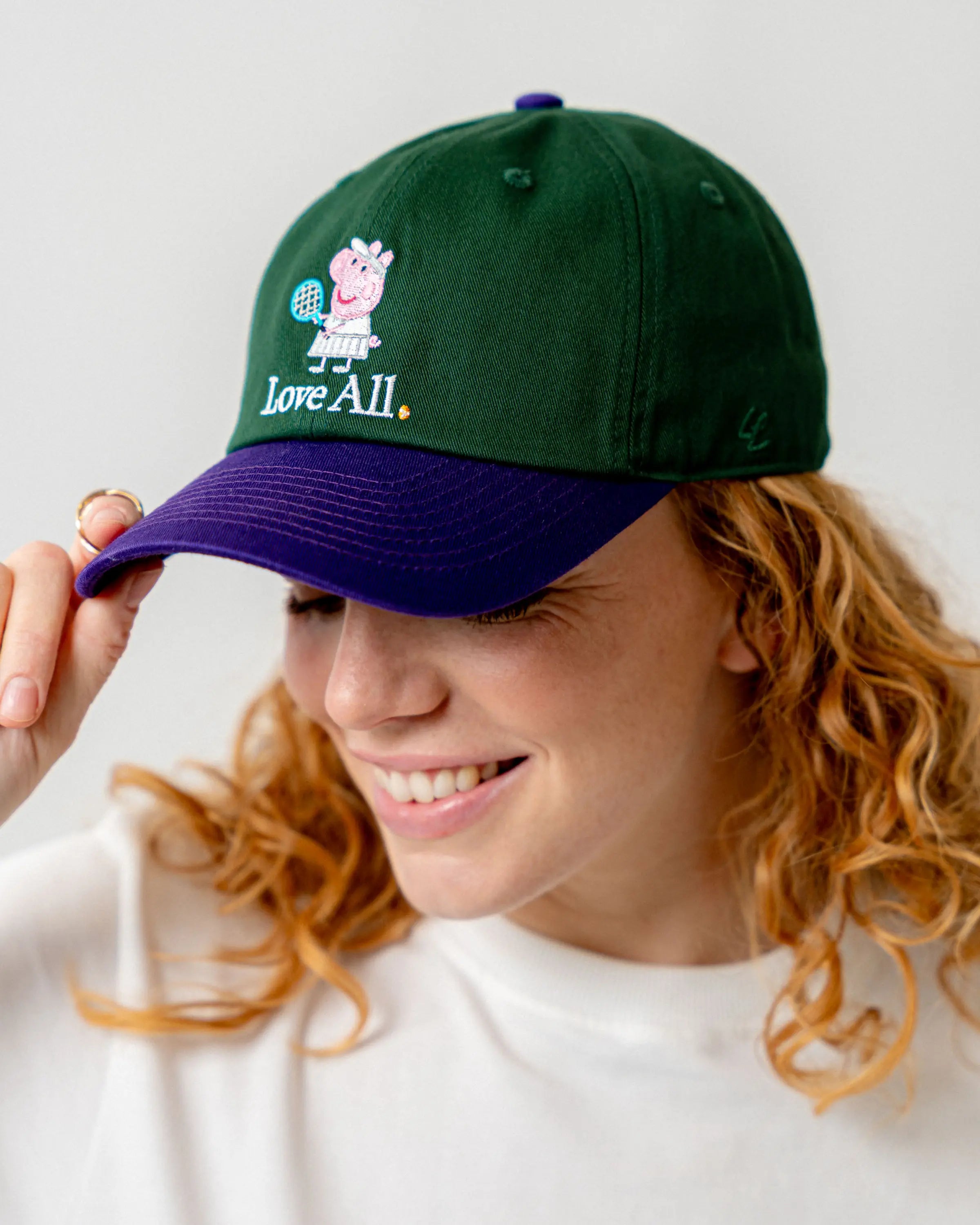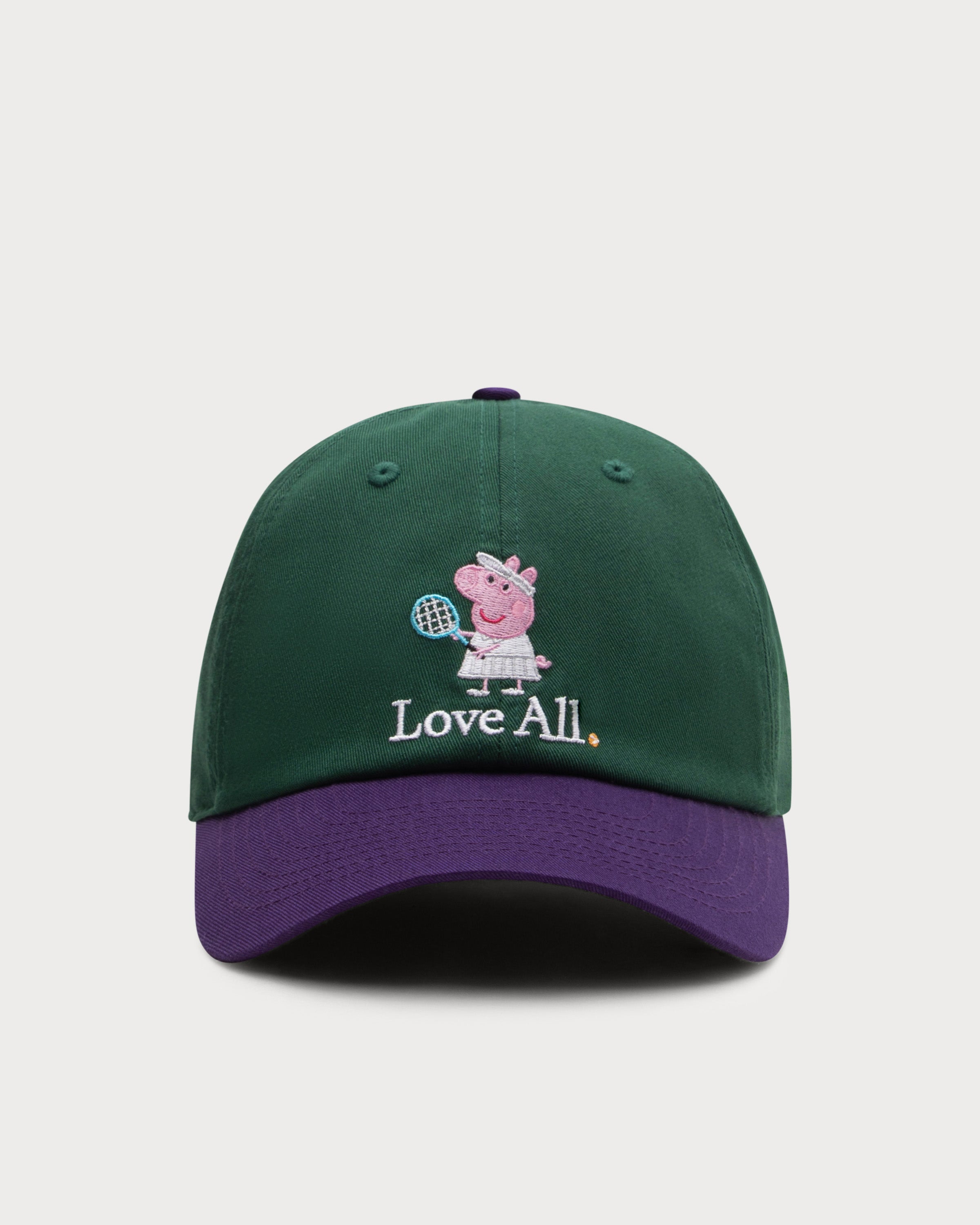 Peppa Pig in a tennis outfit adorns the front of this two-tone tennis cap as a delicate embroidery. The minimalist "Love All." lettering emphasizes the timeless look, while the harmonious color combination of dark green and dark purple perfectly rounds off the characteristic retro look.