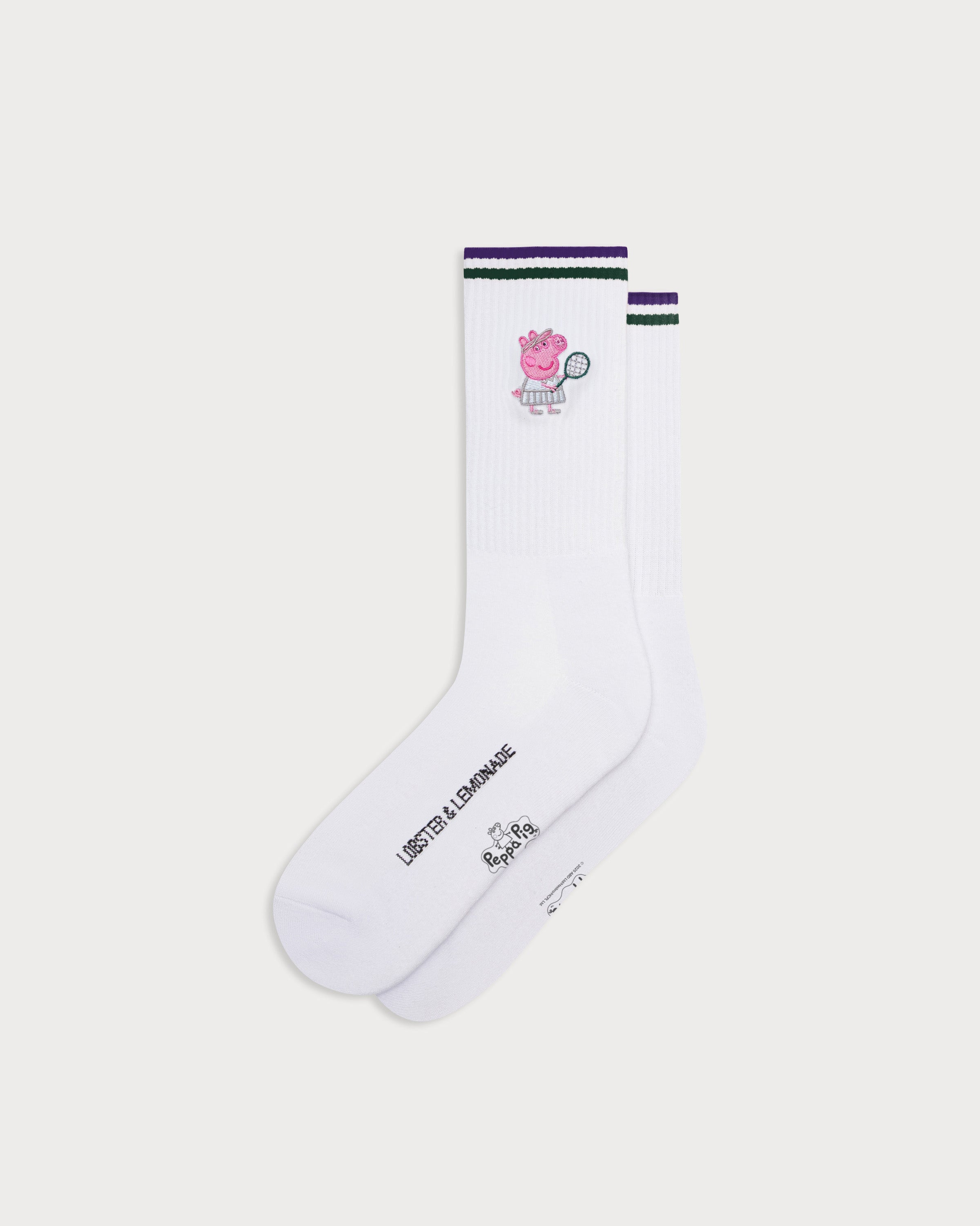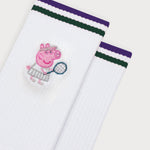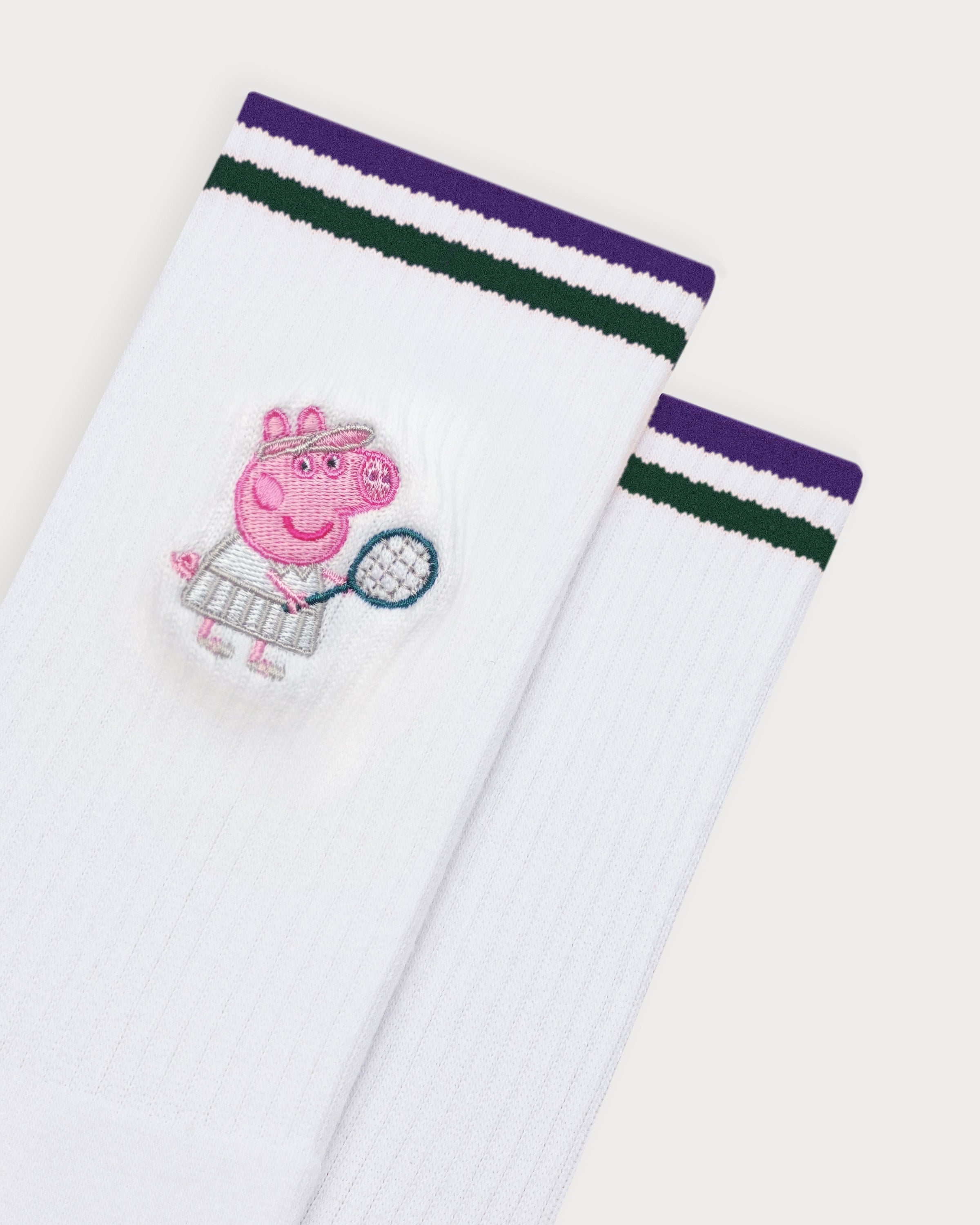 Peppa Pig playing tennis is placed as a high-quality embroidery above the ankle and gives the tennis sock a sporty design in combination with the contrasting stripes at the hem.