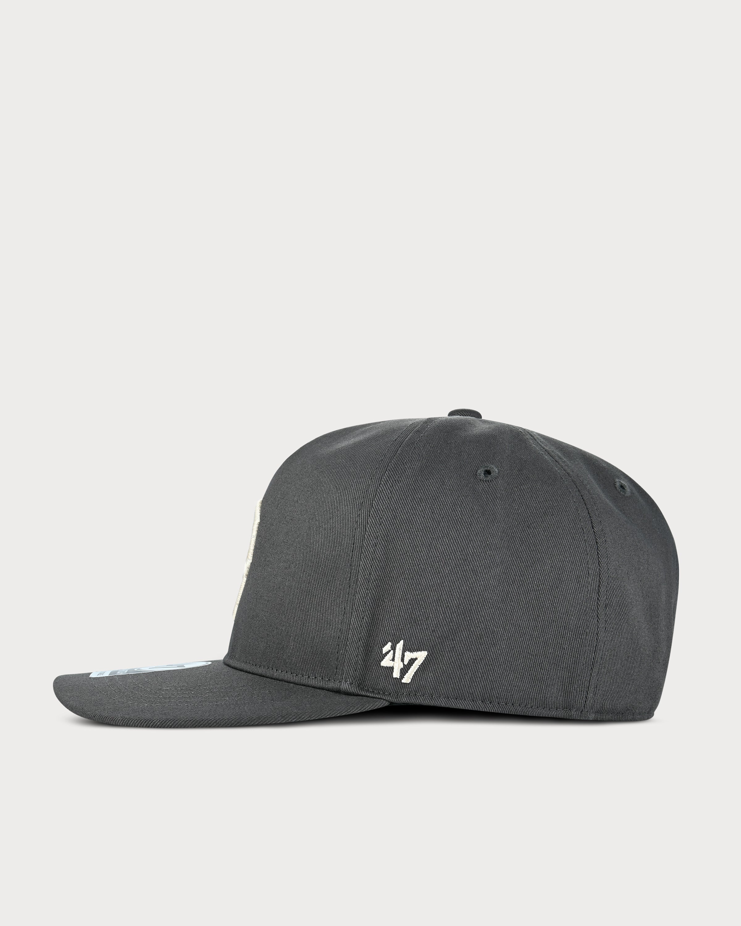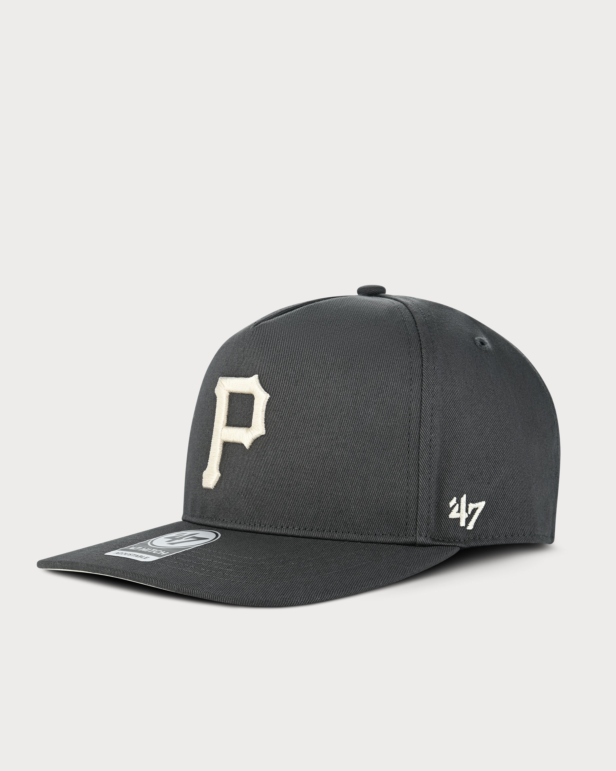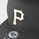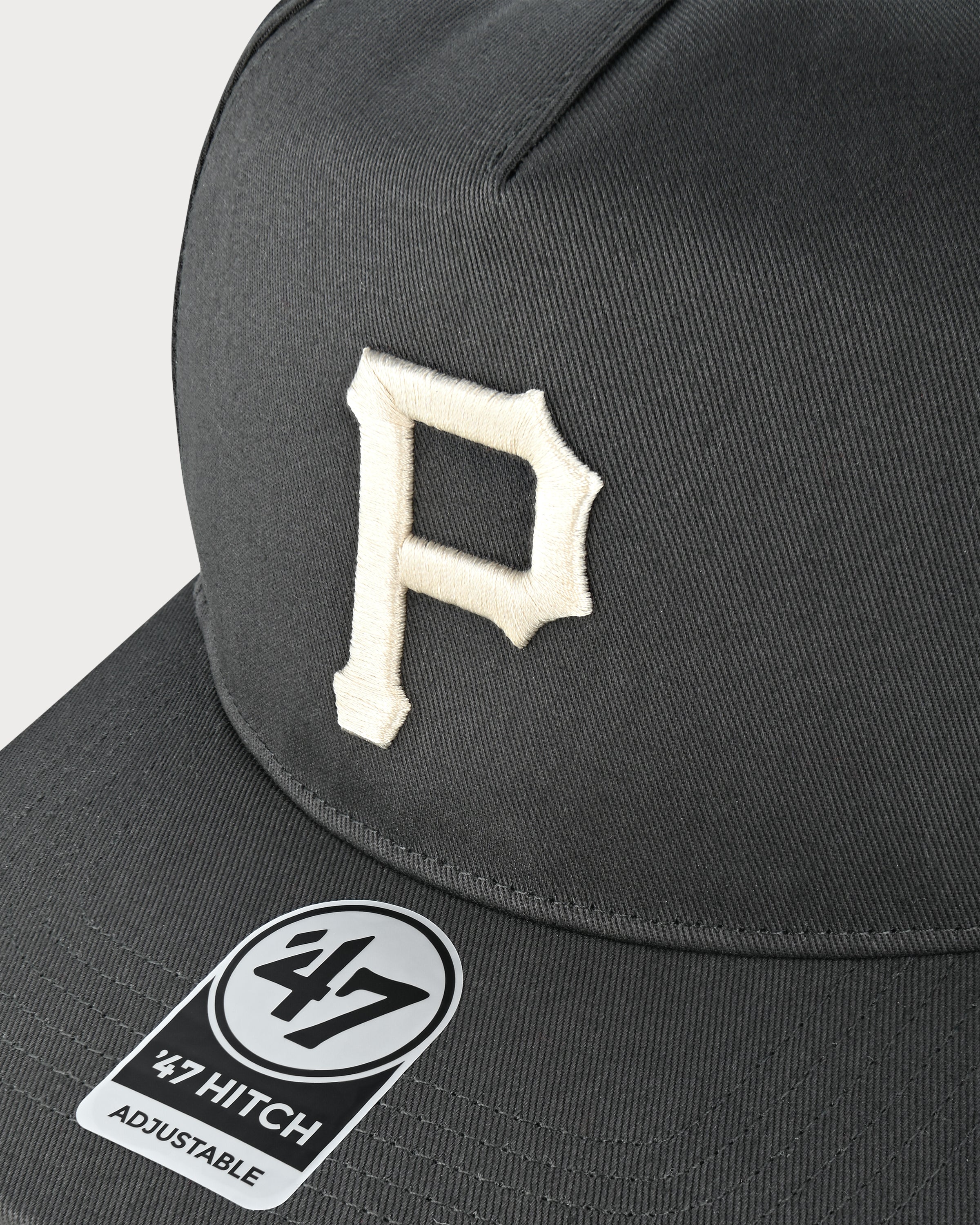 La casquette grise arbore le monogramme P emblématique des Pirates de Pittsburgh sous forme de broderie dorée en relief.
