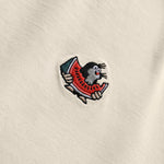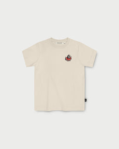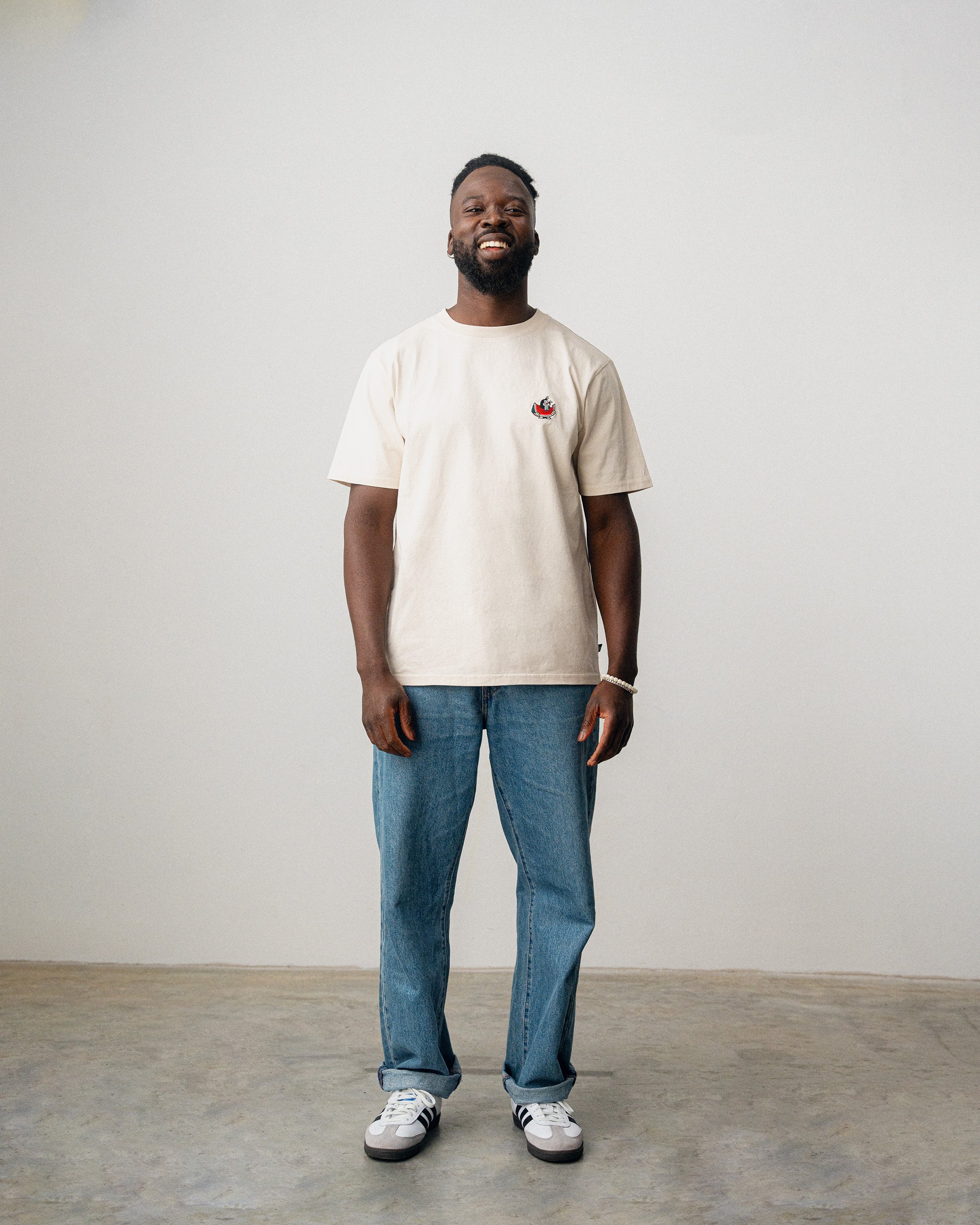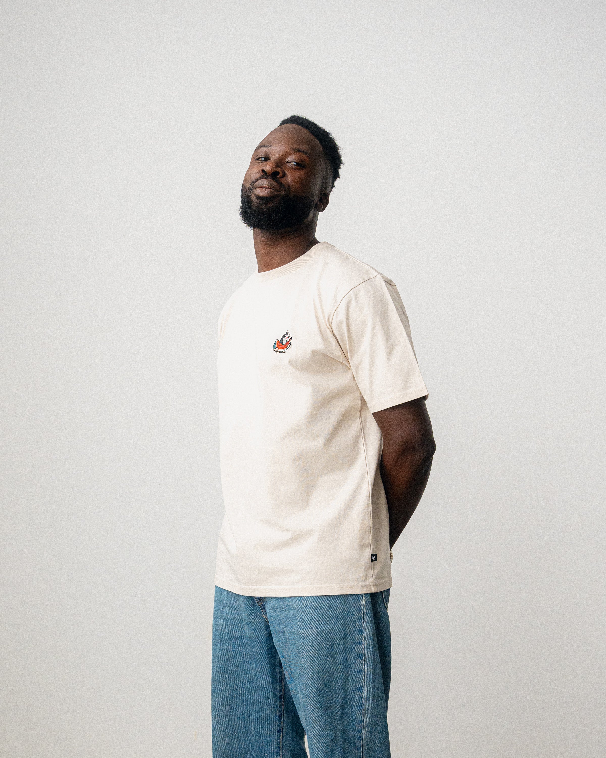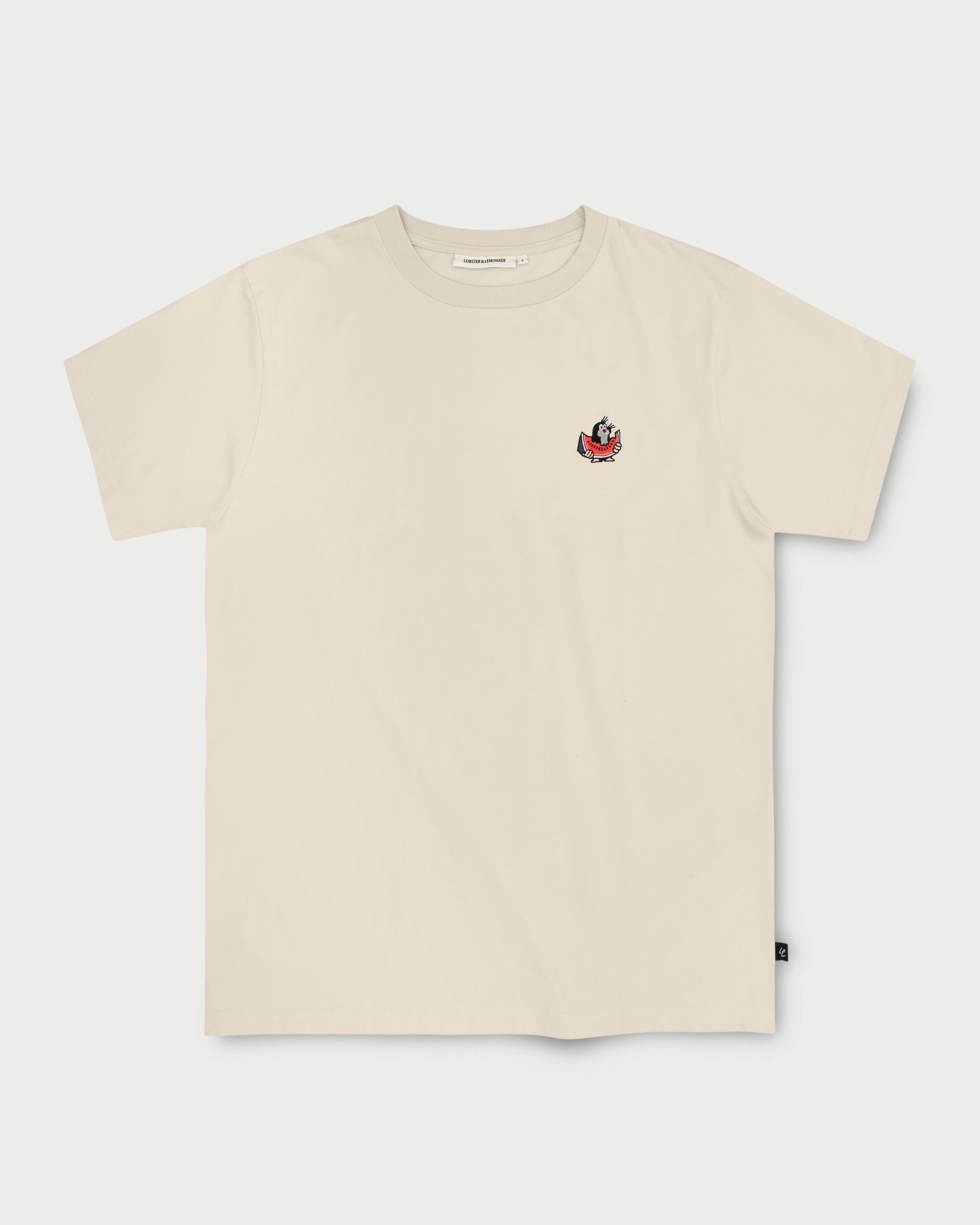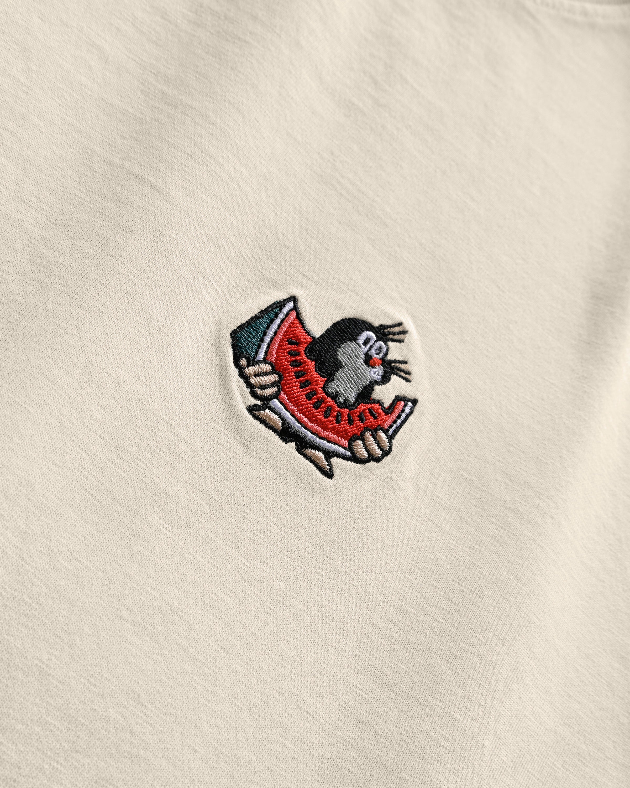Le grain de beauté brodé avec sa délicieuse pastèque apporte une touche subtile au T-shirt beige.