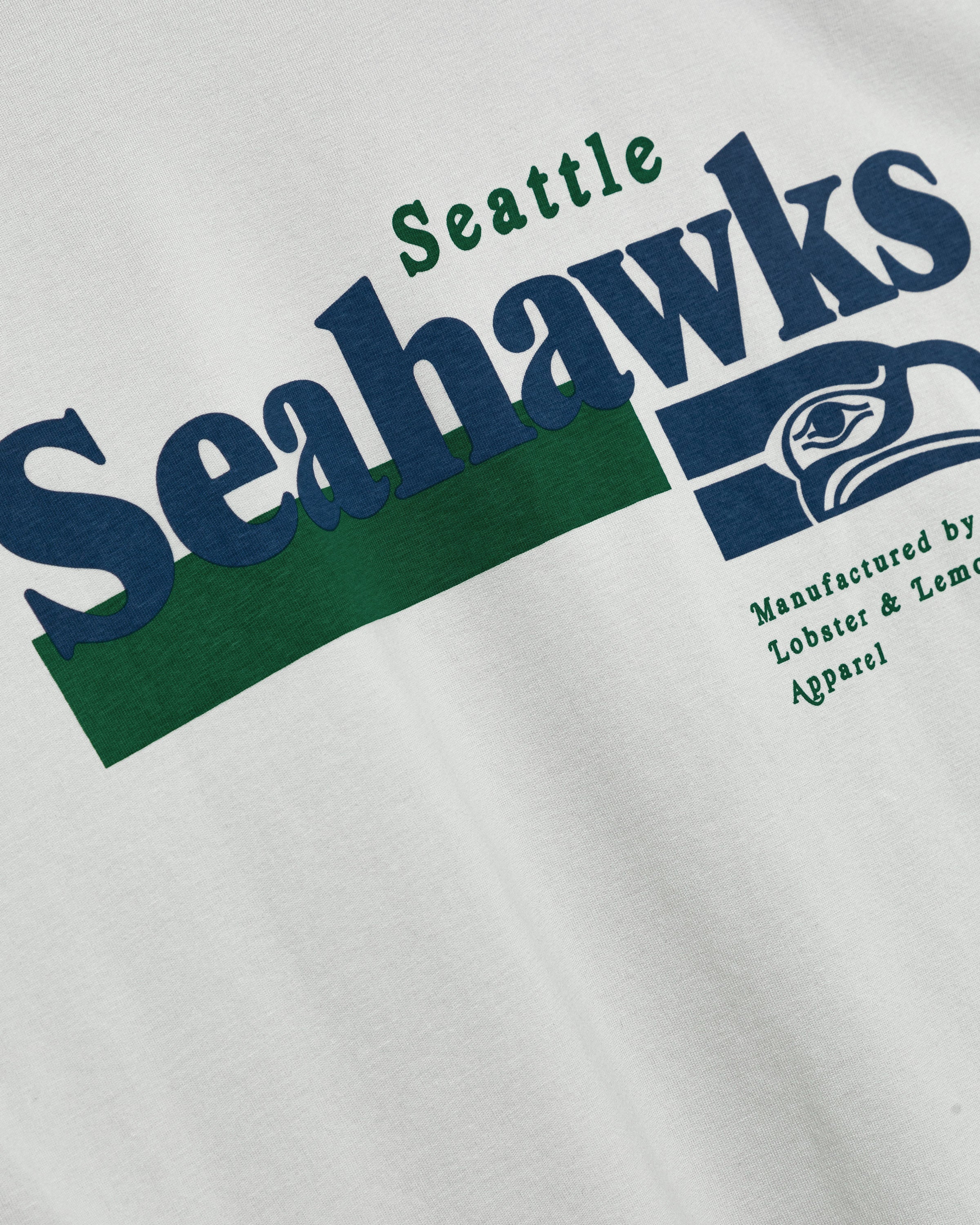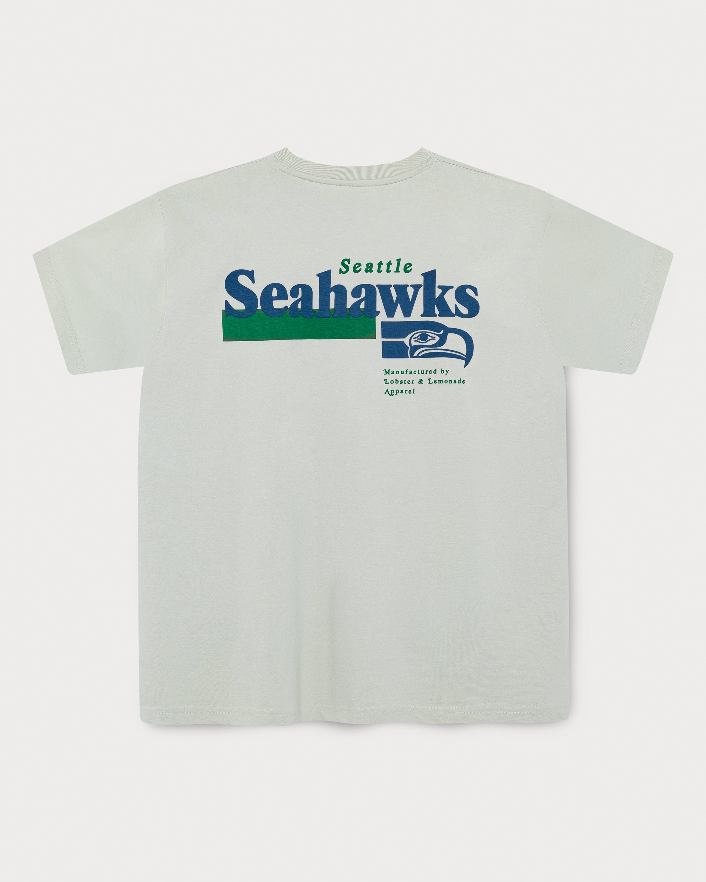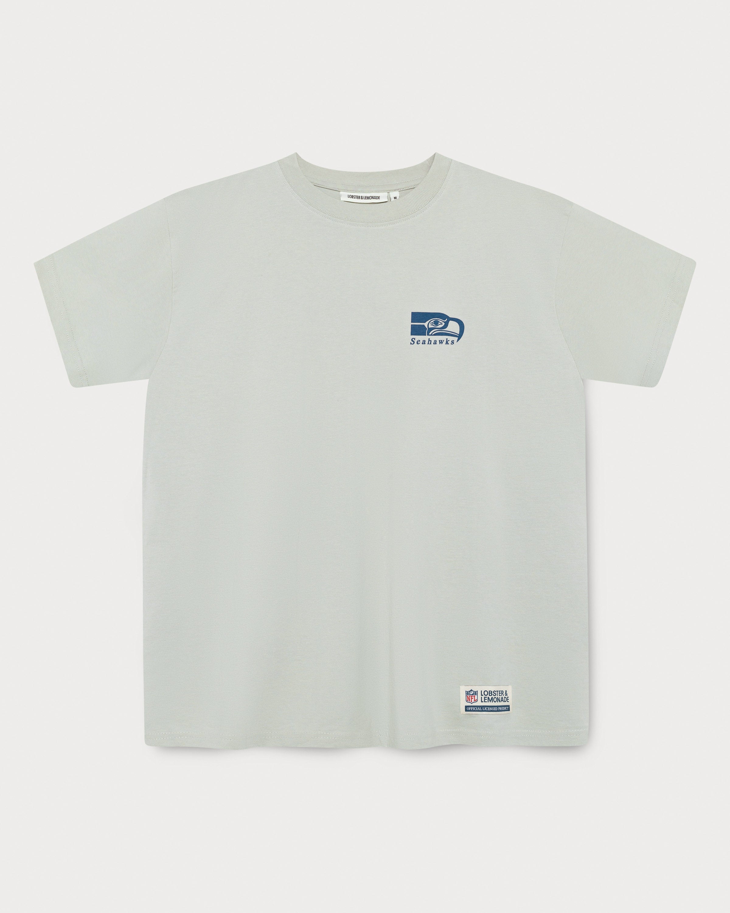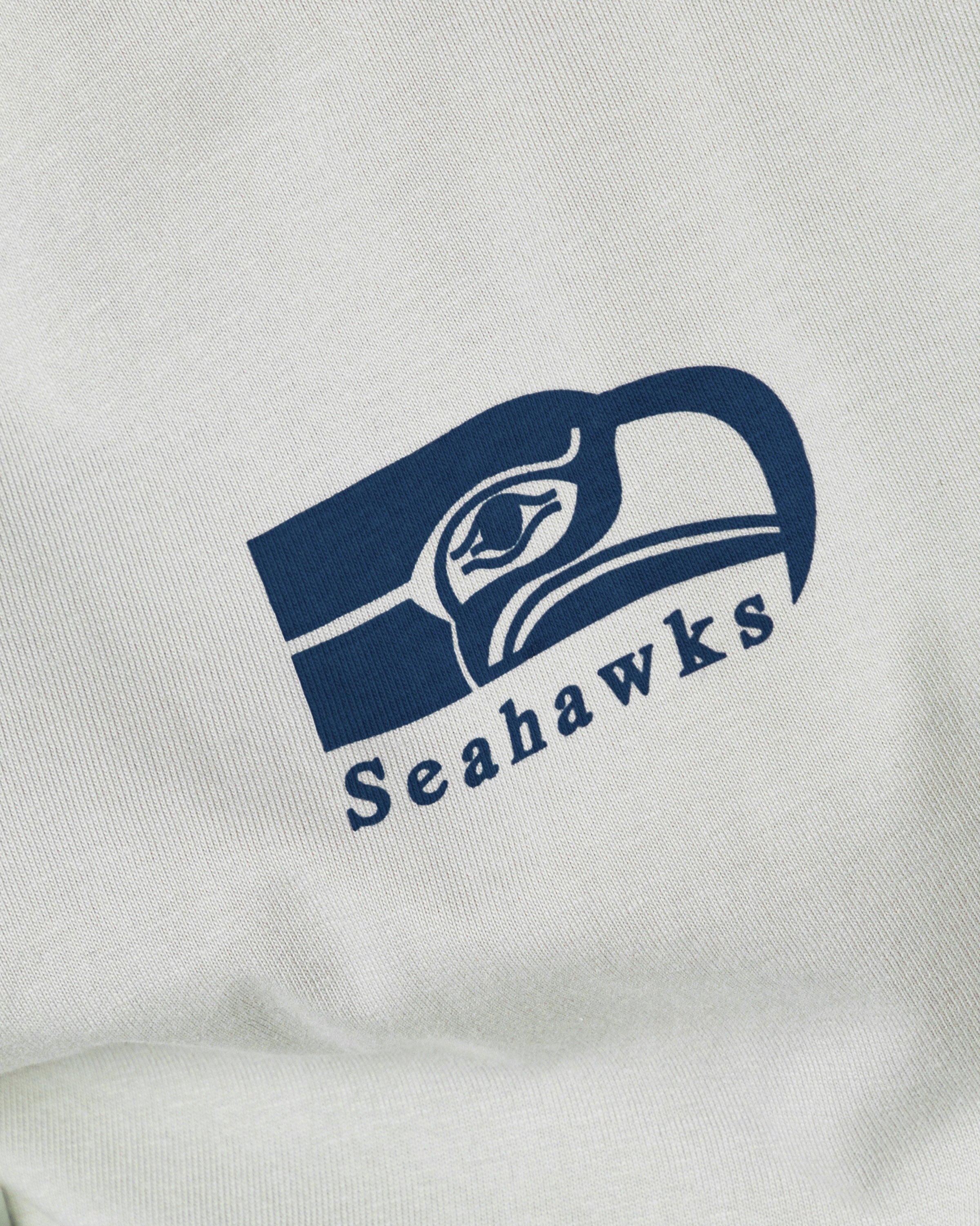 Ce t-shirt gris arbore un grand imprimé des Seattle Seahawks dans le dos, incluant le logo classique de l'équipe. Ce logo est également imprimé en plus petit sur le côté gauche de la poitrine. L'étiquette tissée en toile à la taille complète son look rétro.