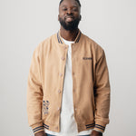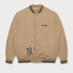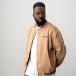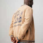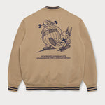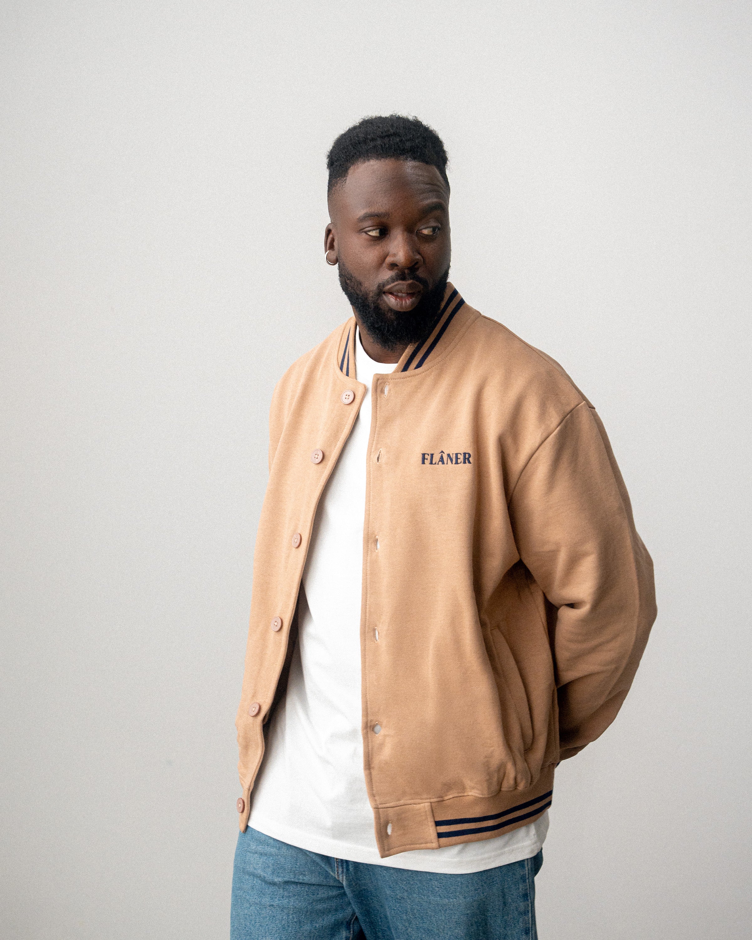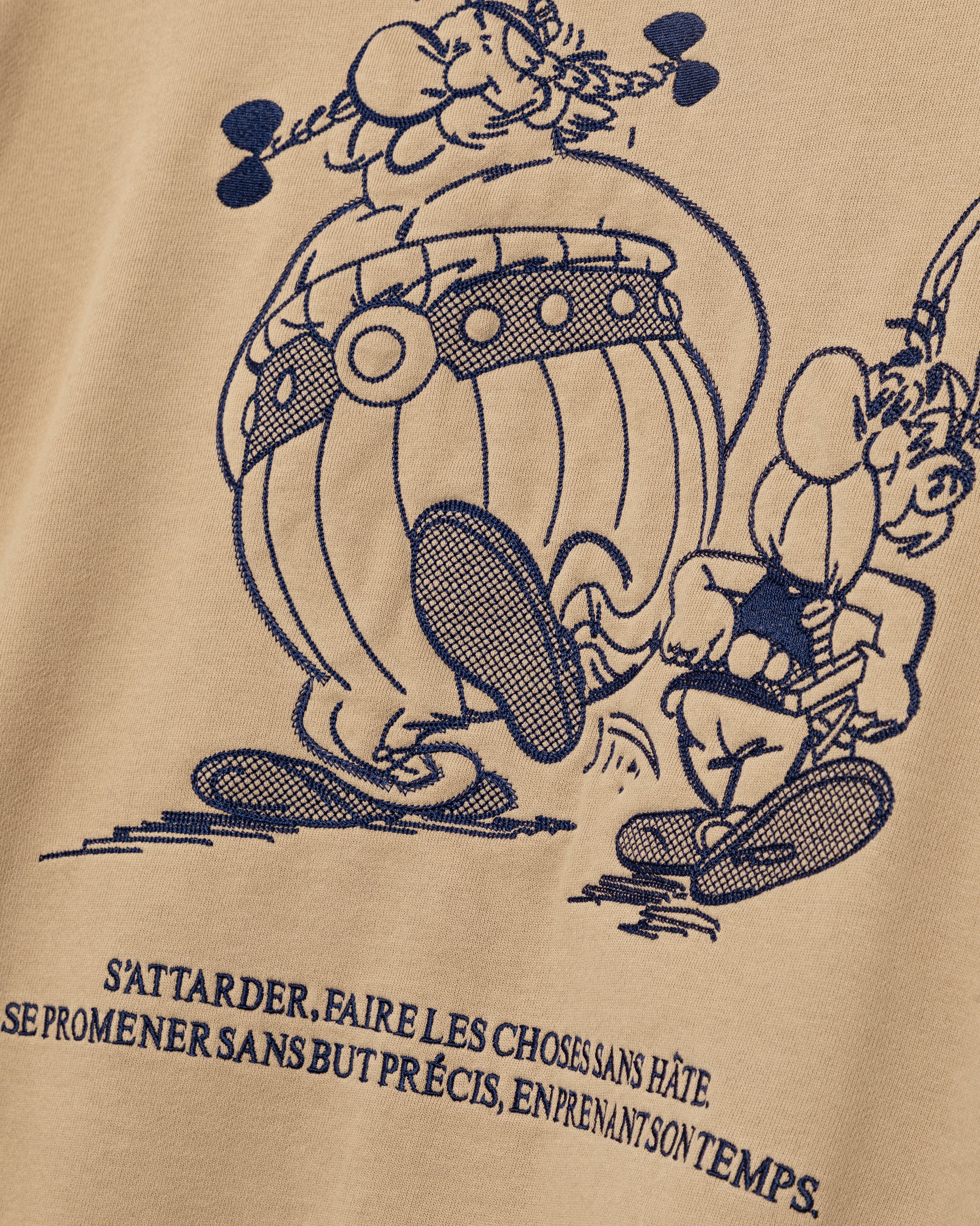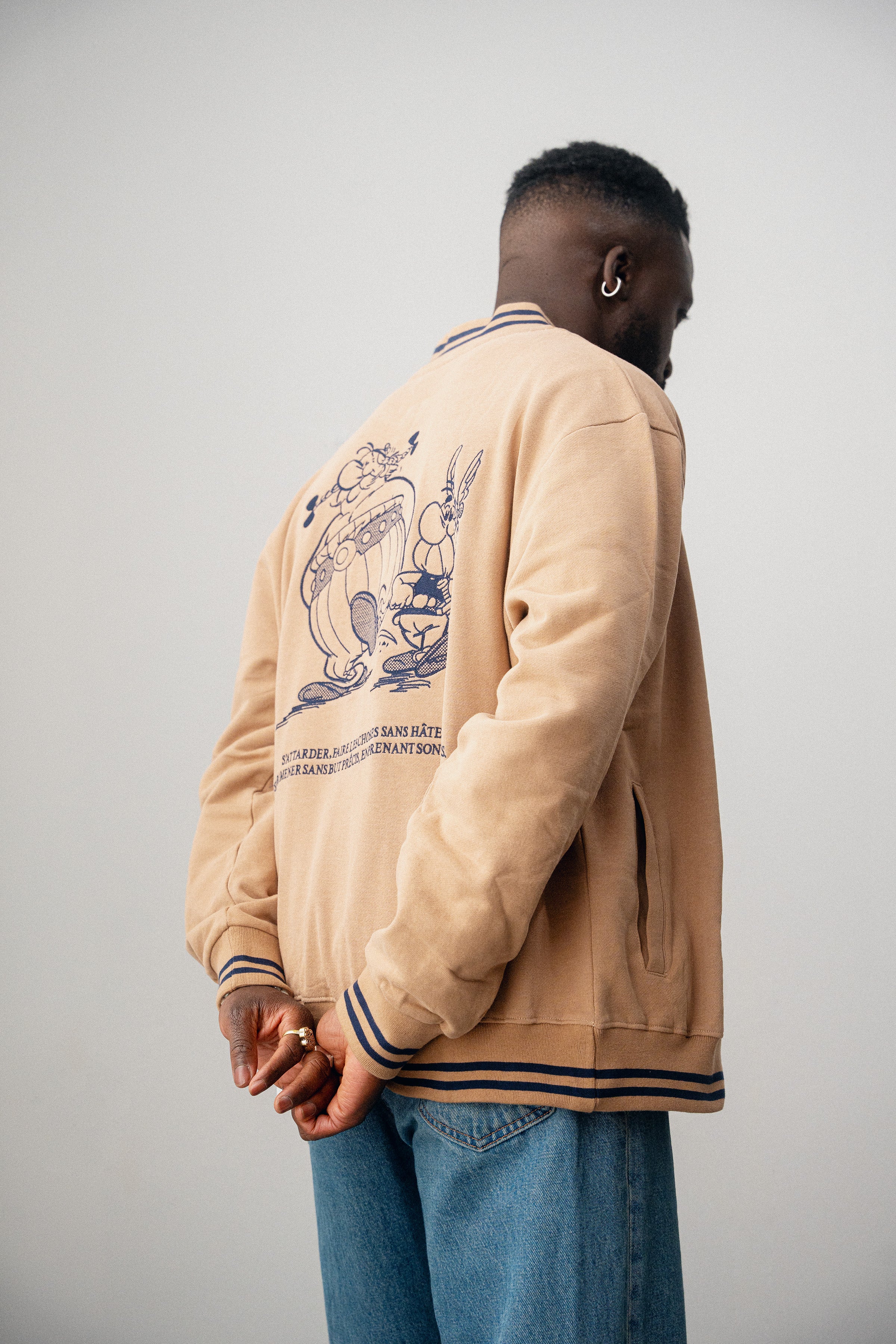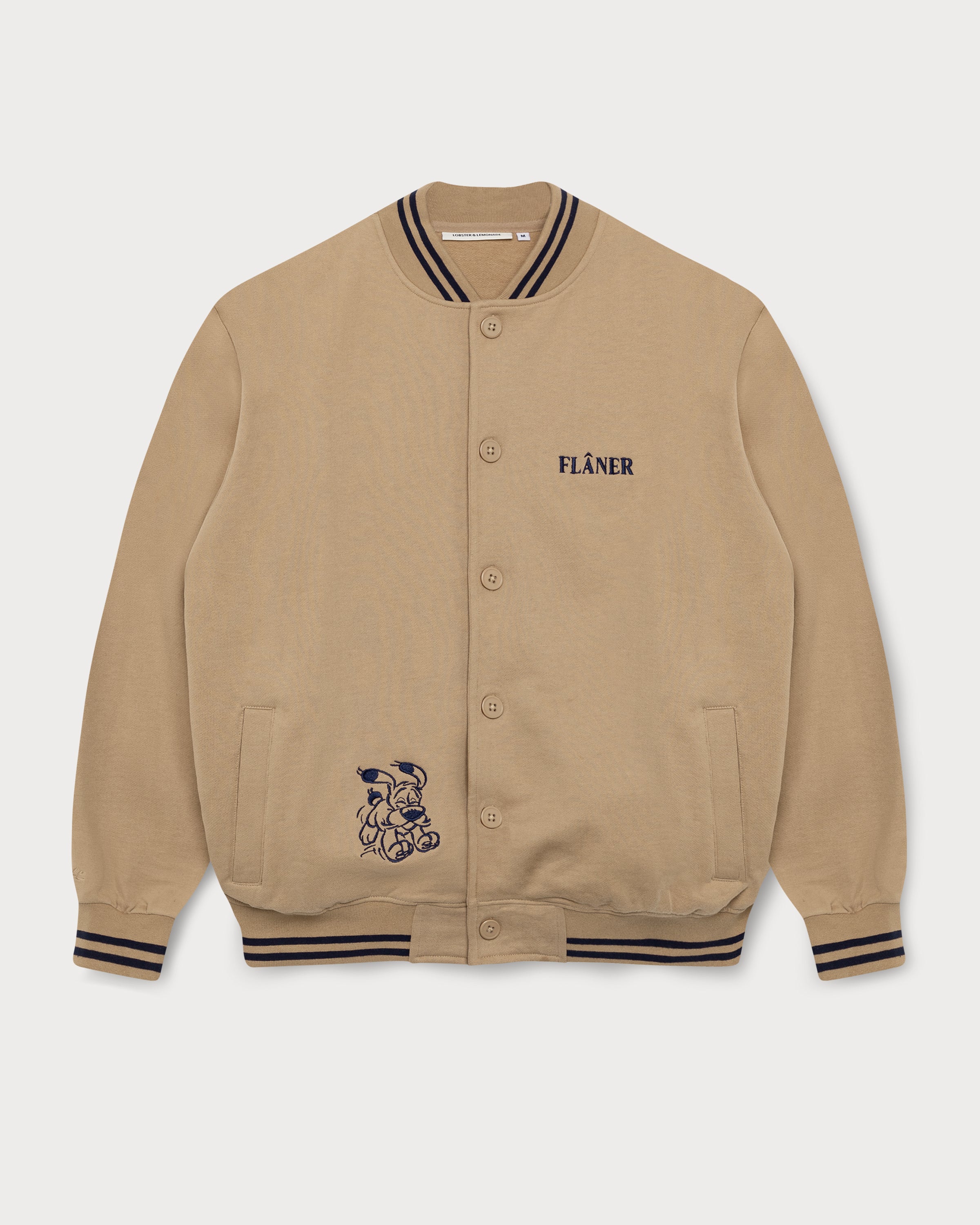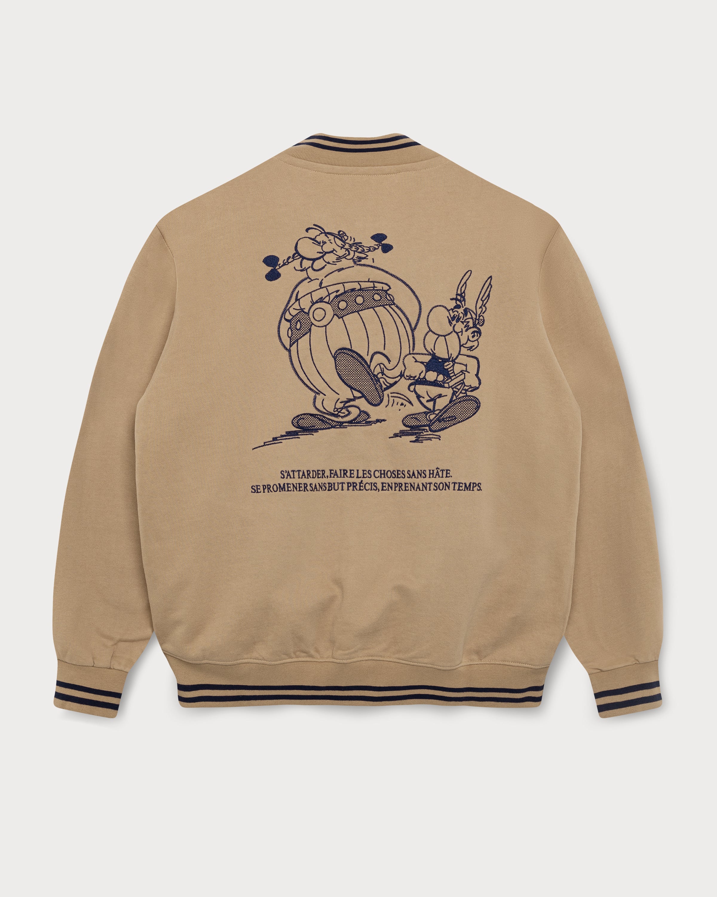 Au dos de la veste universitaire en coton marron effet peau de pêche, Astérix et Obélix sont généreusement brodés. L'Idéfix courant et le lettrage « Flâner » sur le devant apportent une touche supplémentaire, tandis que les deux bandes aux poignets complètent le look universitaire.