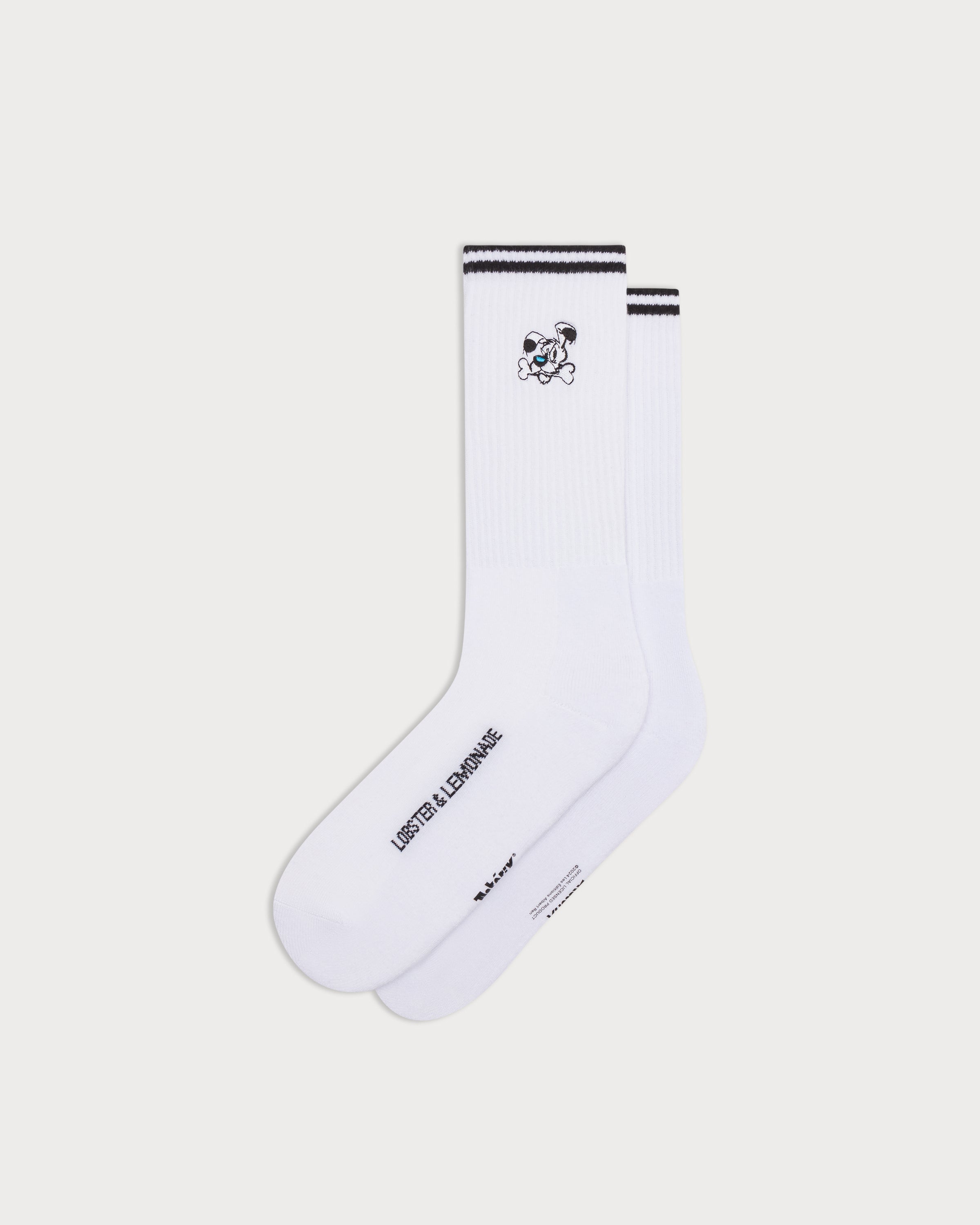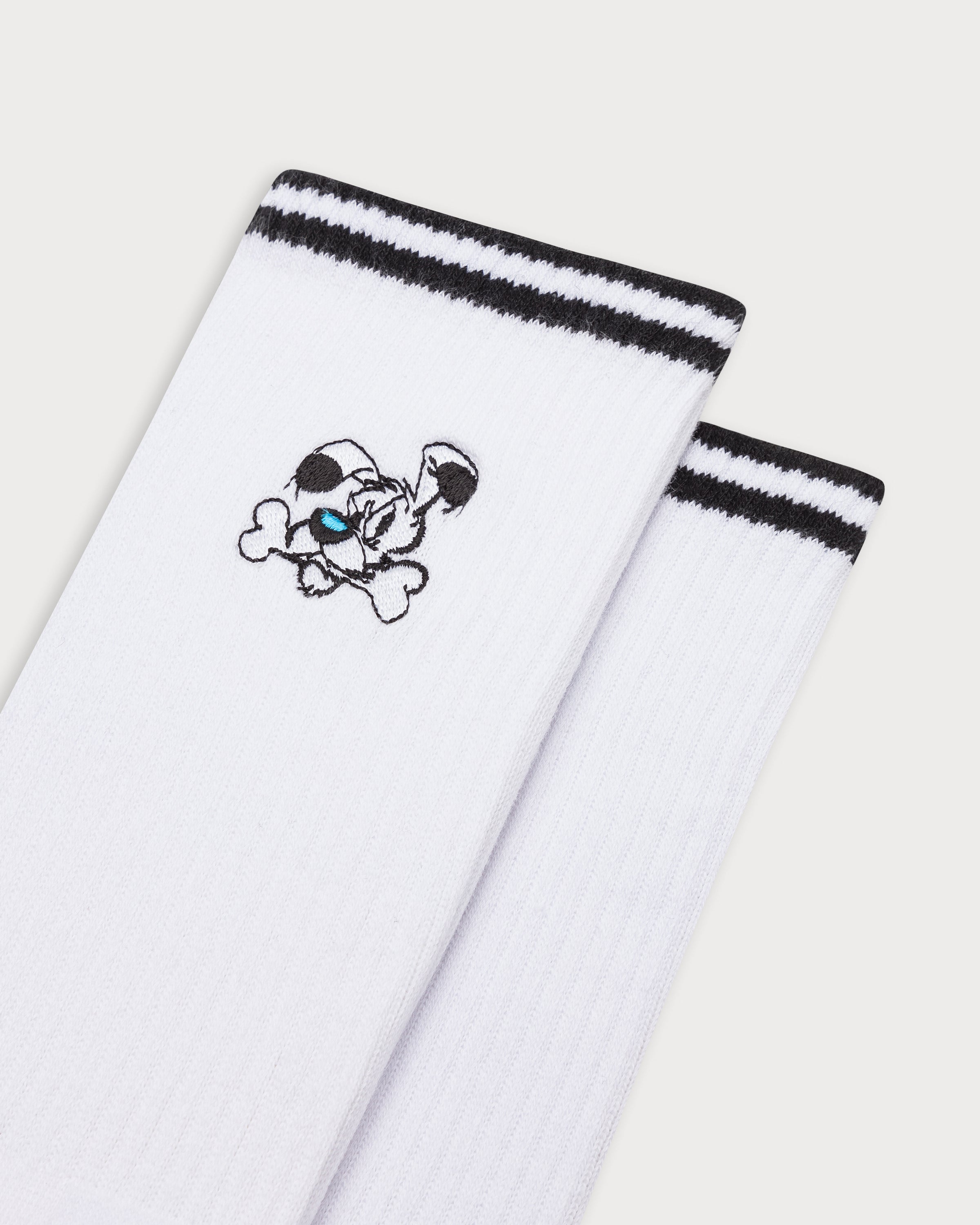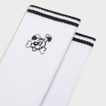 Idéfix, un os dans la bouche, est délicatement brodé sur la chaussette de sport blanche. Les rayures noires sous le revers complètent le look sportif.