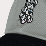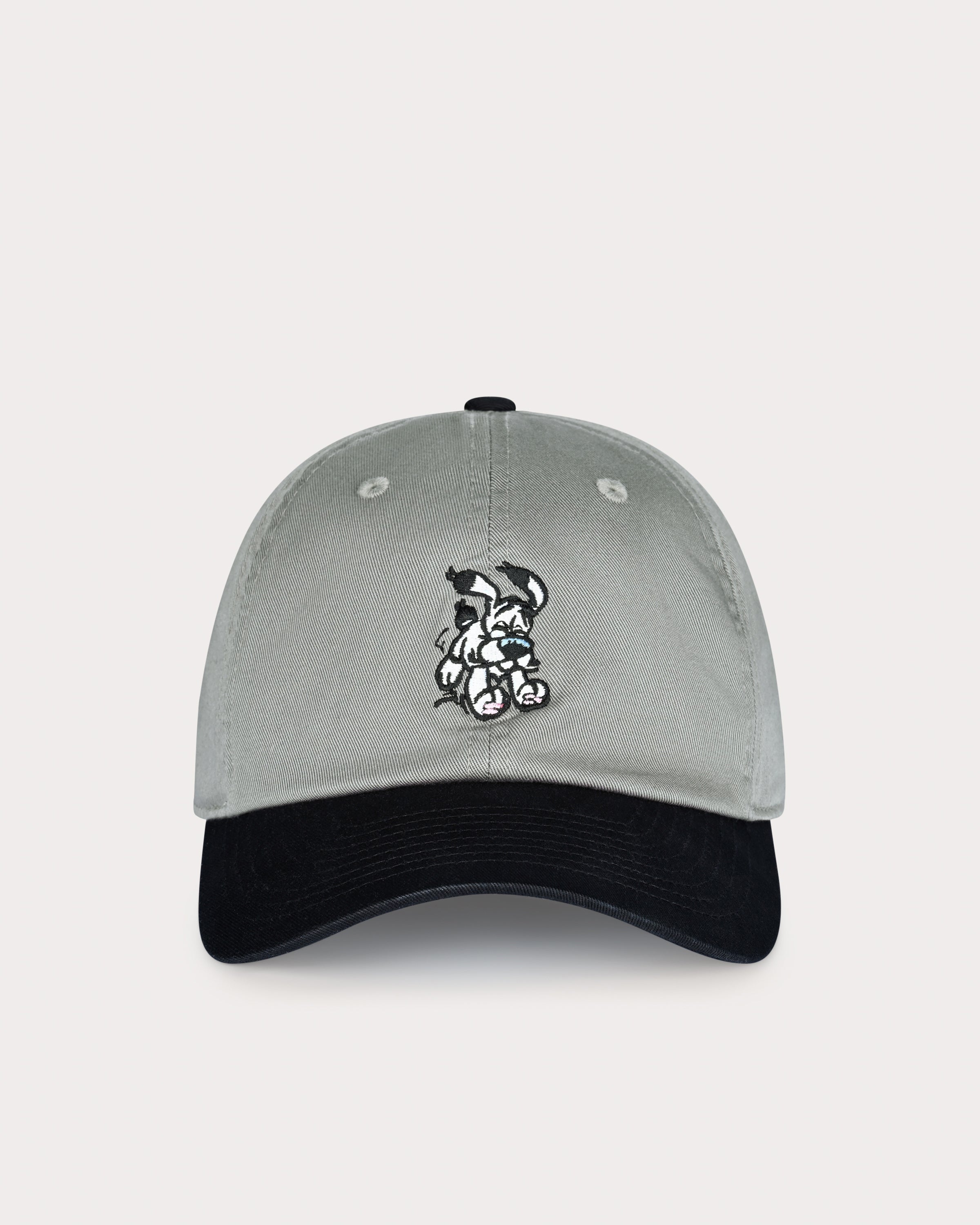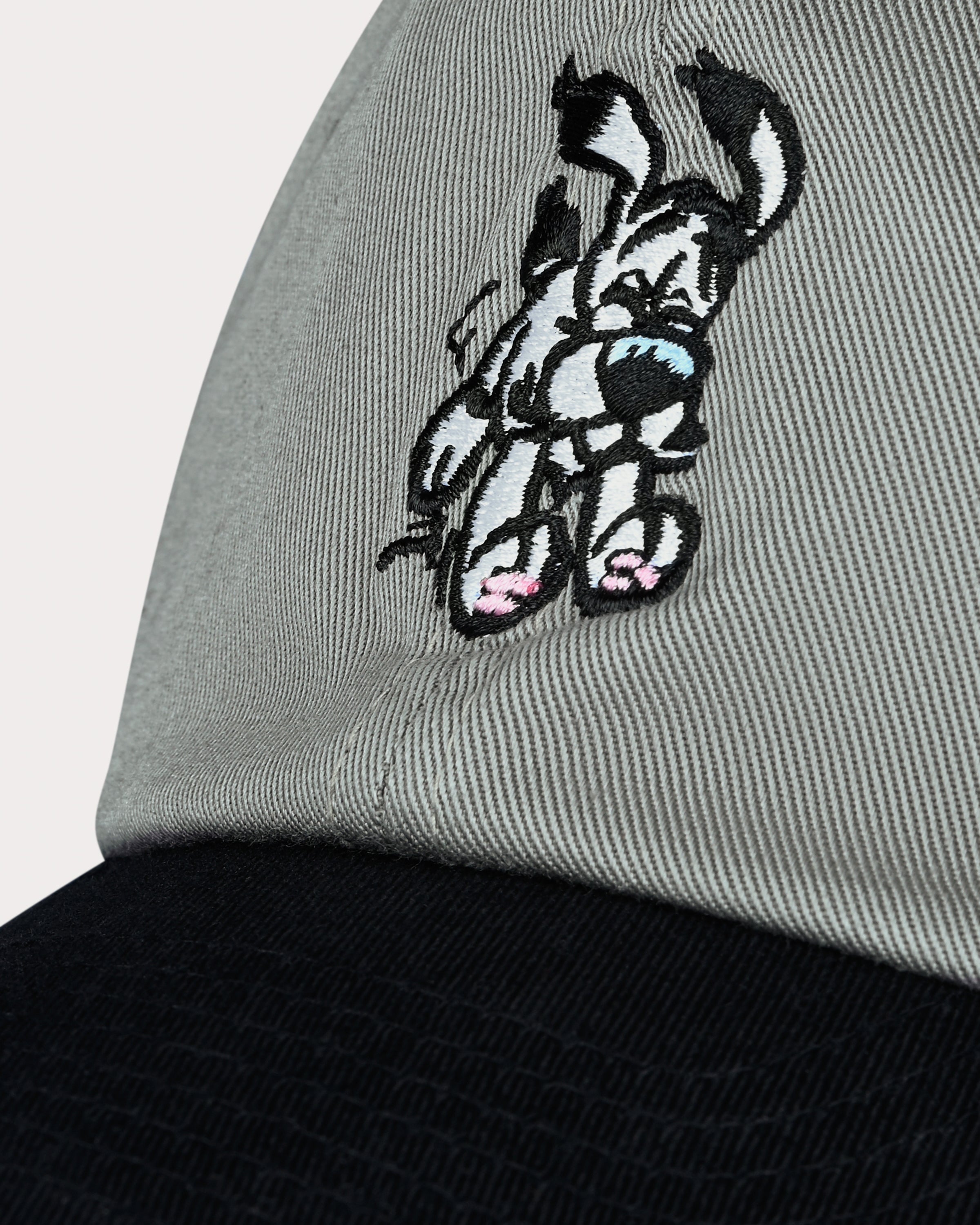 Cette casquette polo grise et noire représente Idéfix dans une pose de course joyeuse, finement brodée sur le devant. Ce motif vibrant crée un look dynamique.
