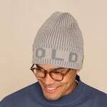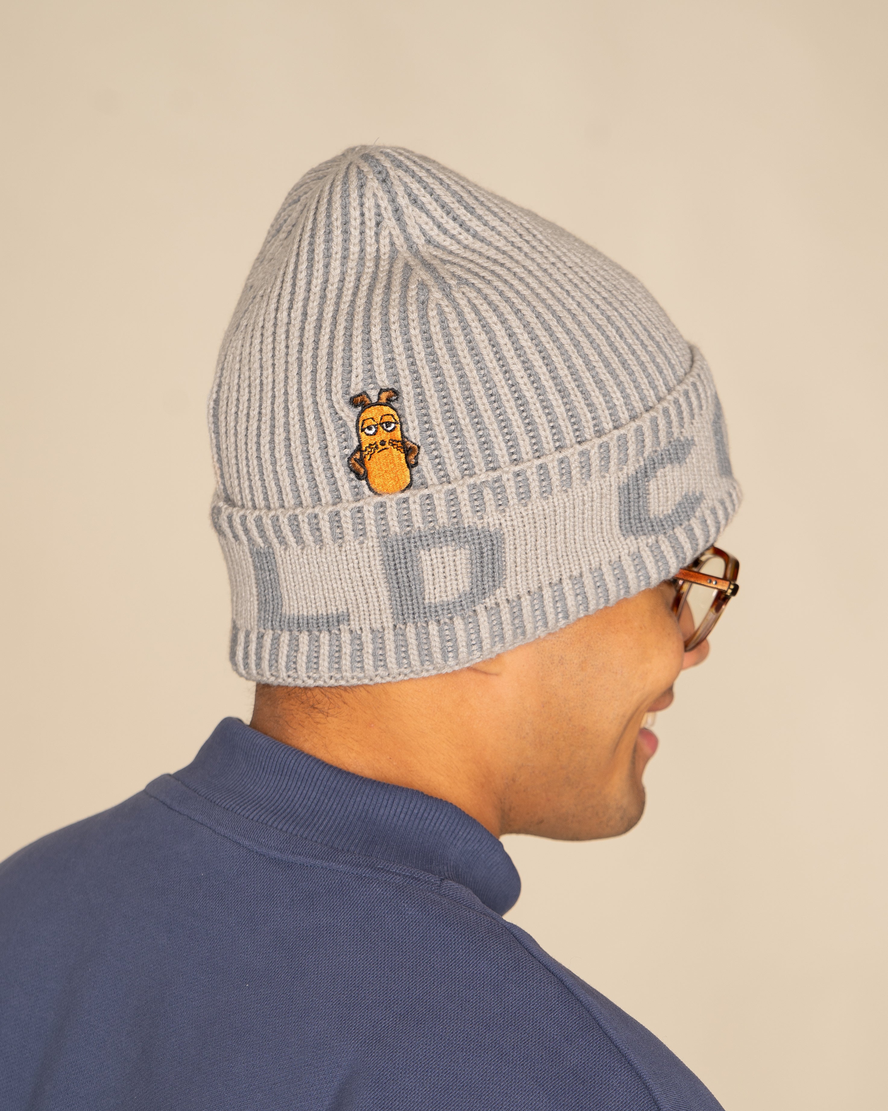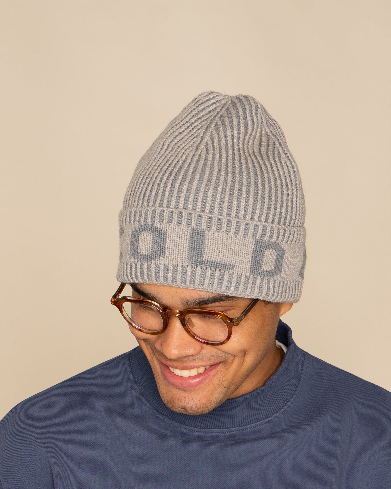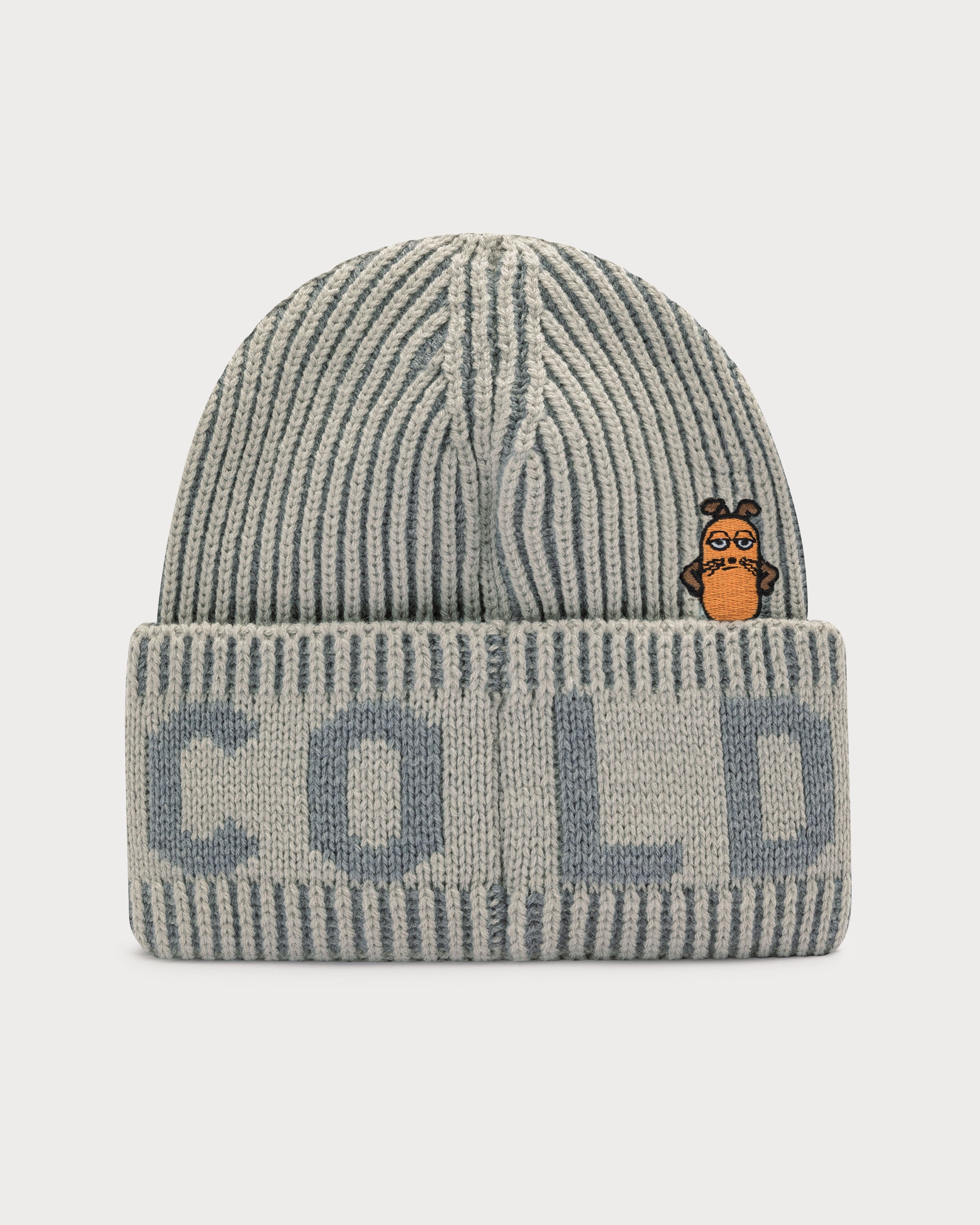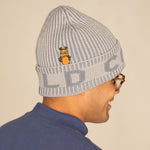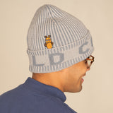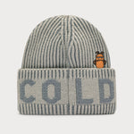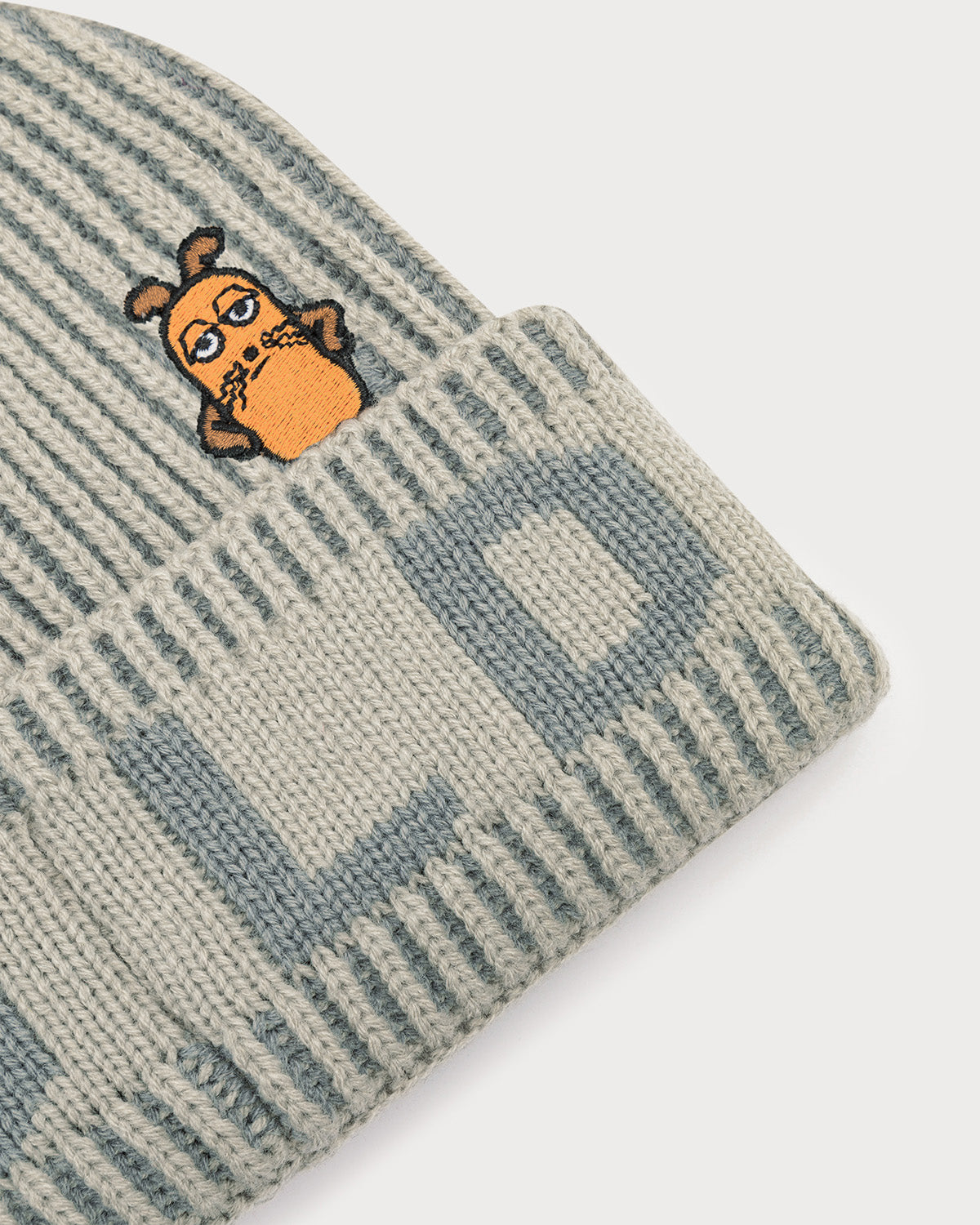 Ce bonnet rayé beige et gris séduit par son généreux lettrage « Season Winter ». La souris délicatement brodée, visiblement abattue, apporte une touche d'originalité supplémentaire.