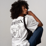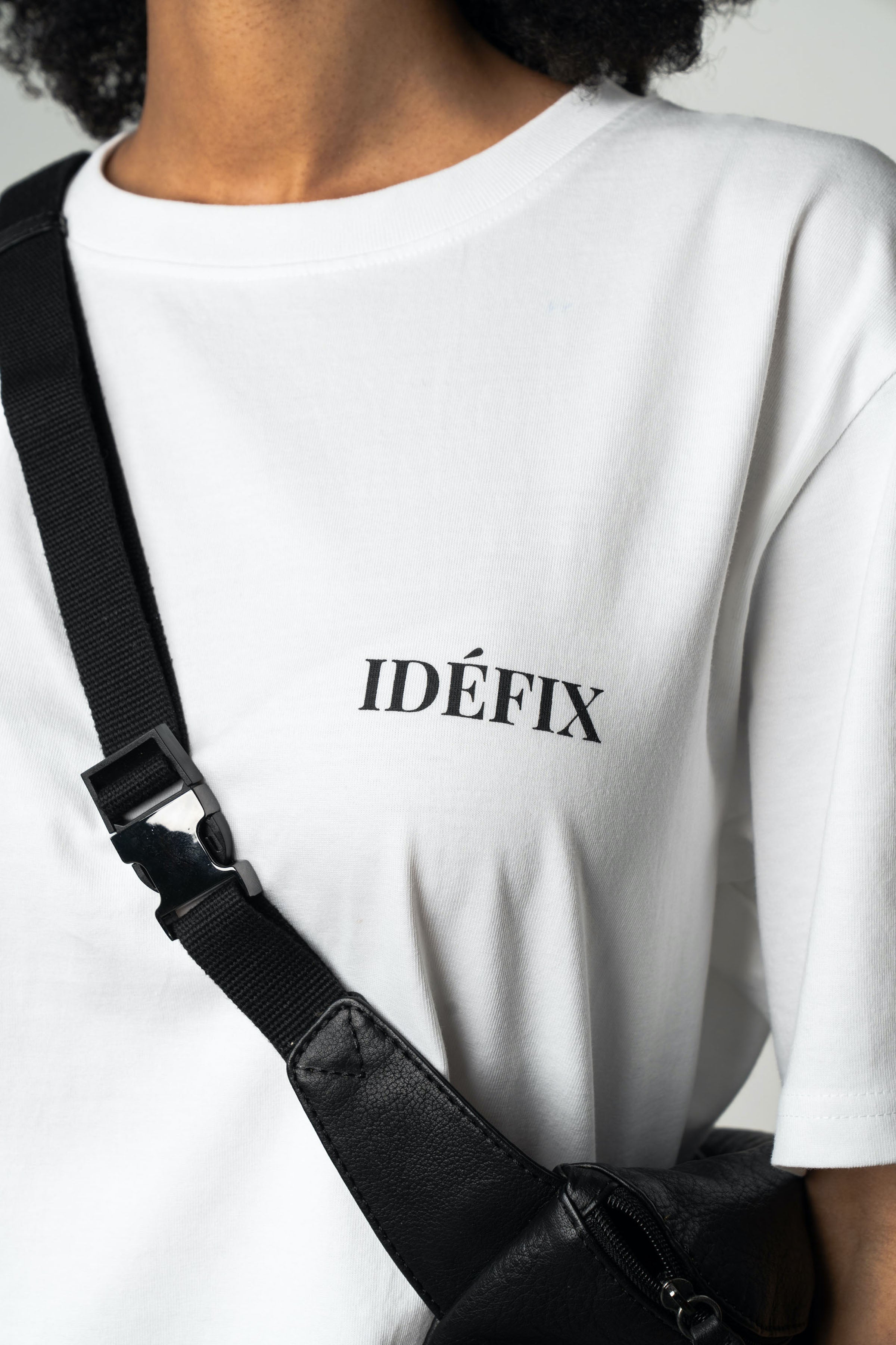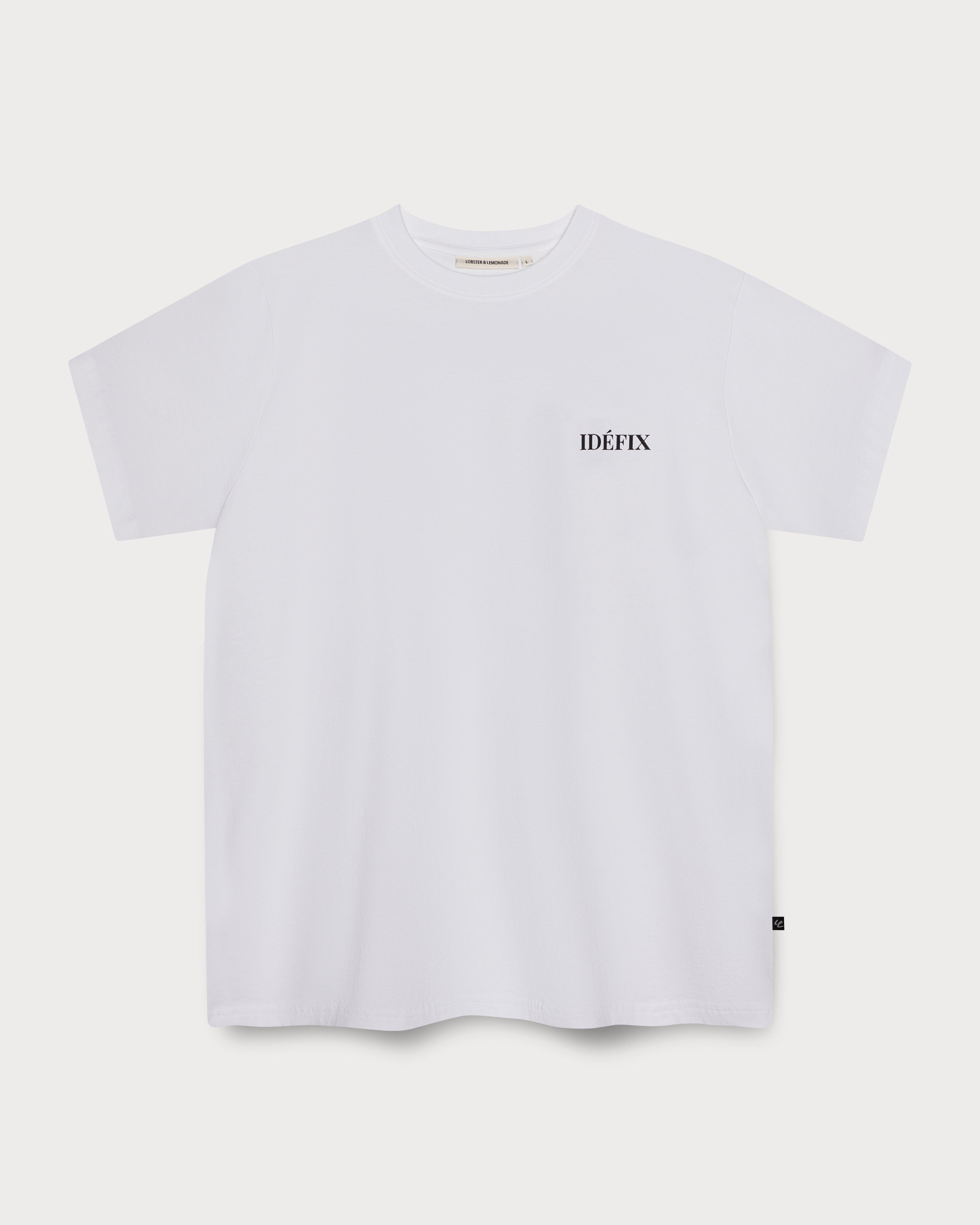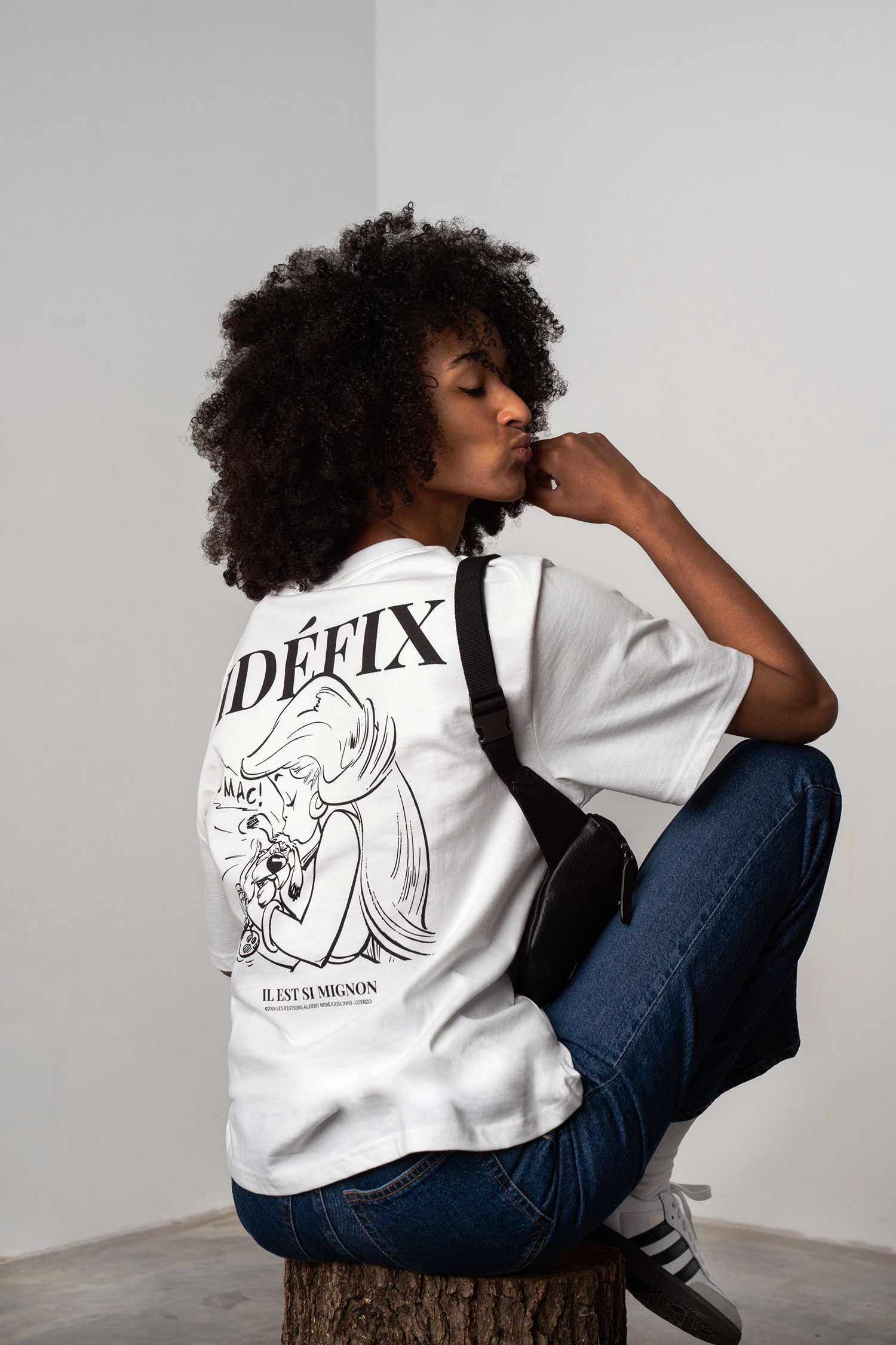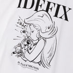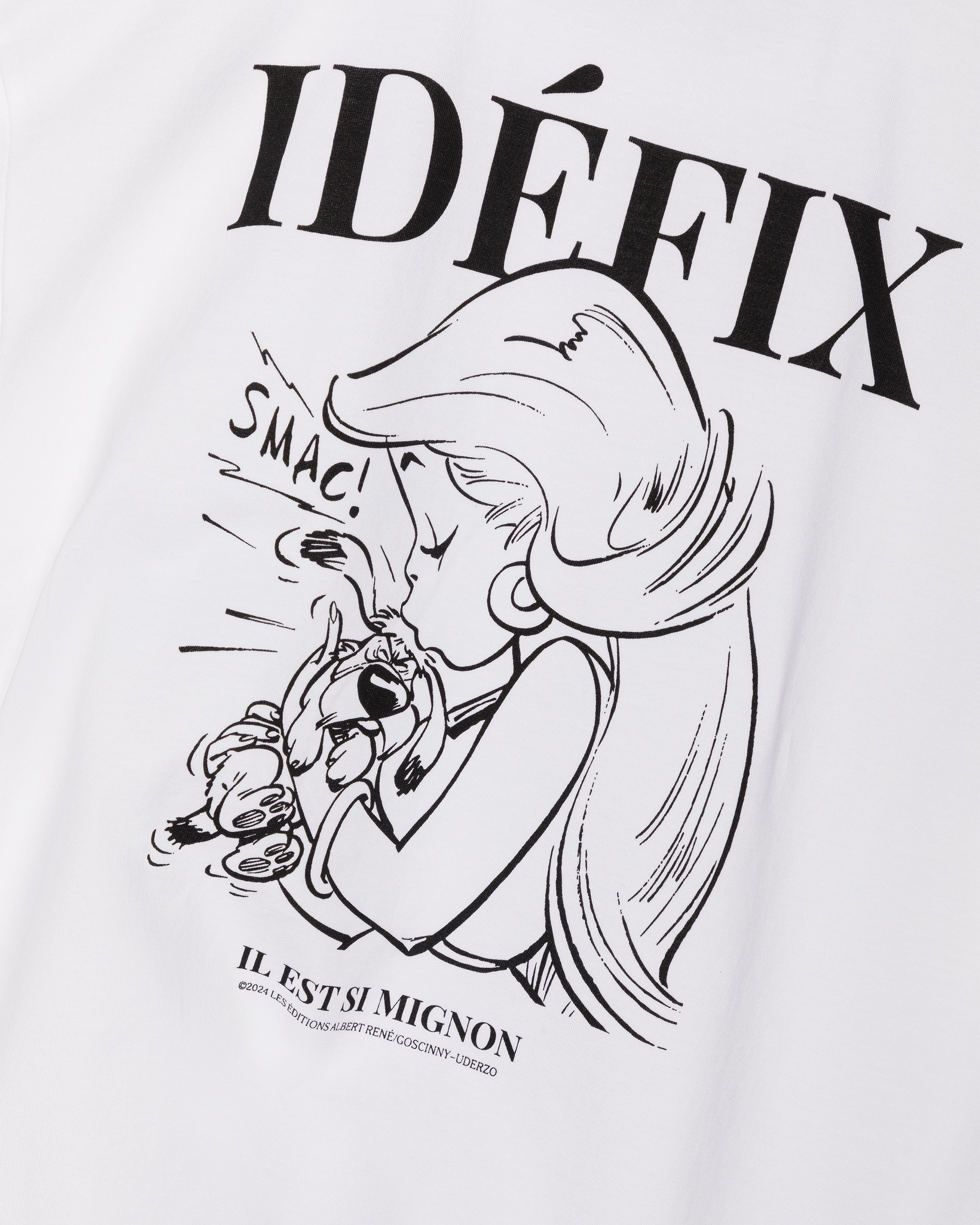 Le dos du t-shirt blanc représente Falbala et Idéfix dans une pose adorable. L'inscription « Idéfix » sur la poitrine gauche et la coupe ample complètent parfaitement le style.