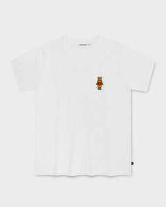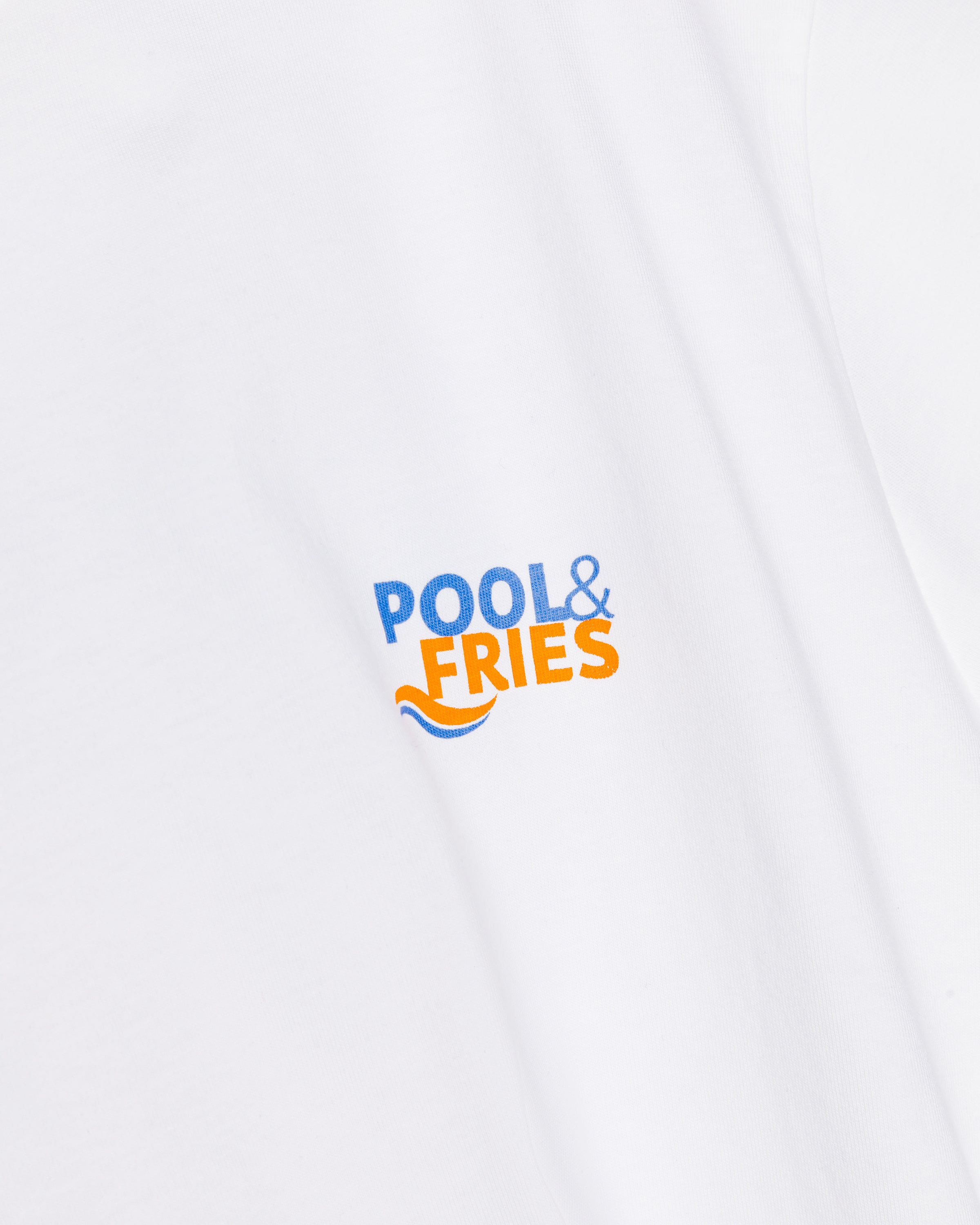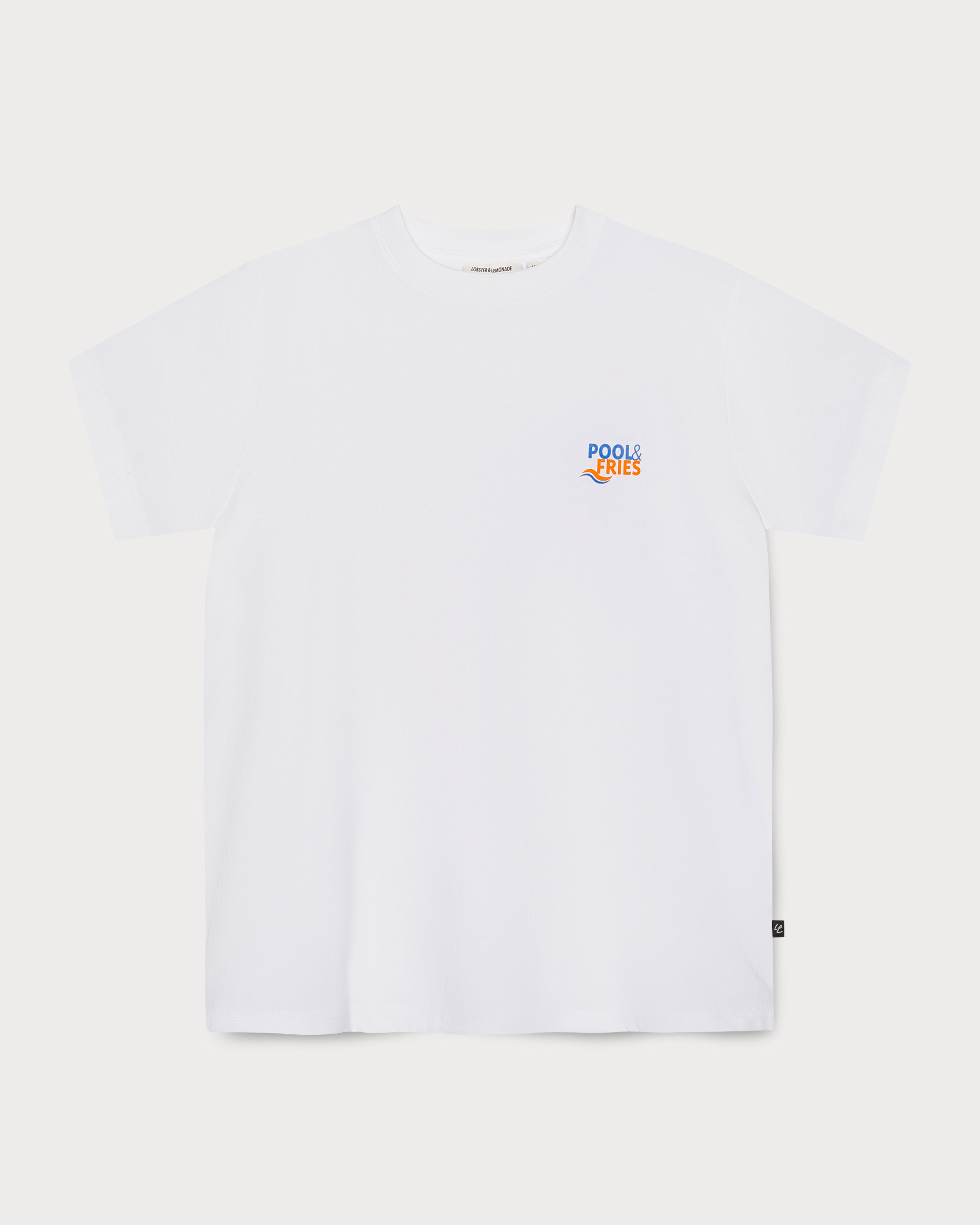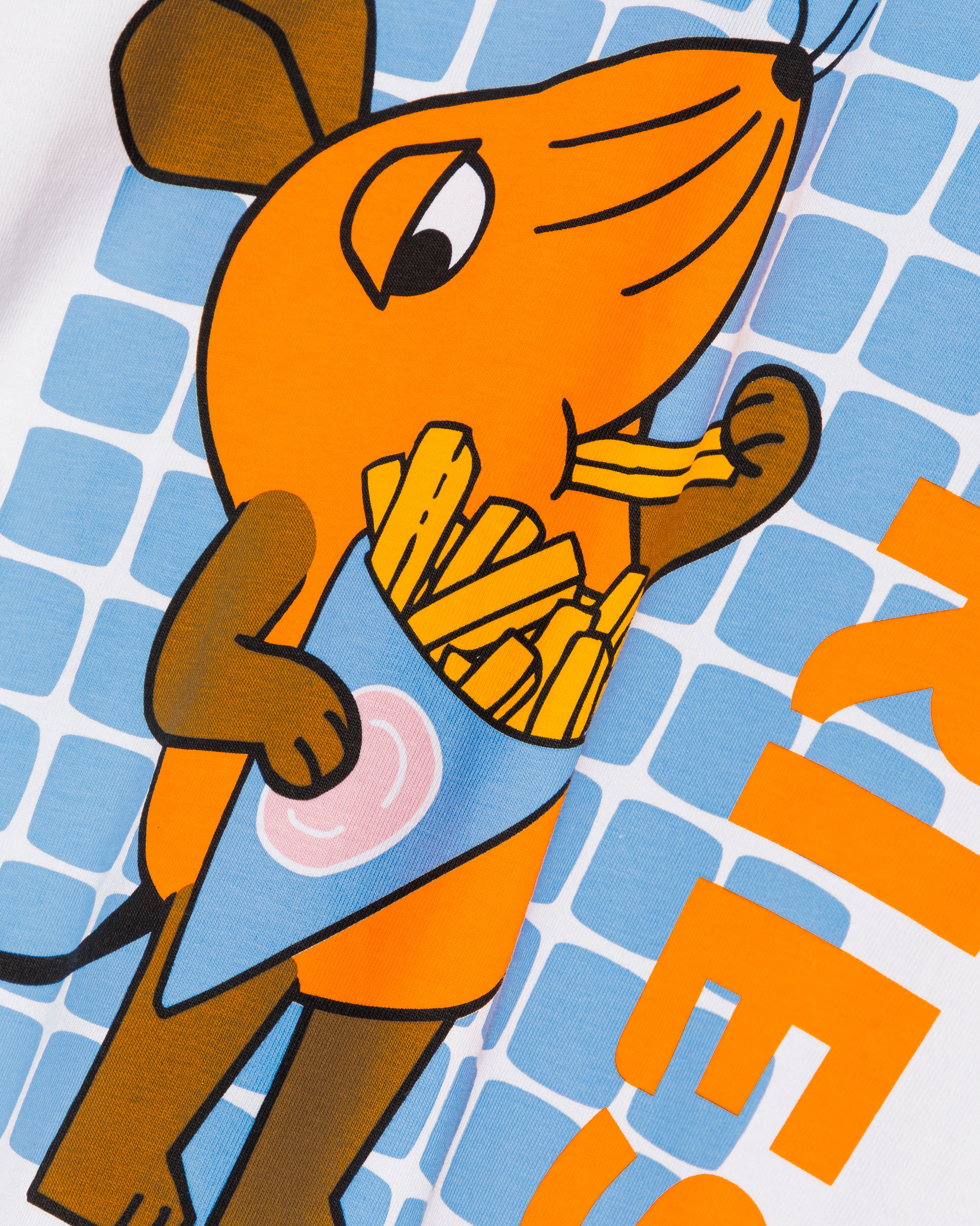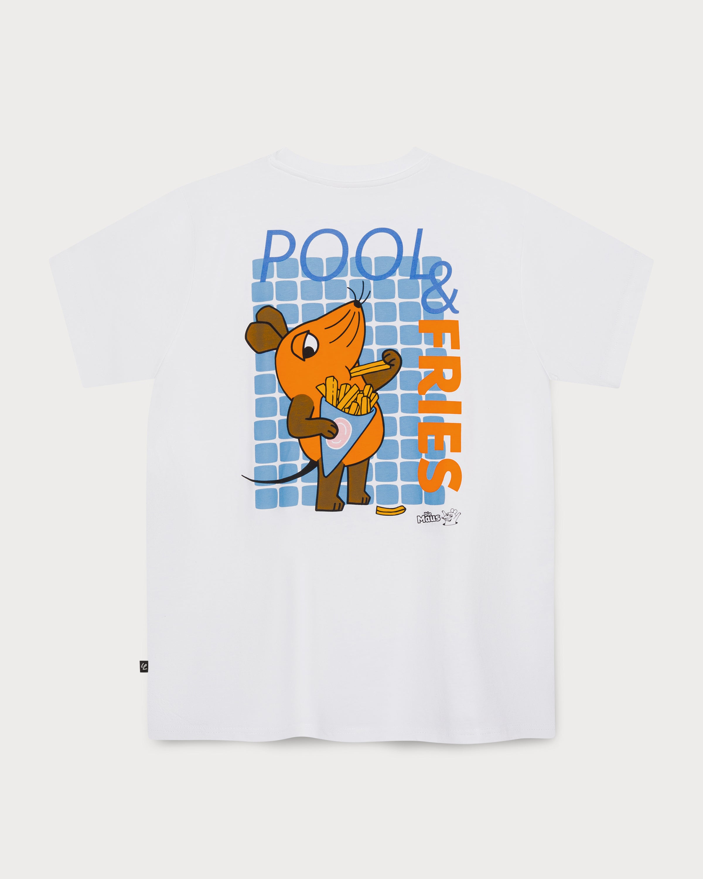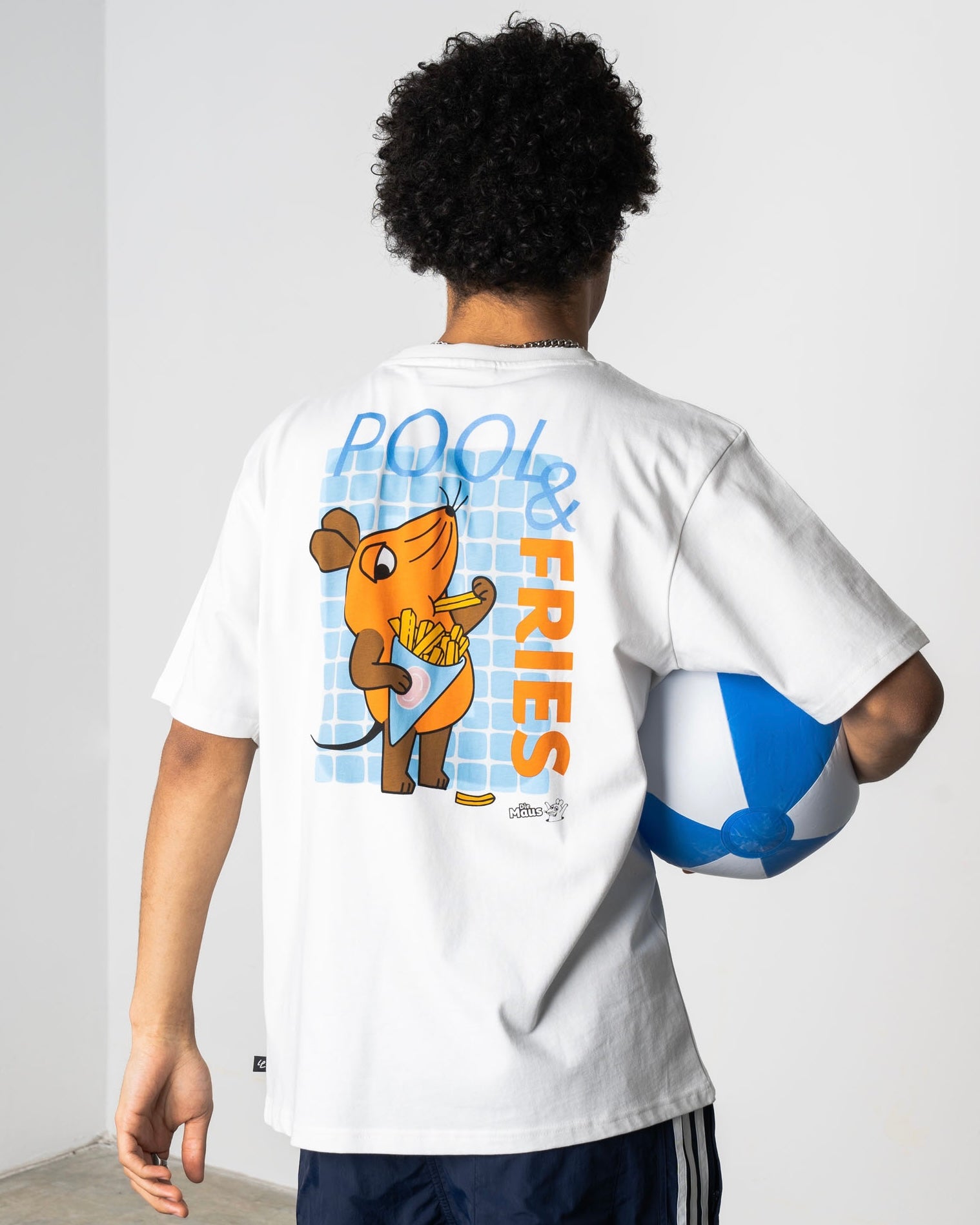 Le généreux imprimé au dos représente la souris se détendant devant une frite au bord de la piscine. Ce t-shirt blanc ample est complété par un imprimé « Pool & Fries » sur la poitrine gauche. La collection Souris et ses amis revisite les personnages emblématiques des séries cultes « L'Envoyé de la Souris » et « Le Petit Maulwurf » pour un look streetwear moderne. Jasmin mesure 1,75 m et porte une taille XS. Maxwell mesure 1,80 m et porte une taille L.