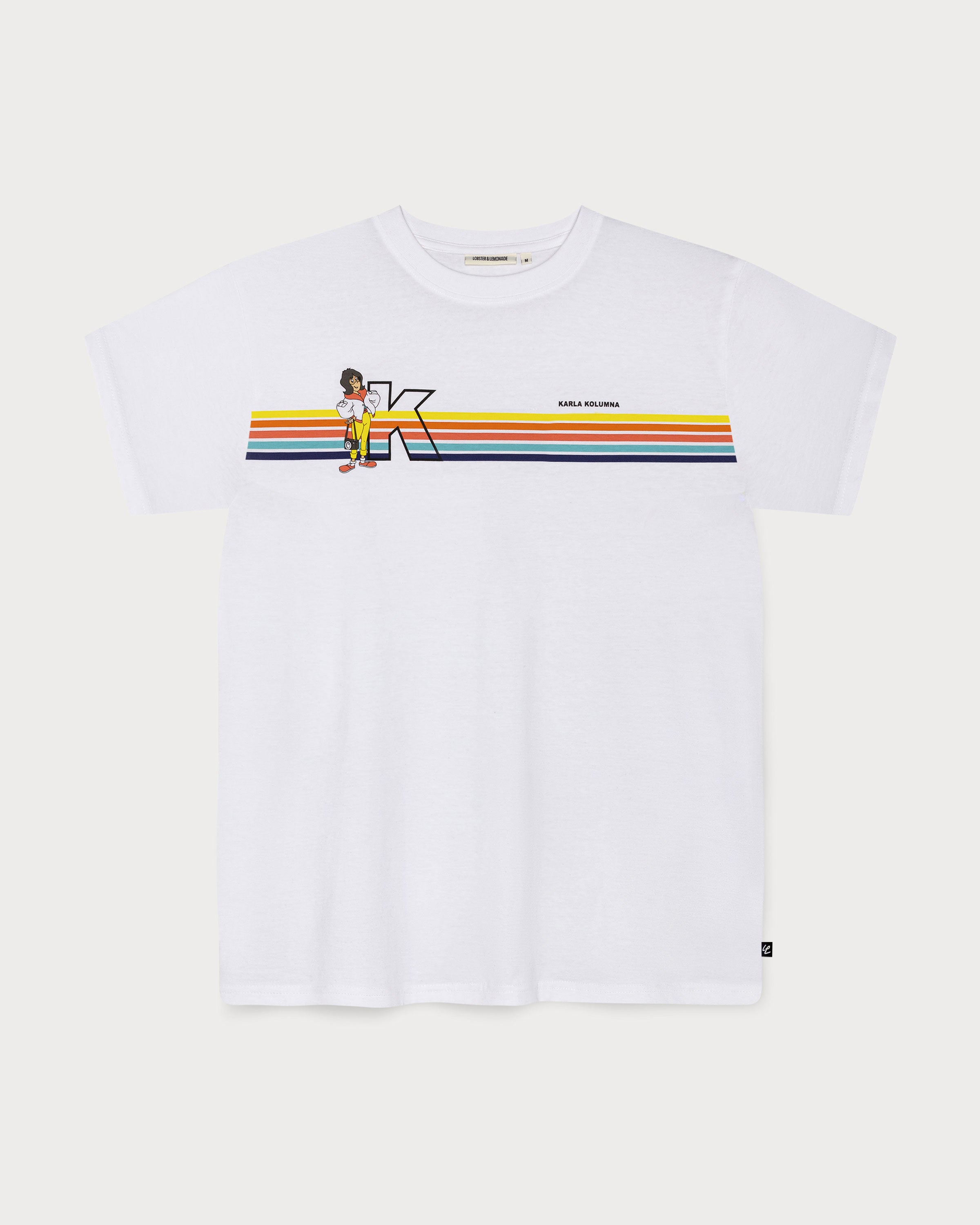 Ce t-shirt blanc arbore un motif rétro de Karla Kolumna, avec des rayures colorées sur la poitrine. Les couleurs et les agencements rappellent l'époque des appareils photo analogiques.
