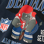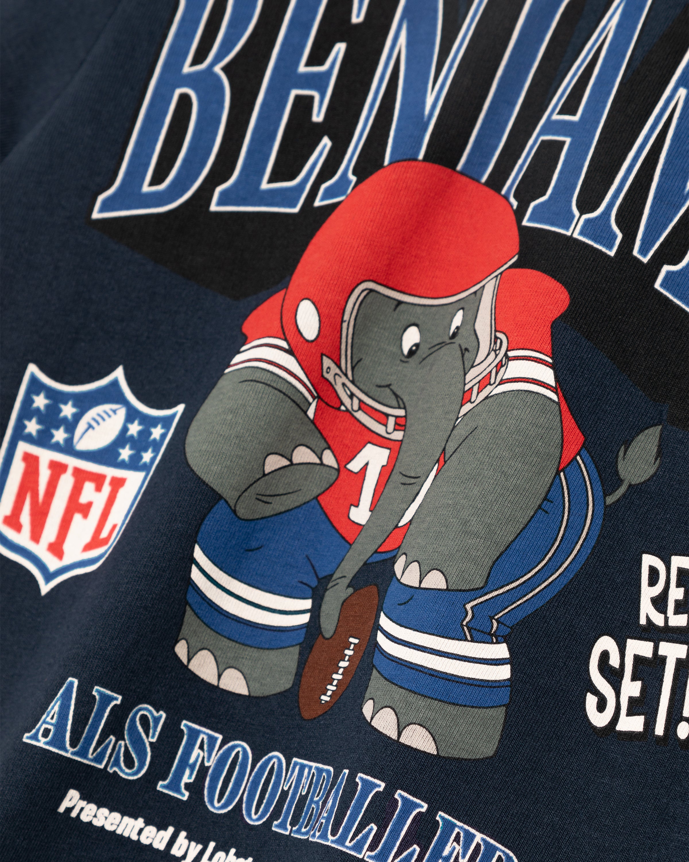 Benjamin Blümchen est représenté en footballeur sur le généreux imprimé au dos du t-shirt bleu marine. Des lettres à empattements et des logos officiels complètent le look.