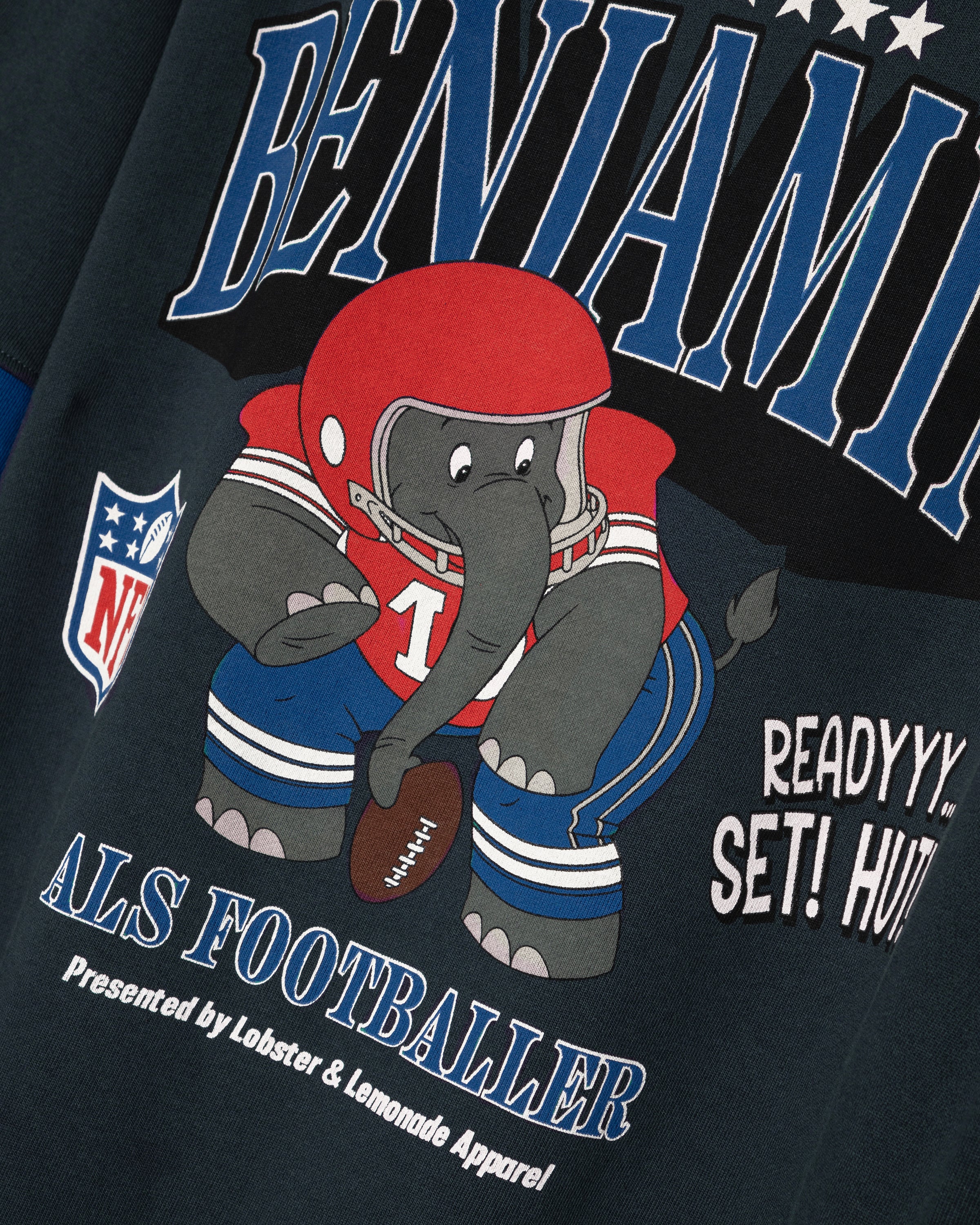 Benjamin Blümchen est représenté en footballeur sur le généreux imprimé au dos du t-shirt bleu marine. Des lettres à empattements et des logos officiels complètent le look.