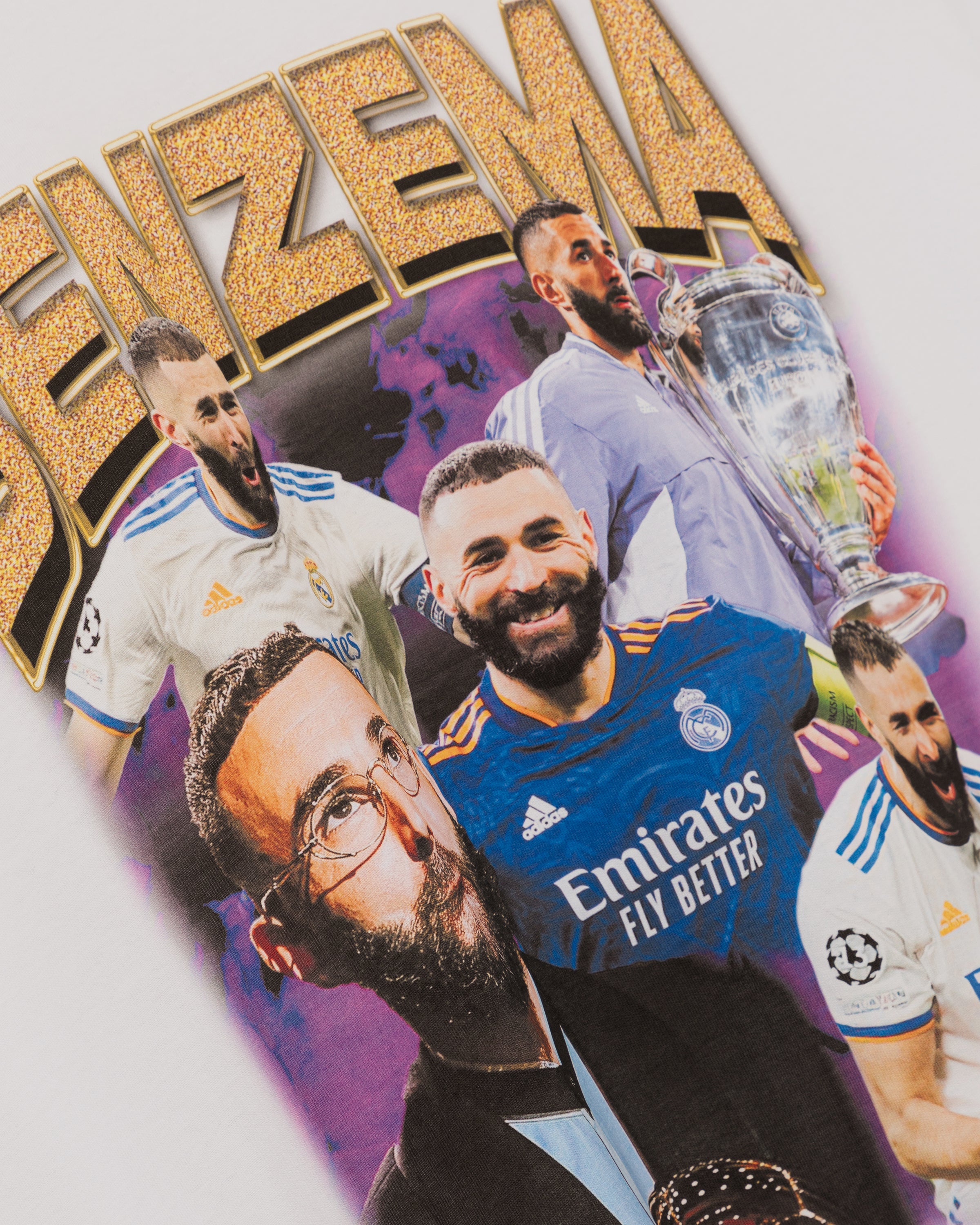 Ce t-shirt blanc arbore un grand imprimé numérique au style rétro des années 90. Ce motif rend hommage à Karim Benzema. Marque : Retro Football Gang