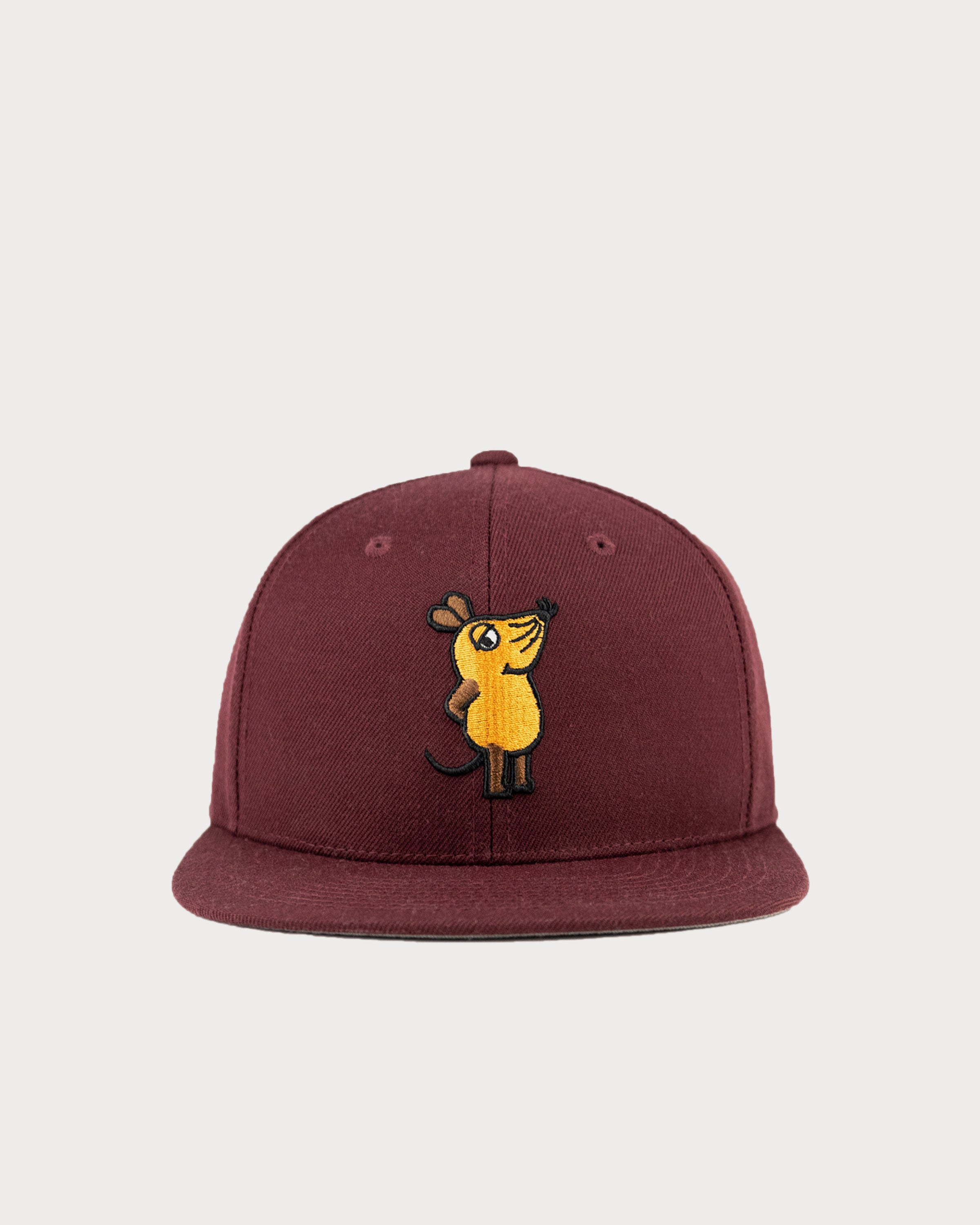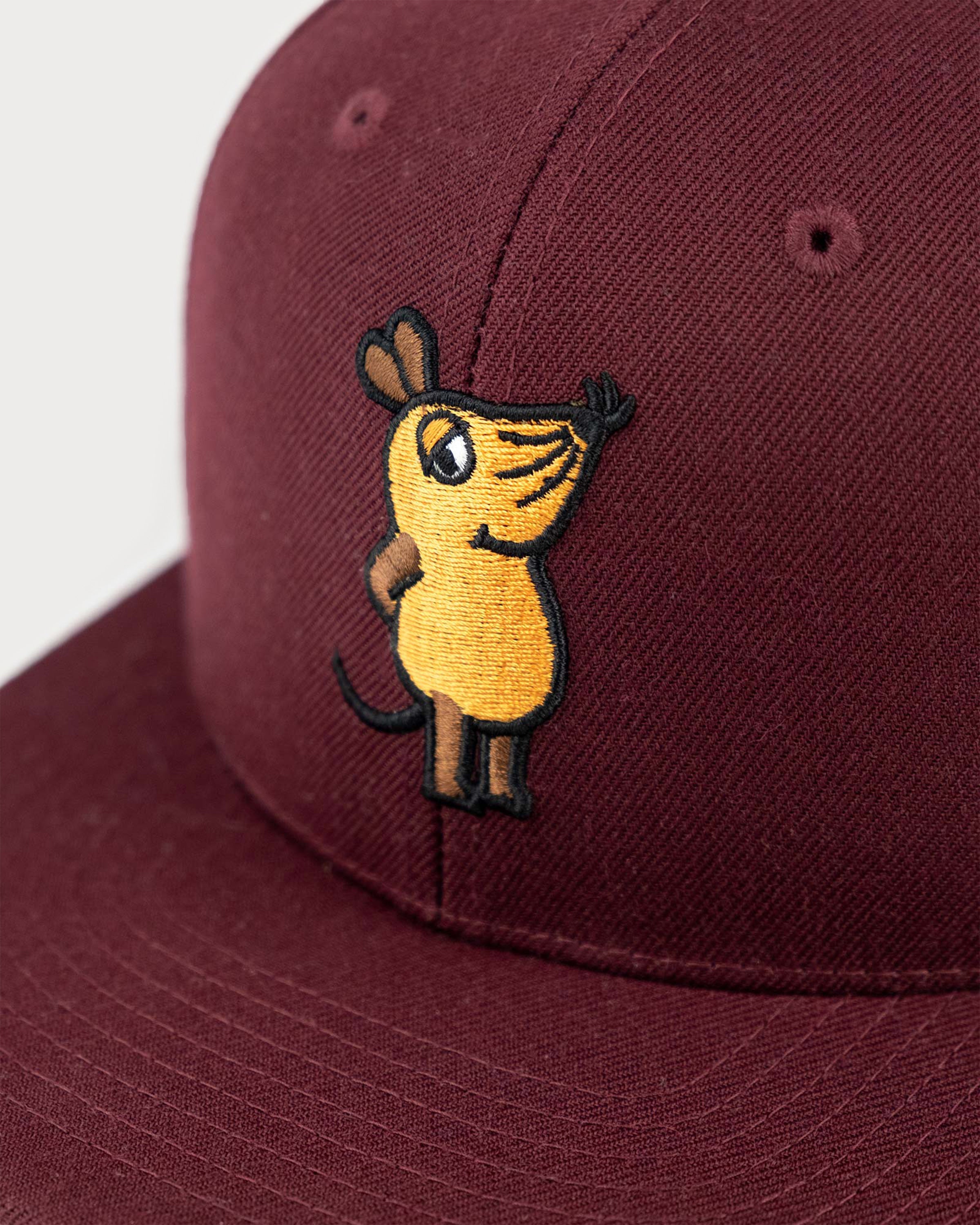 La broderie 3D sur la casquette snapback bordeaux représente la souris dans sa pose élégante habituelle. Dans la collection Souris et ses amis, nous réinterprétons des personnages célèbres des séries cultes « L'Envoyé de la Souris » et « Le Petit Maulwurf » pour un look streetwear moderne.