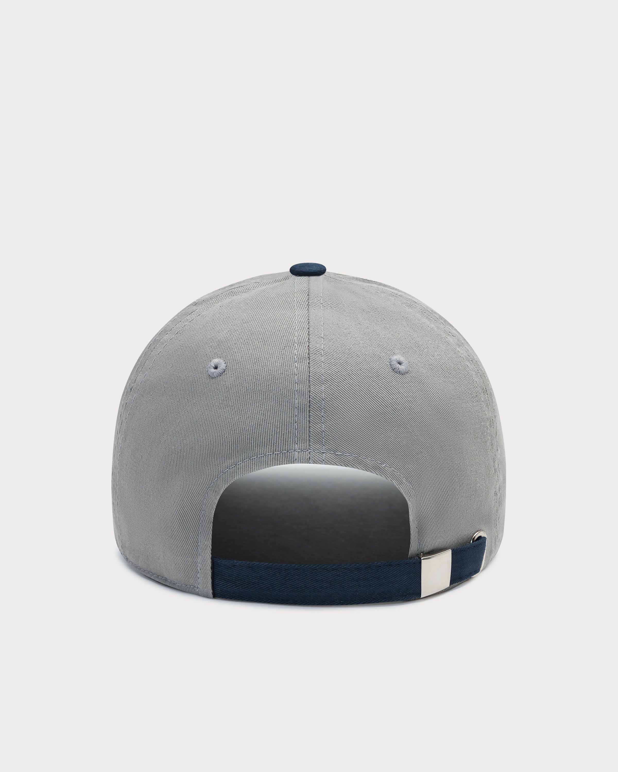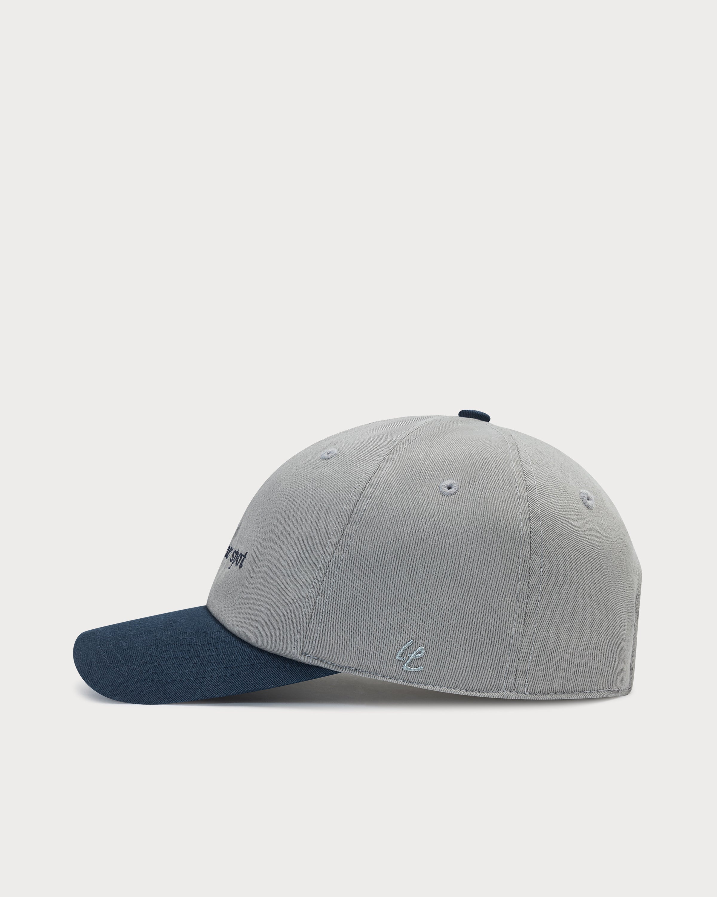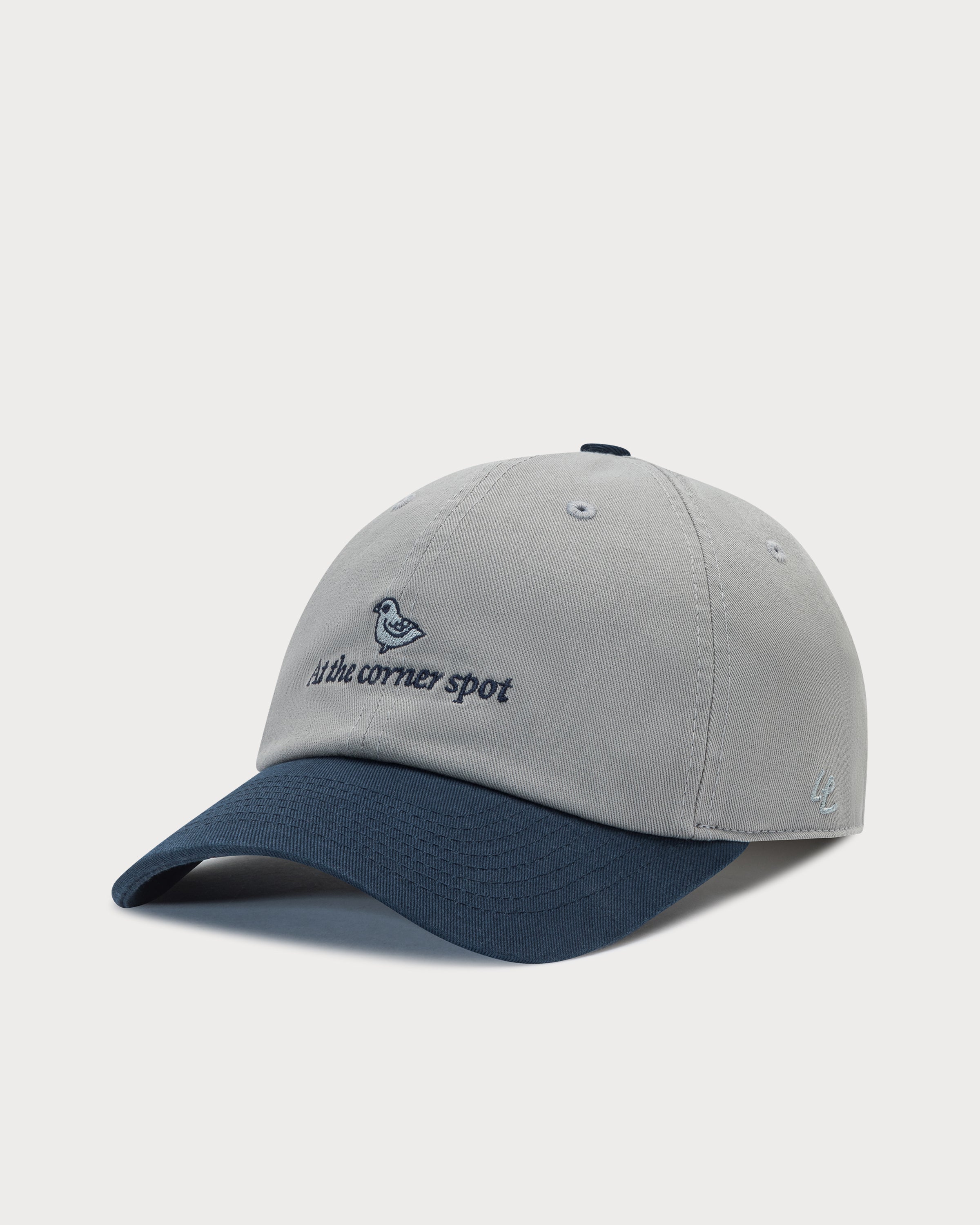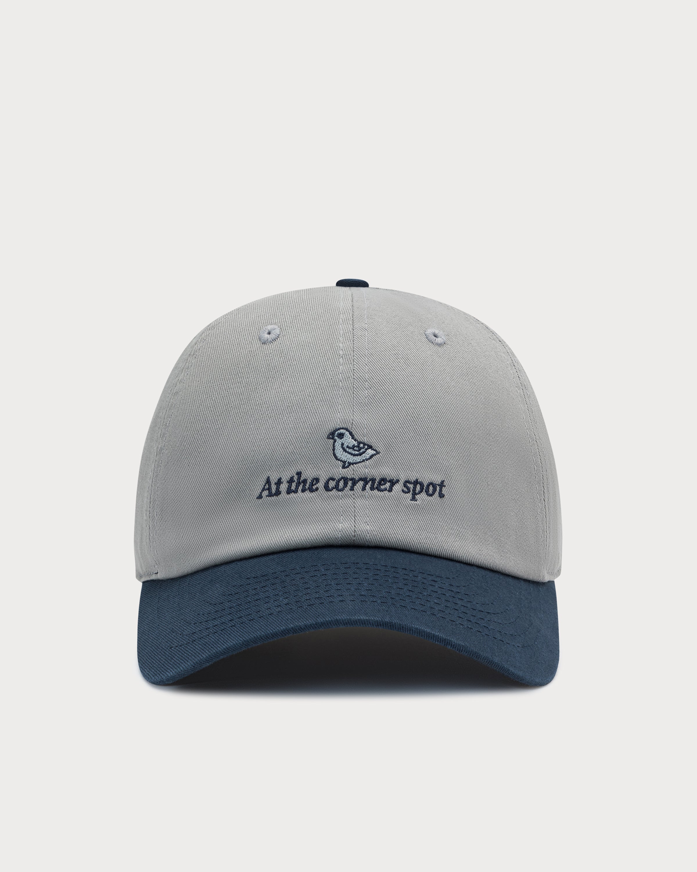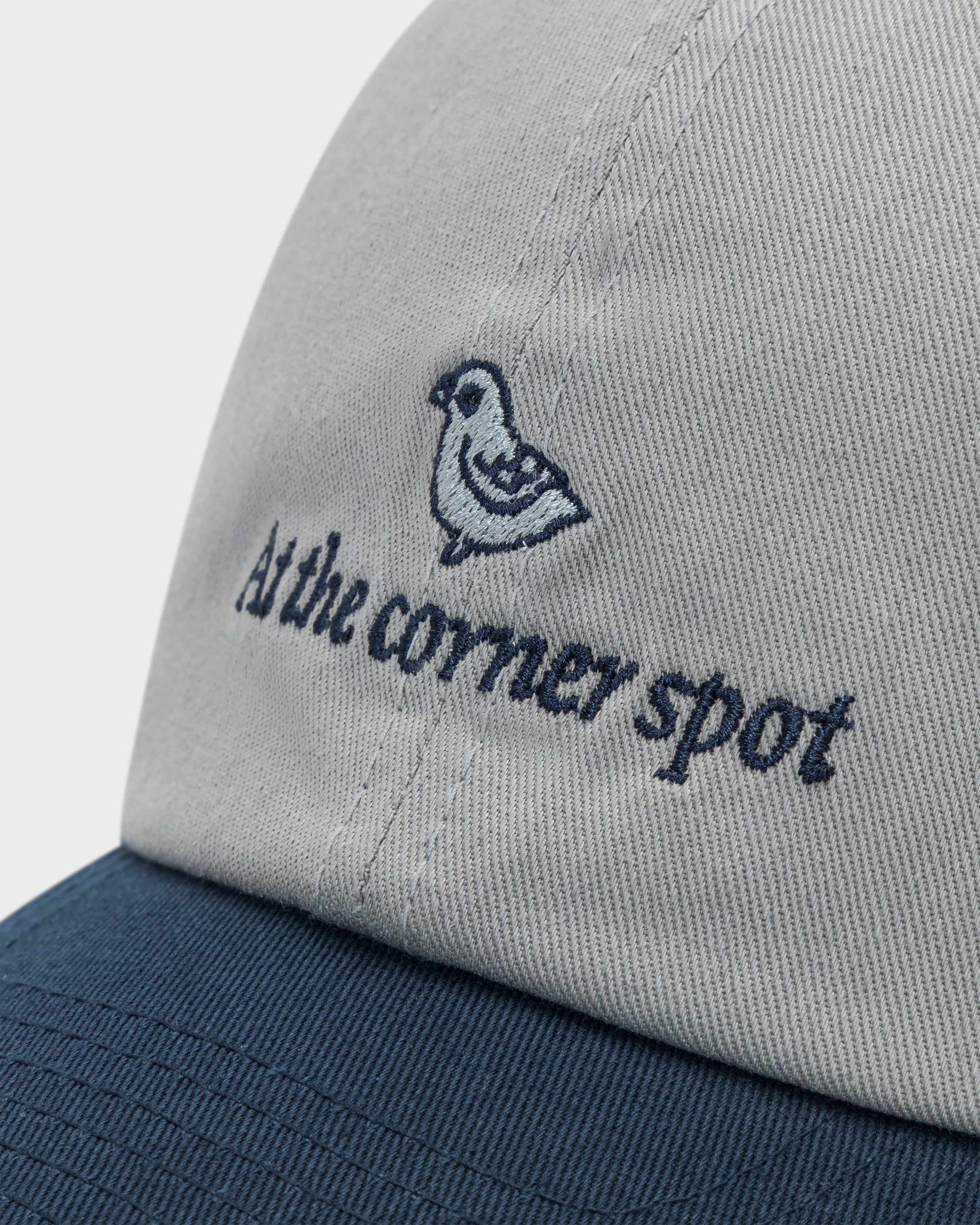 La broderie « at the corner spot » avec motif colombe prend tout son sens sur la casquette polo gris-bleu marine.
