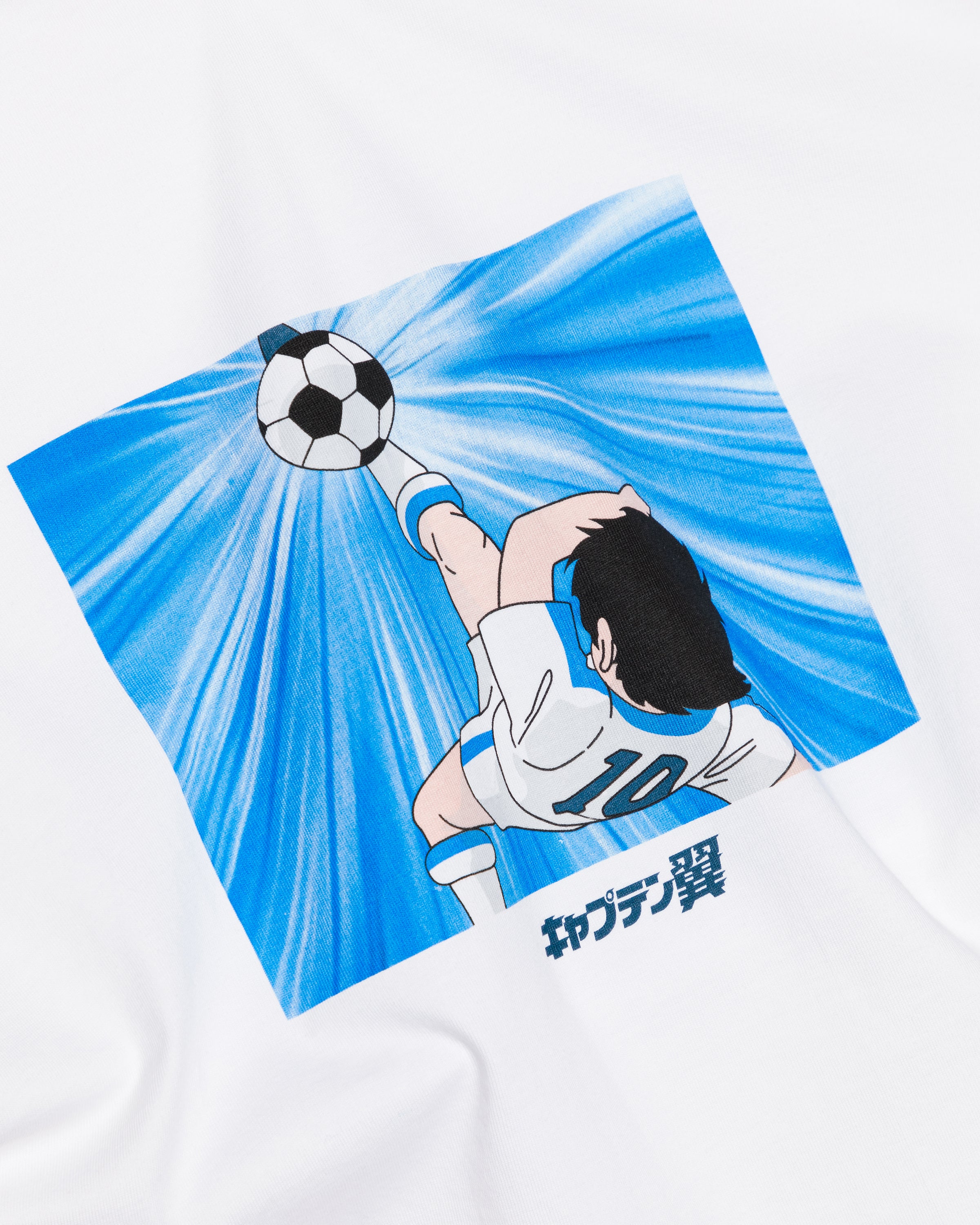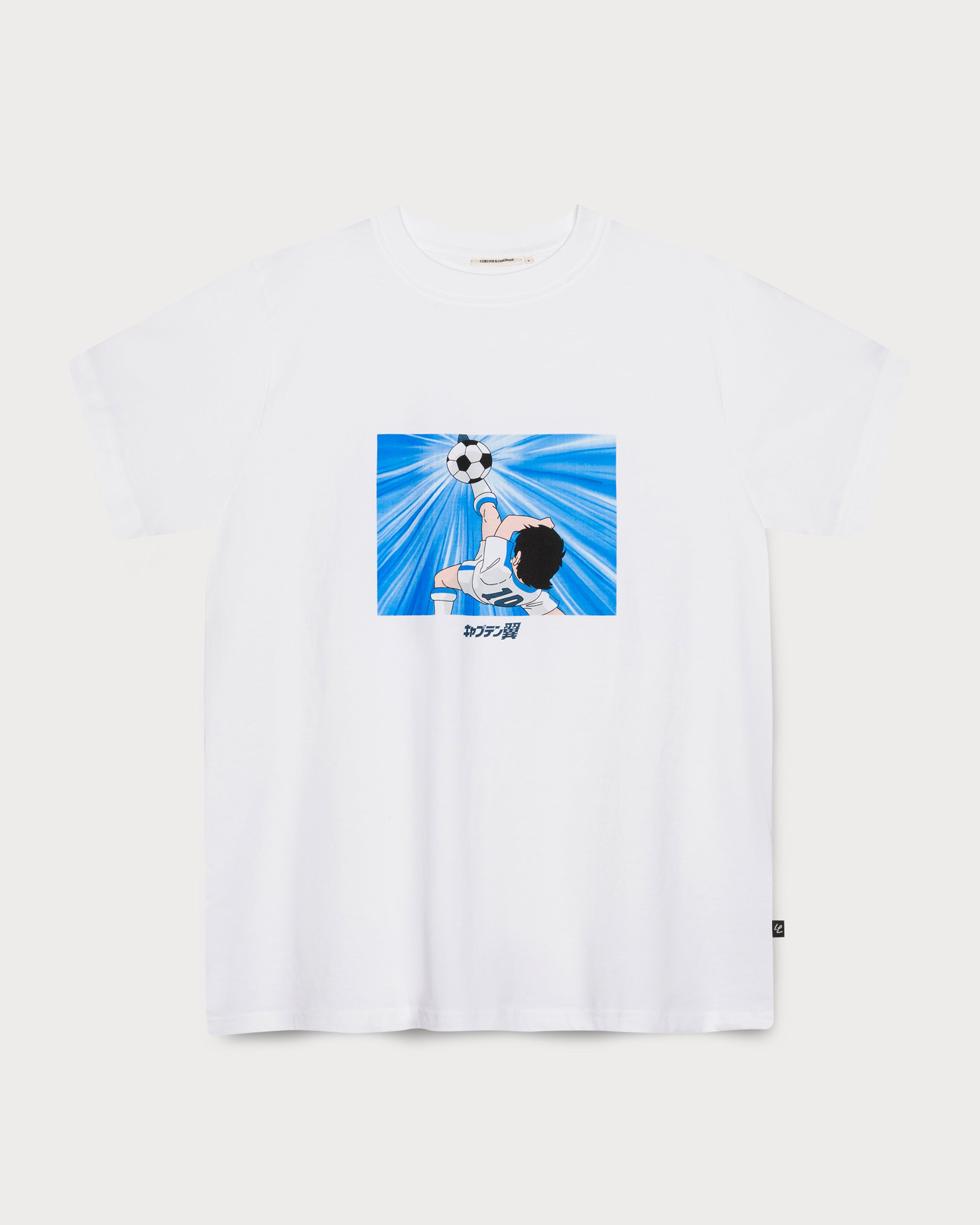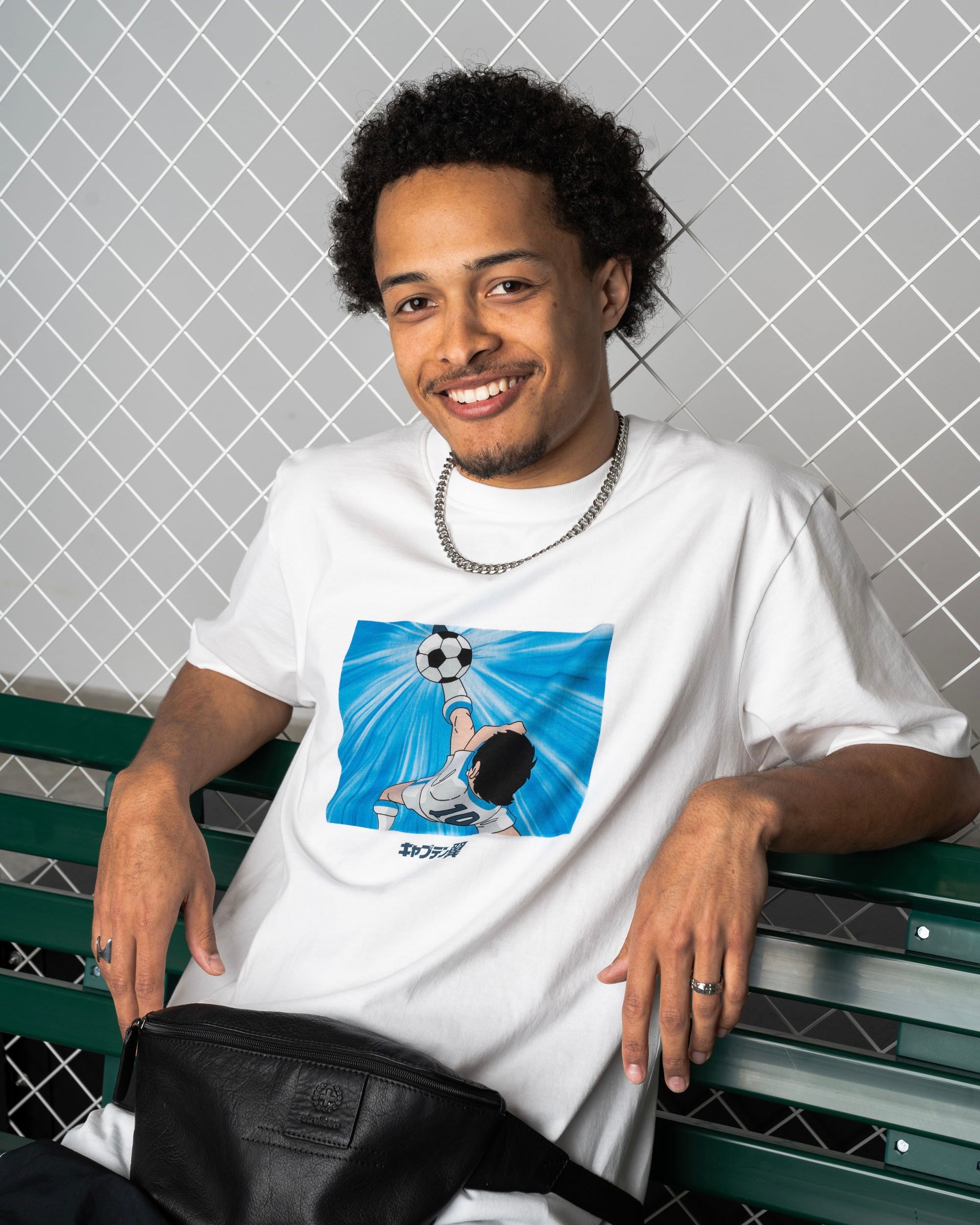 Le célèbre retourné acrobatique de Captain Tsubasa est imprimé en grand sur ce t-shirt blanc ample. La collection Captain Tsubasa s'inspire de la célèbre série animée de football. Maxwell mesure 1,80 m et porte une taille L.