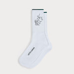 Cette chaussette de sport blanche arbore une bande bleu pétrole sur le revers. Le motif latéral tissé d'un datterich avec un verre à vin complète le design.