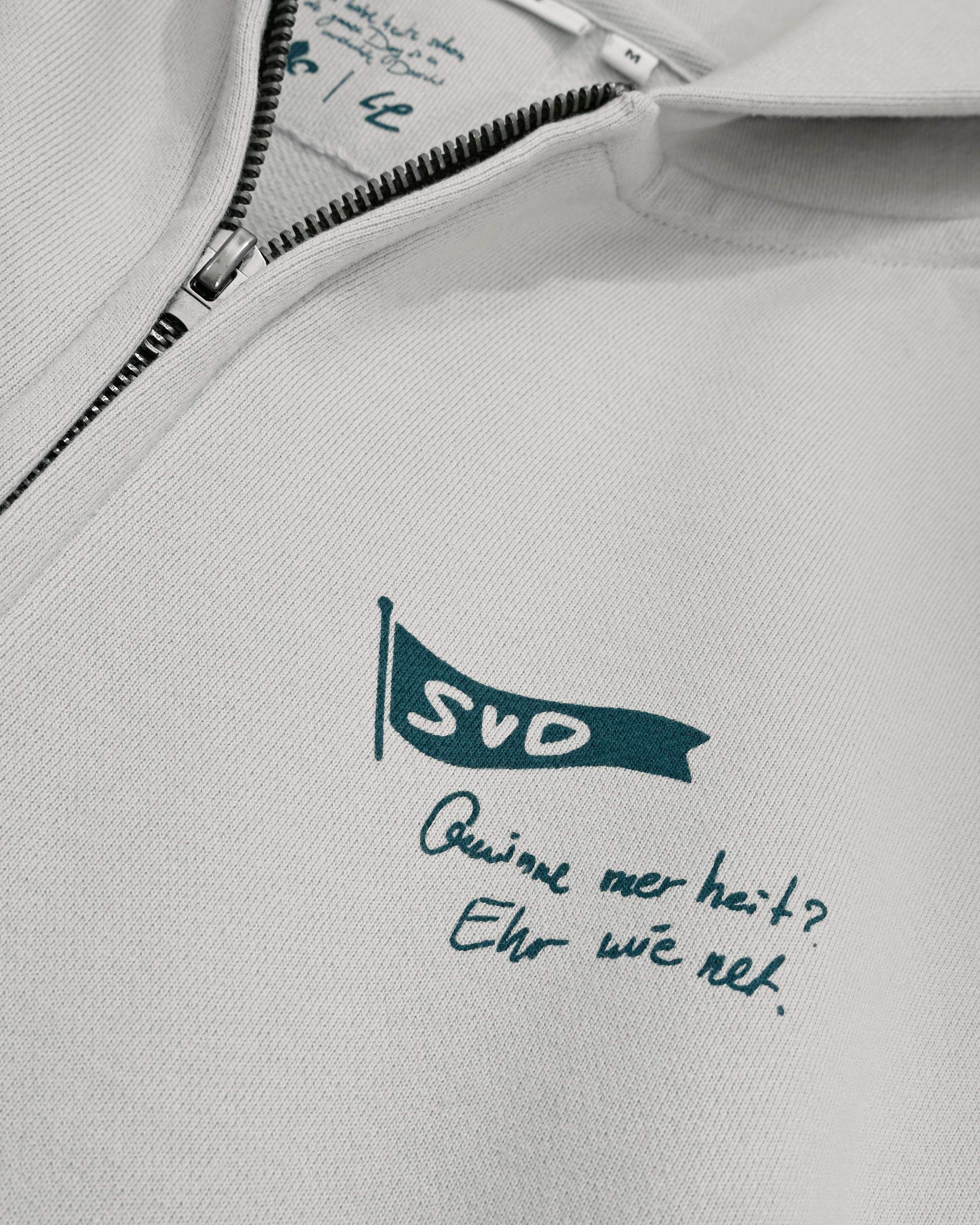Ce sweat à capuche zippé gris clair représente Datterich, figure culte de la Hesse, avec un verre à vin imprimé dans le dos couleur pétrole, accompagné de la devise : « Donner des coups de pied quand on a de l'argent, ce n'est pas de l'art ; donner des coups de pied quand on n'en a pas, c'est de l'art. » Sur la poitrine gauche, le sweat à capuche zippé est orné d'un imprimé du drapeau SVD et de la question : « On gagne aujourd'hui ? Franchement, qu'en pensez-vous ? »