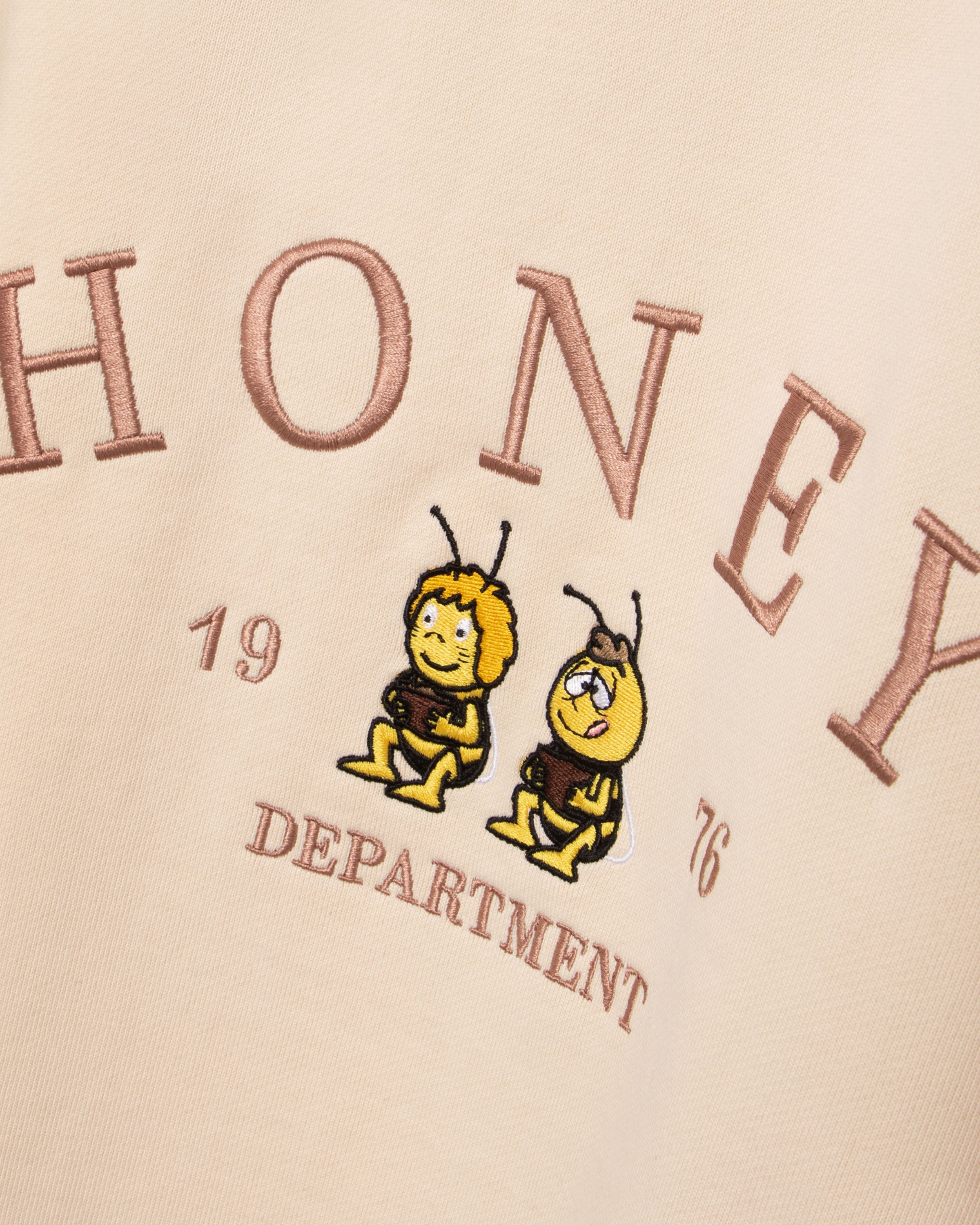 La grande broderie sur le devant de ce pull beige représente Maya l'abeille et Willy avec des pots de miel et l'inscription « HONEY DEPARTMENT 1976 ». Inspiré du style universitaire typique, ce motif capture le style vintage classique.