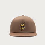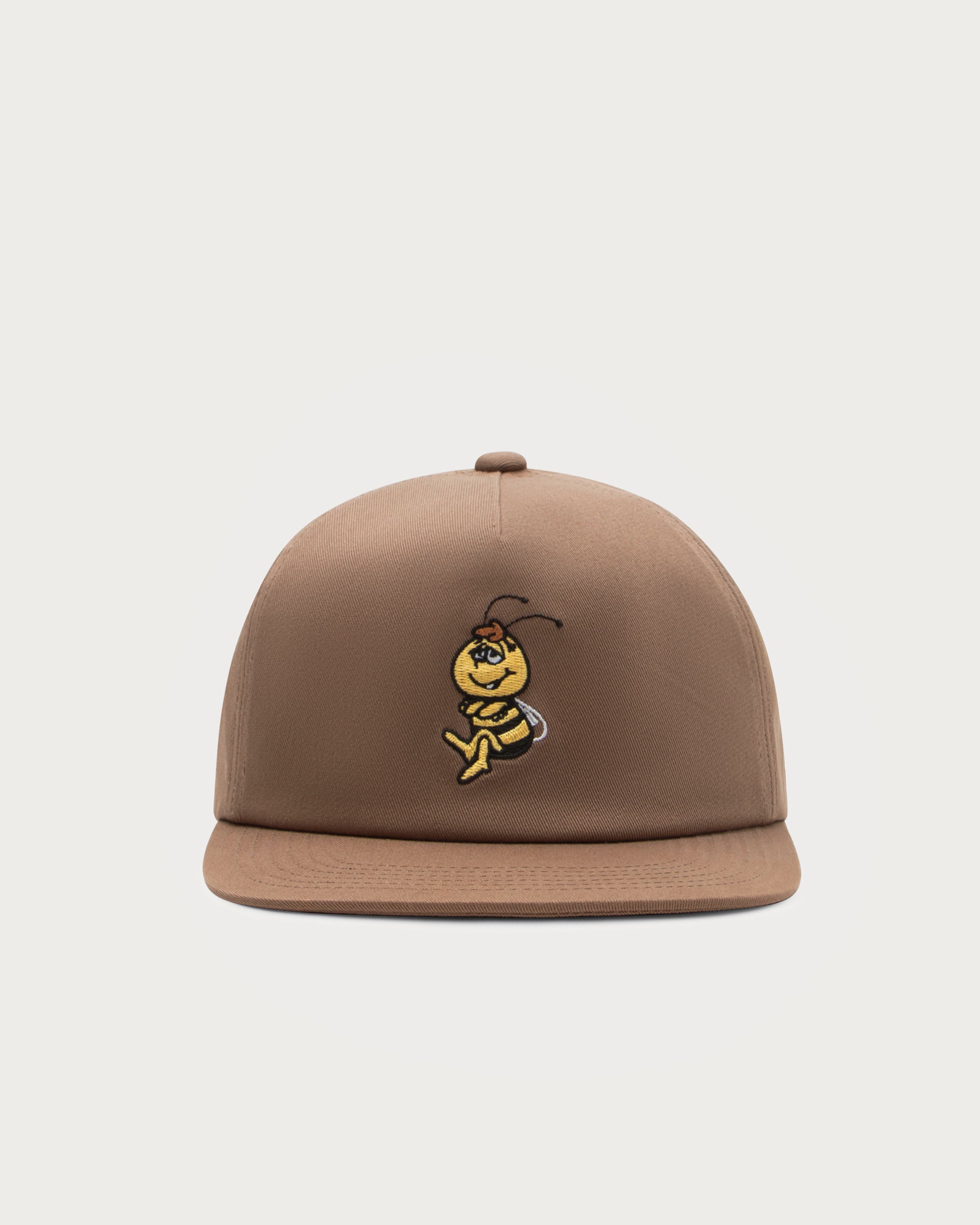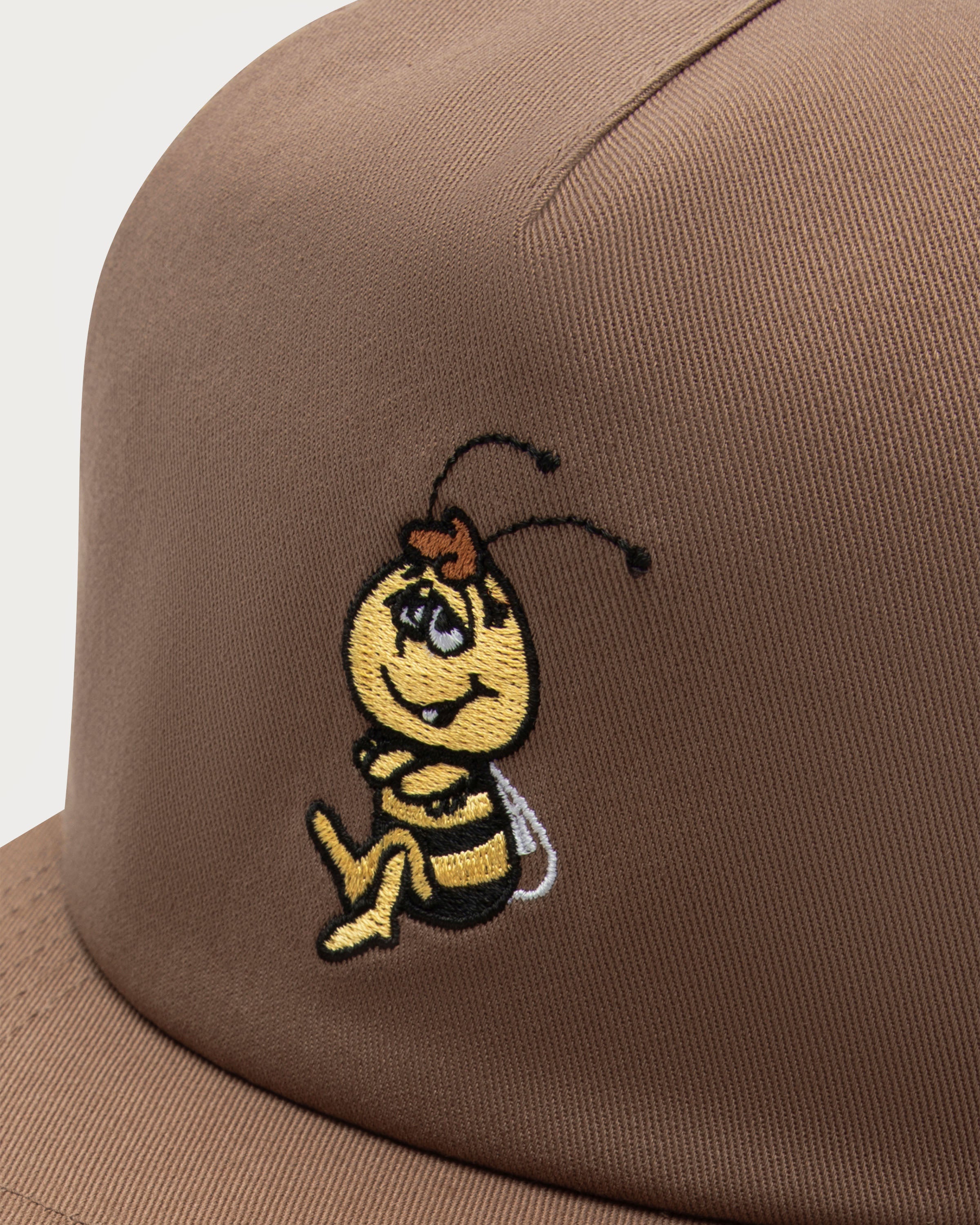 L'avant de la casquette marron montre Willi dans une pose confiante, les bras croisés et un regard calme.