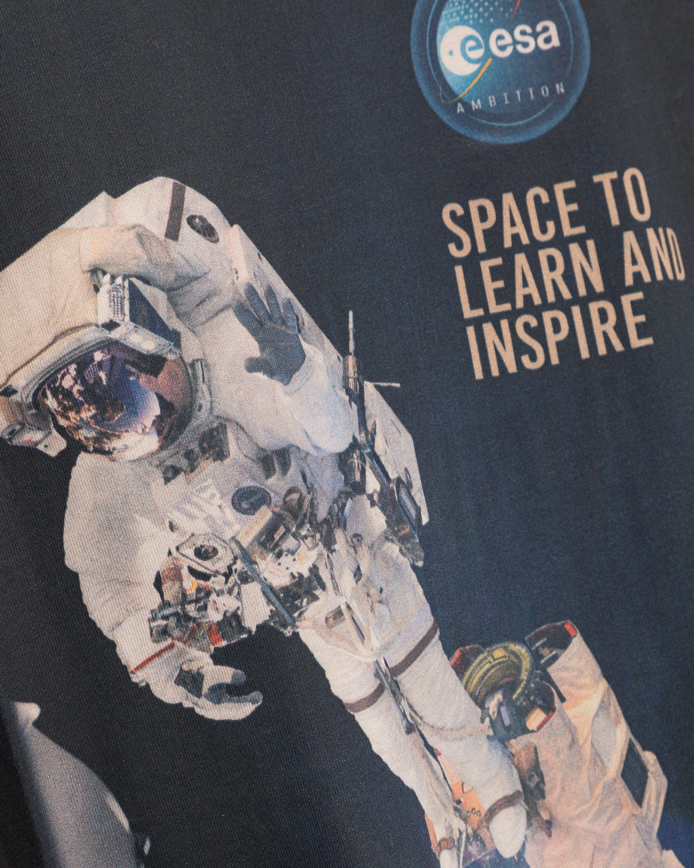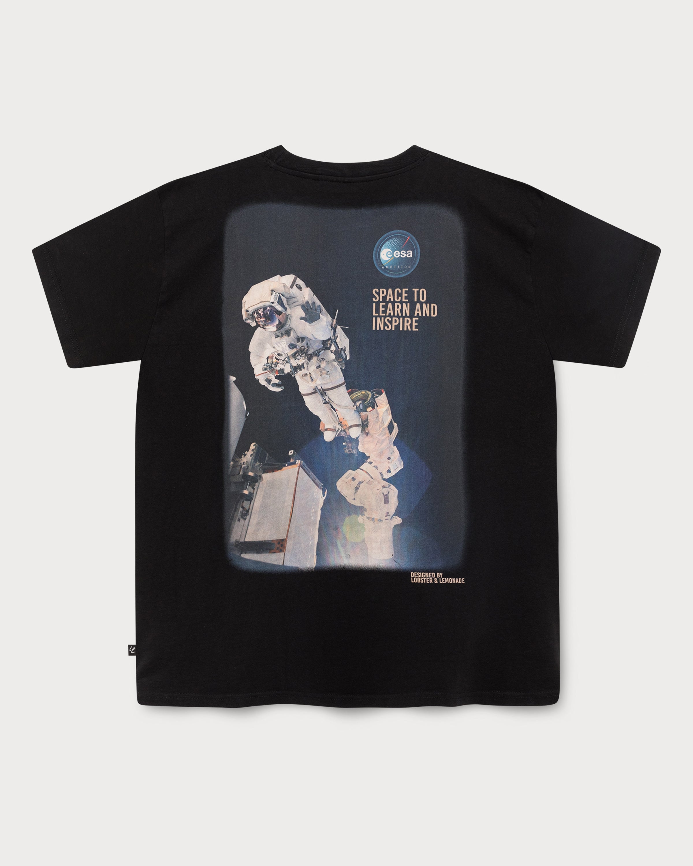Ce t-shirt noir teint en pièce arbore une généreuse photo d'astronaute imprimée au dos. Le slogan « Space to learn and inspire » complète le design, tandis que l'imprimé réfléchissant sur le côté gauche de la poitrine apporte une touche d'originalité.