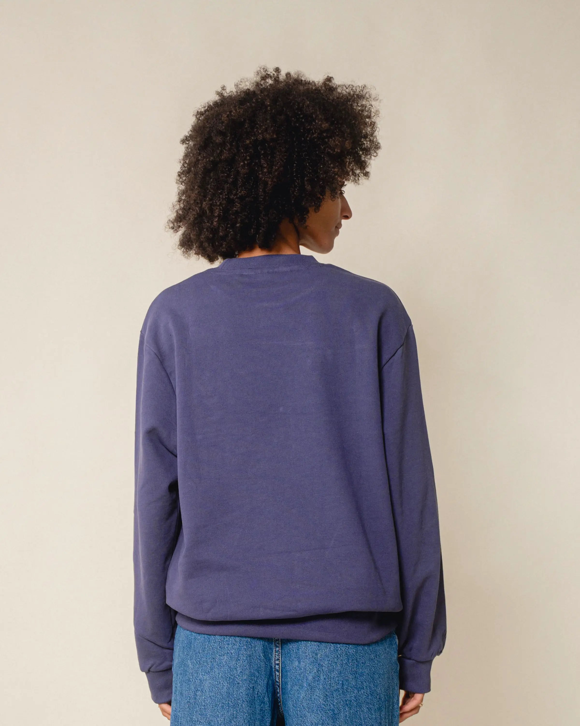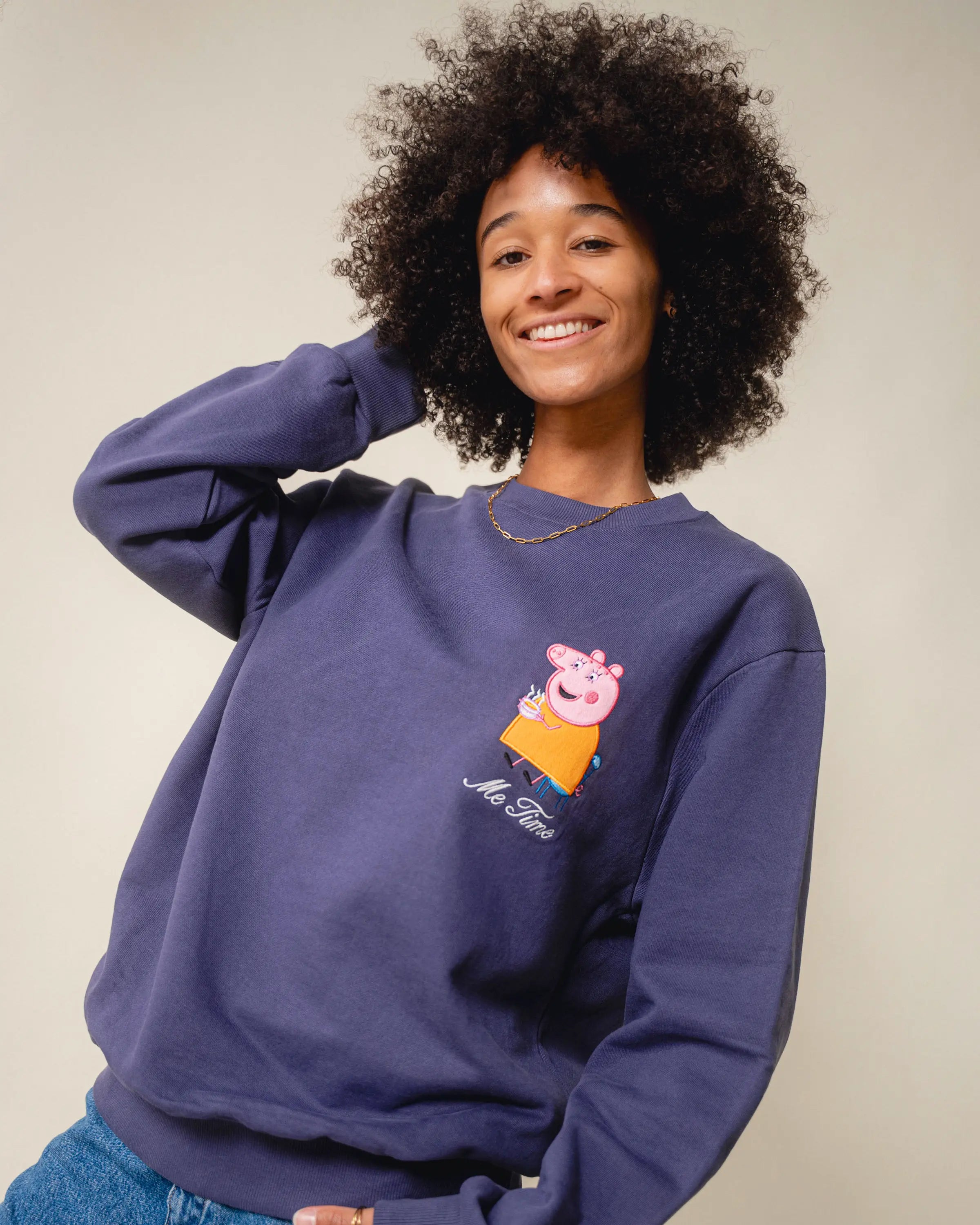 Ce pull bleu marine arbore une délicate broderie de Mama Wutz sur le côté gauche de la poitrine. Le motif est complété par l'inscription « Me Time ».