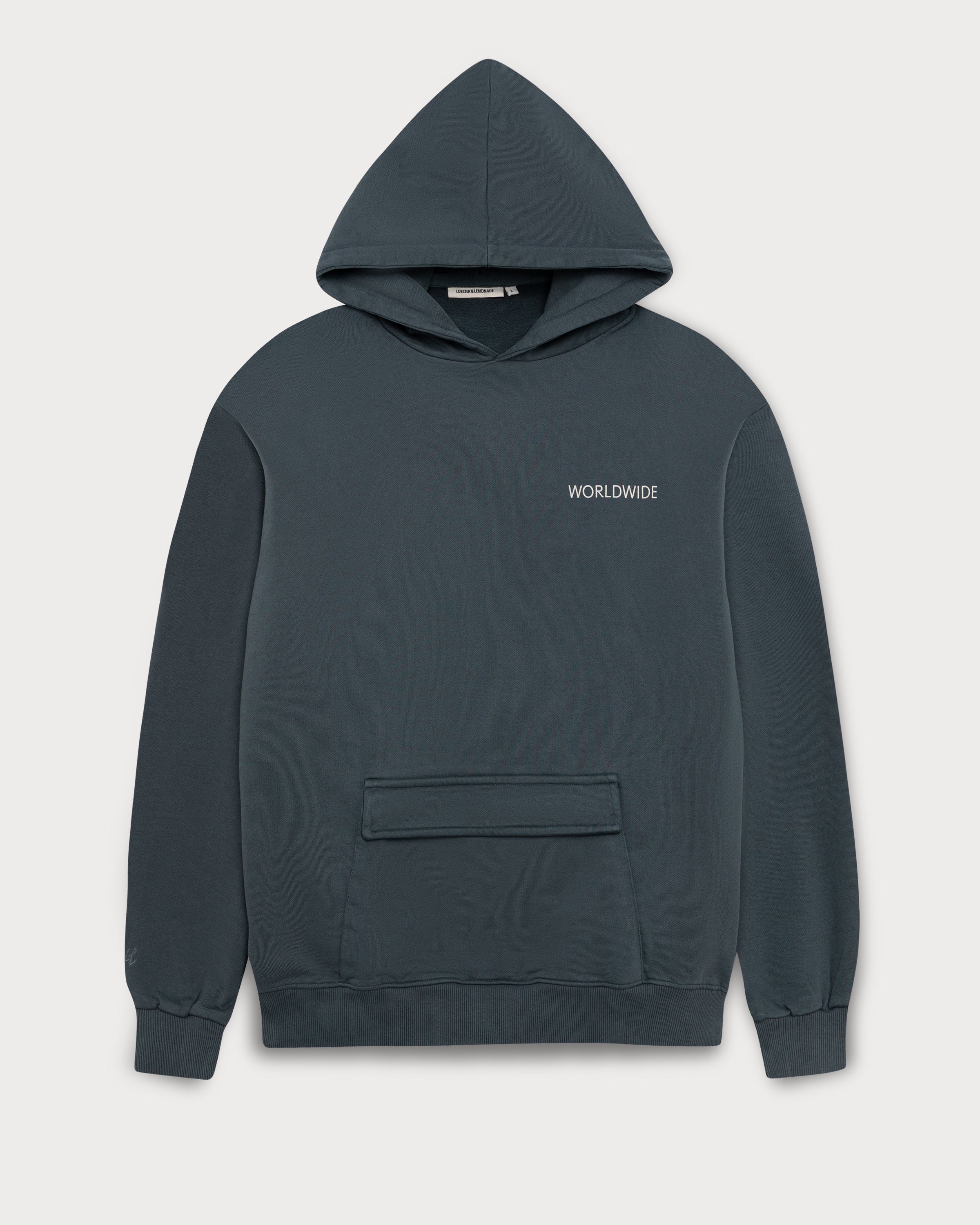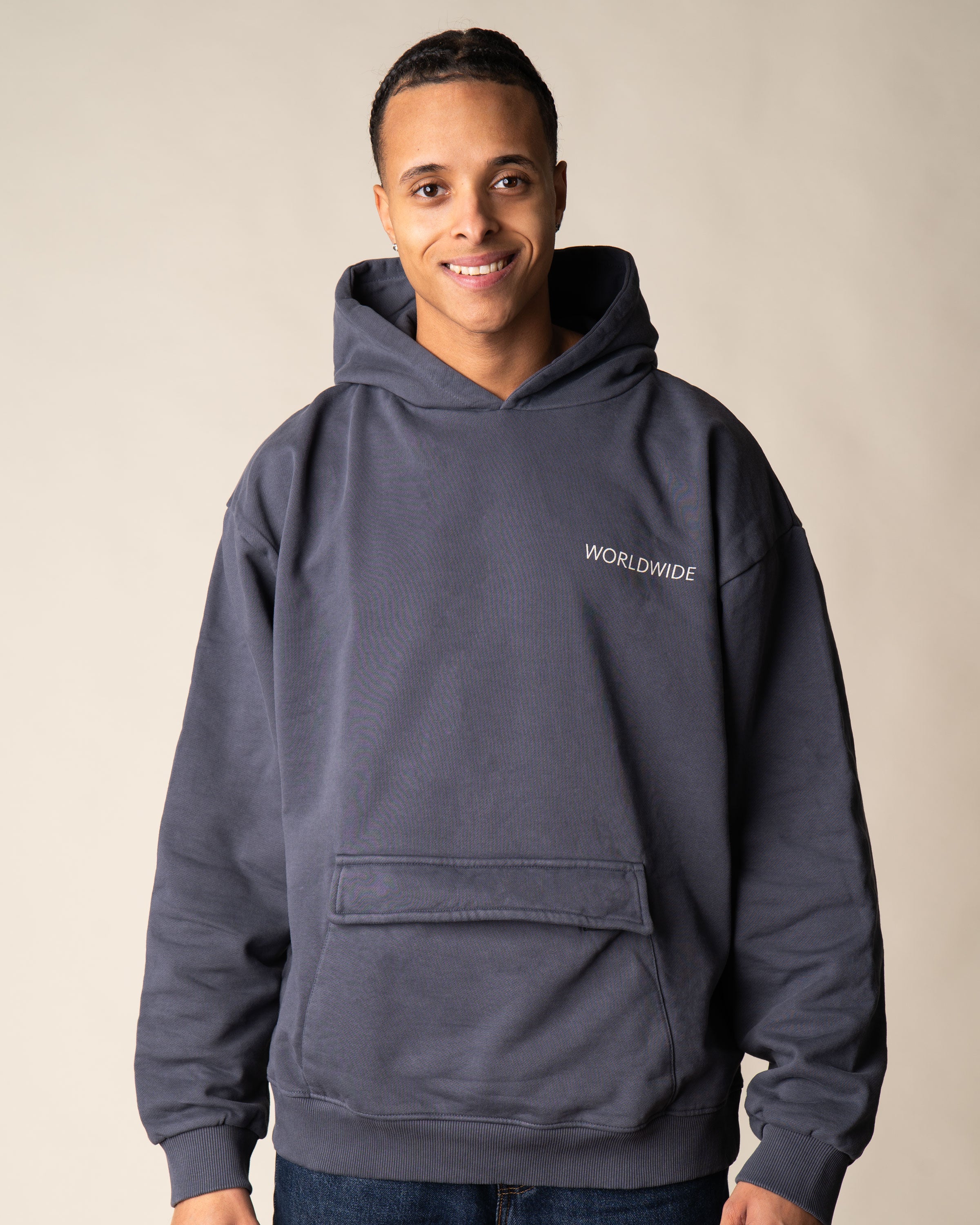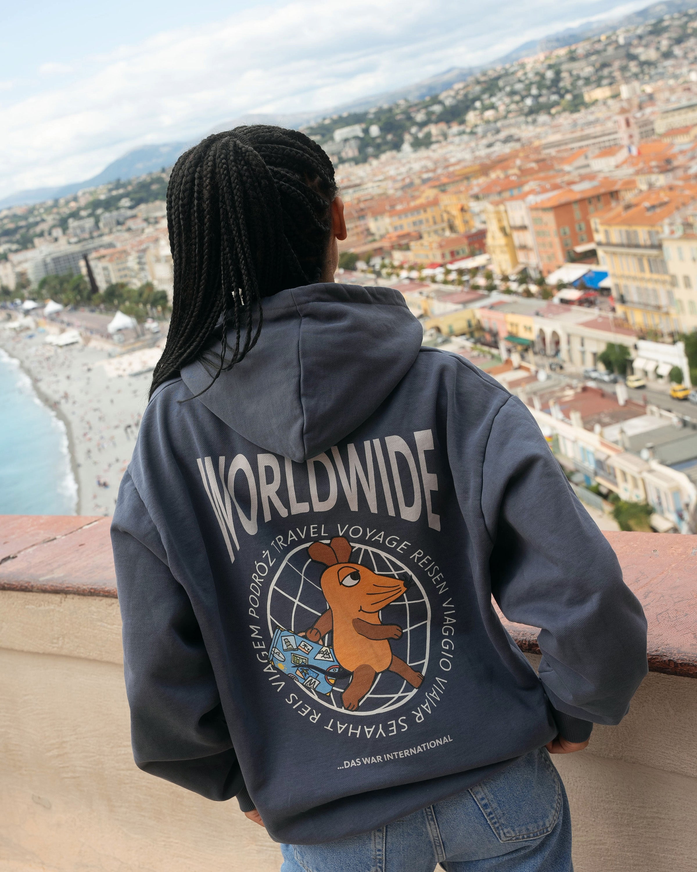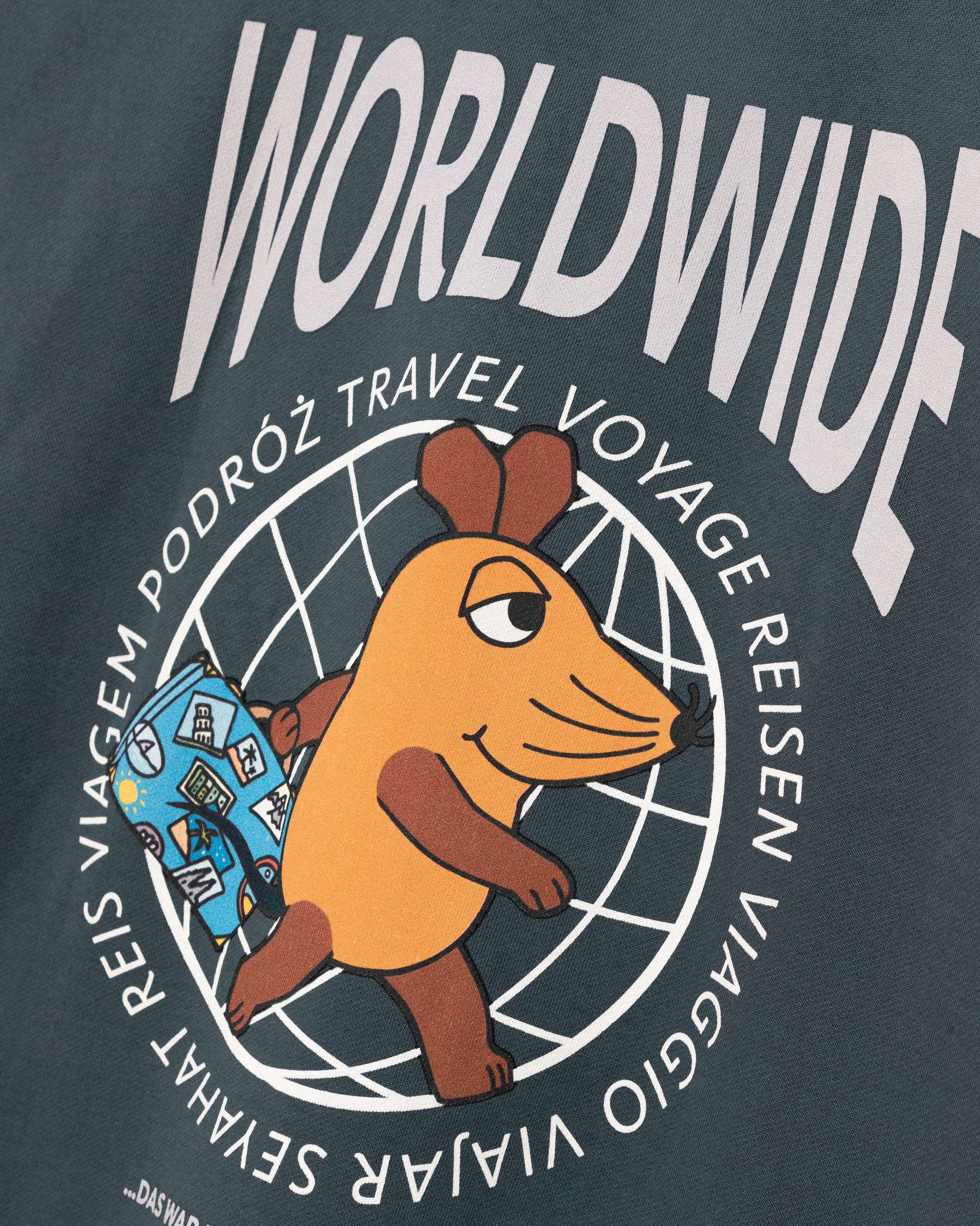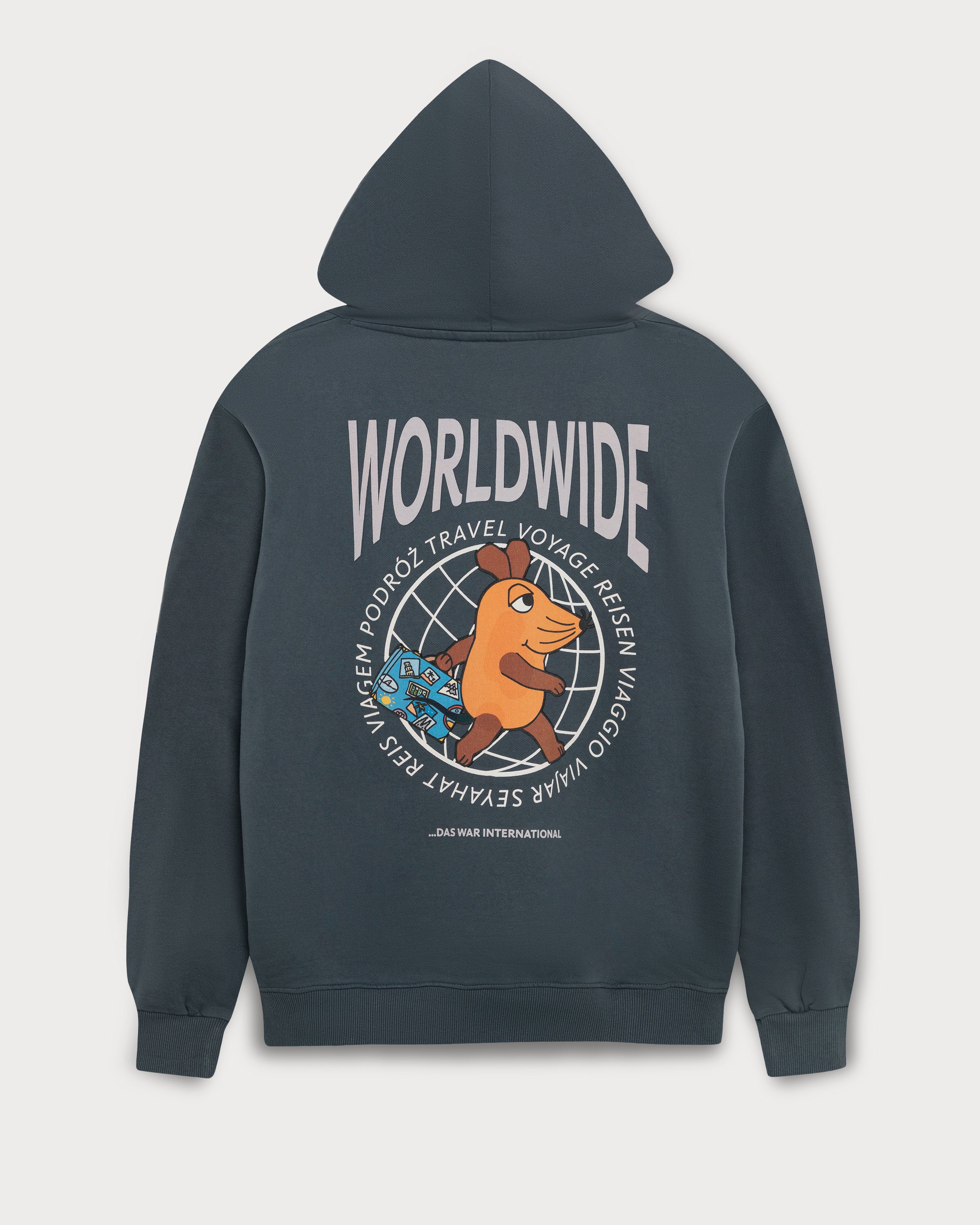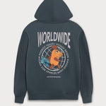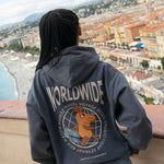 Le généreux imprimé au dos de ce sweat à capuche bleu marine délavé représente une souris voyageuse devant un globe. L'inscription « Worldwide » sur la poitrine gauche apporte une touche subtile. Grâce à la poche kangourou à fermeture velcro, tout reste bien rangé, même en déplacement.