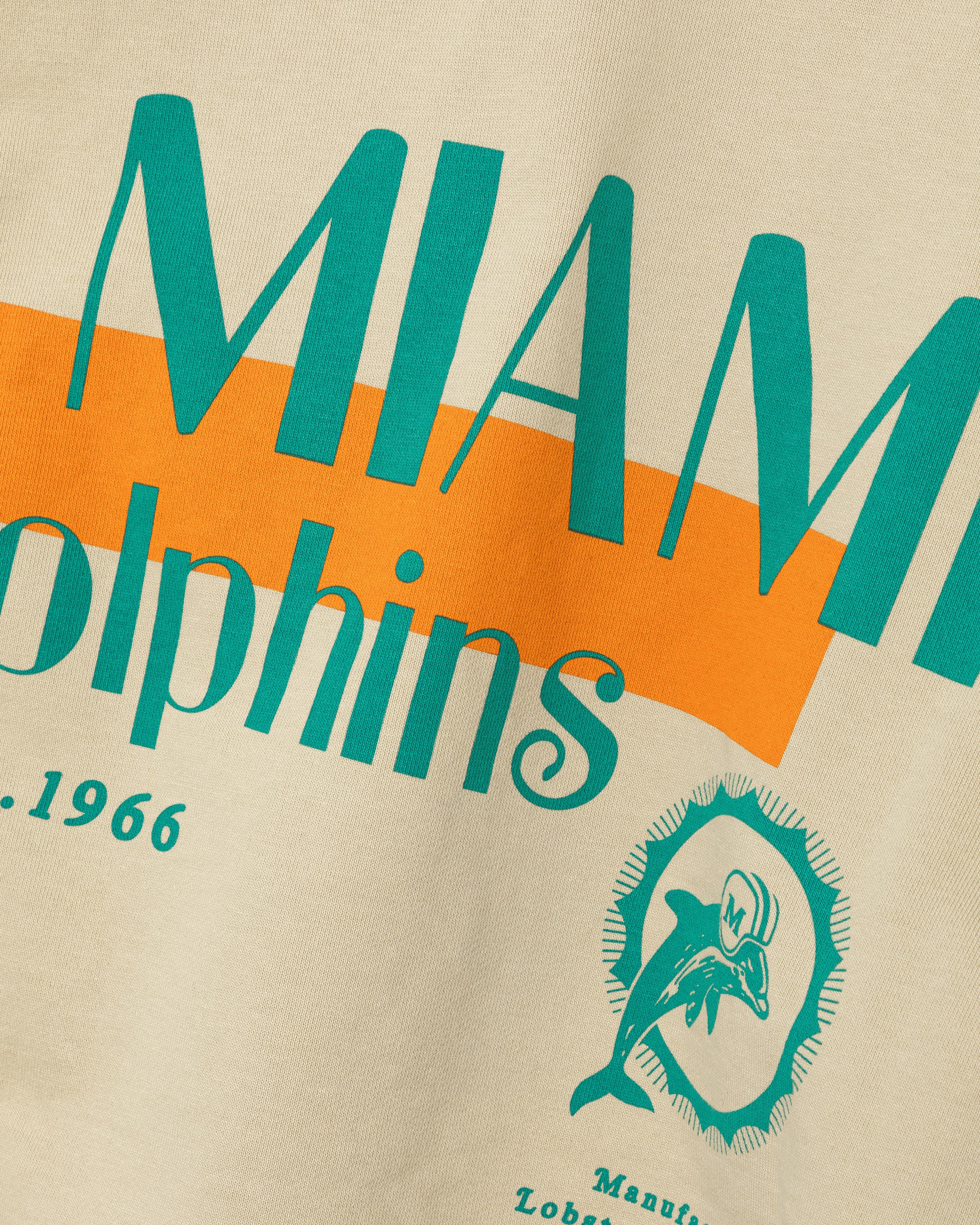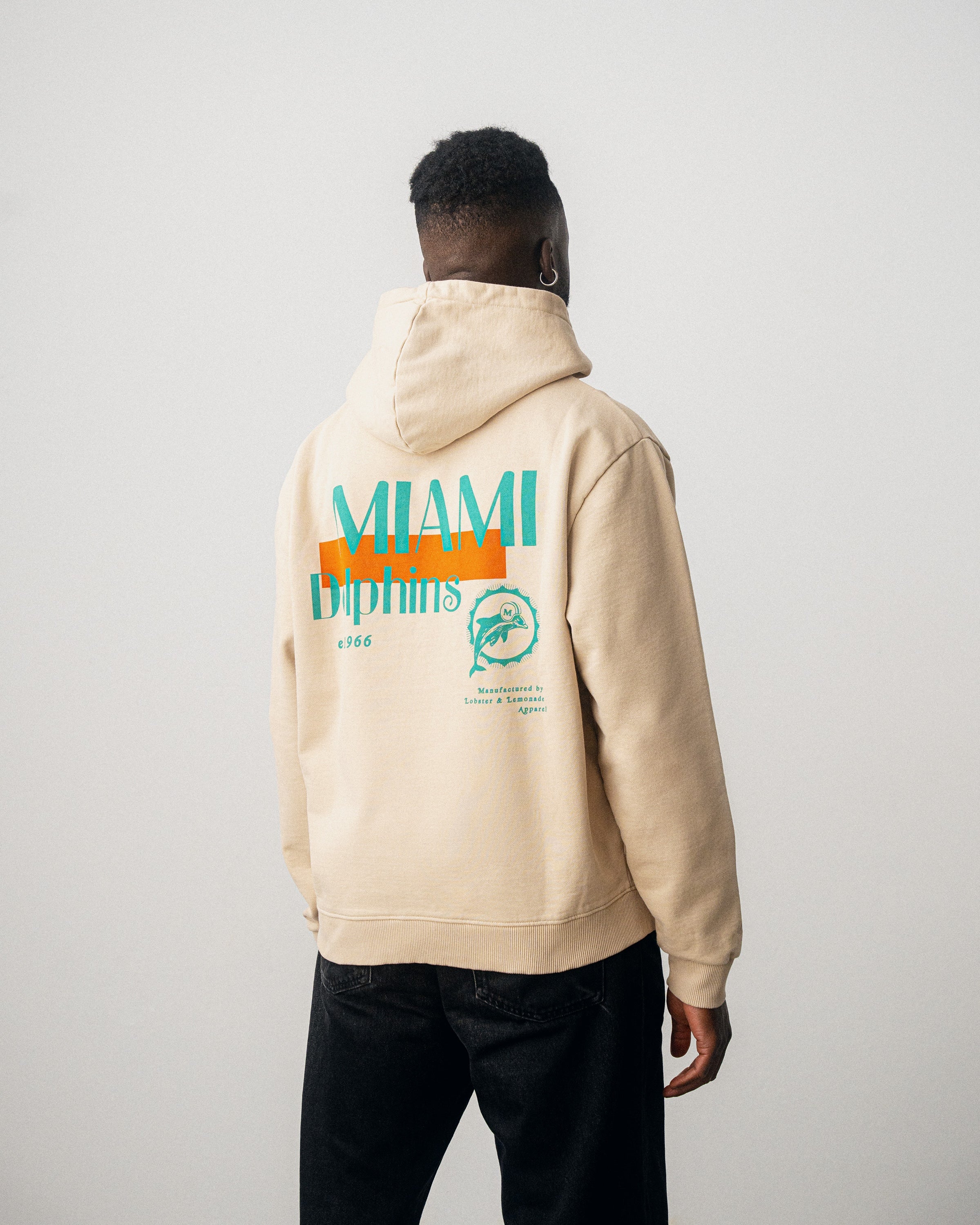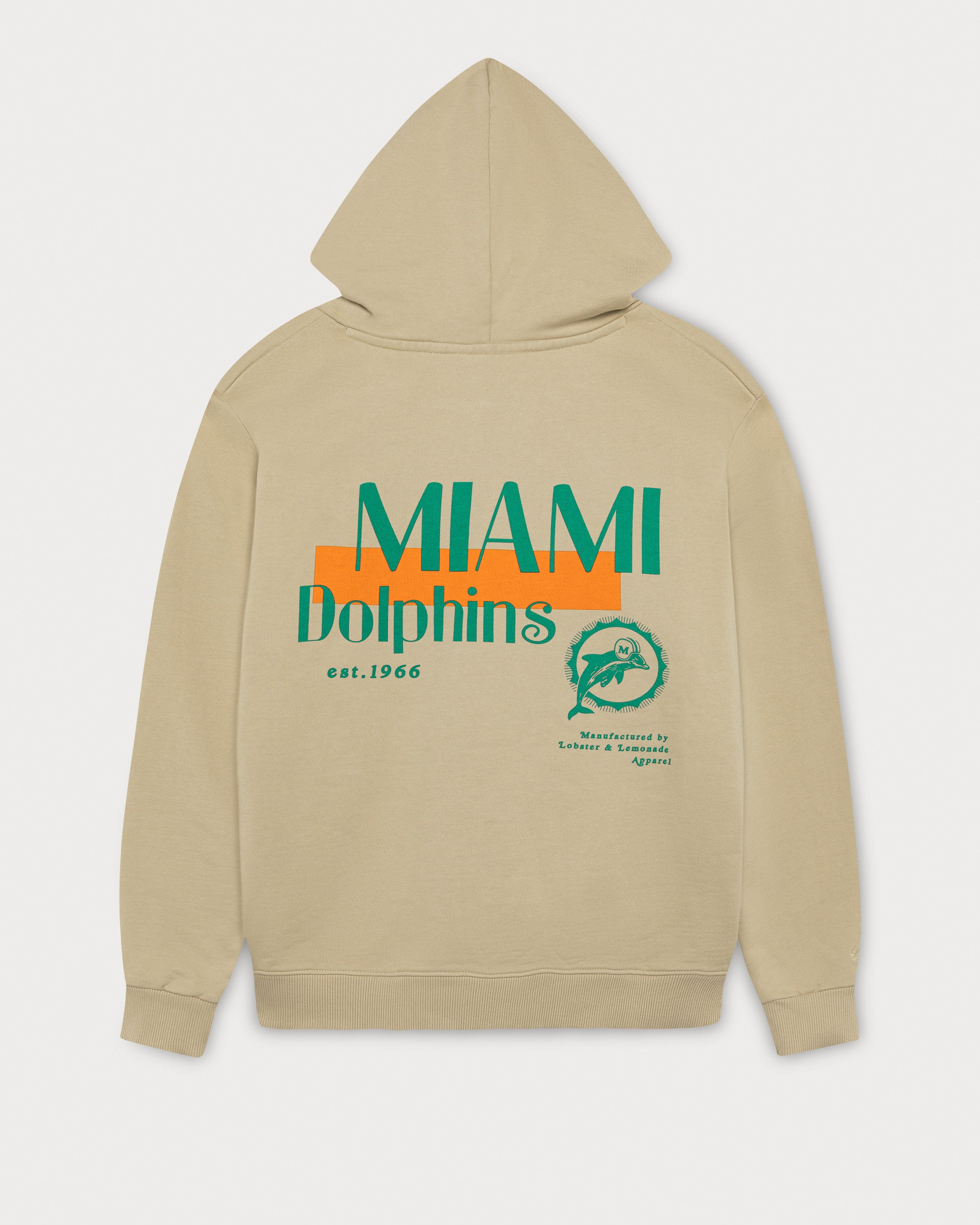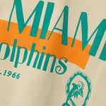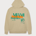 Ce sweat à capuche beige arbore le motif classique des Dolphins en vert au dos. Le logo minimaliste des Dolphins sur la poitrine gauche et l'étiquette tissée en toile à la taille complètent son look rétro.